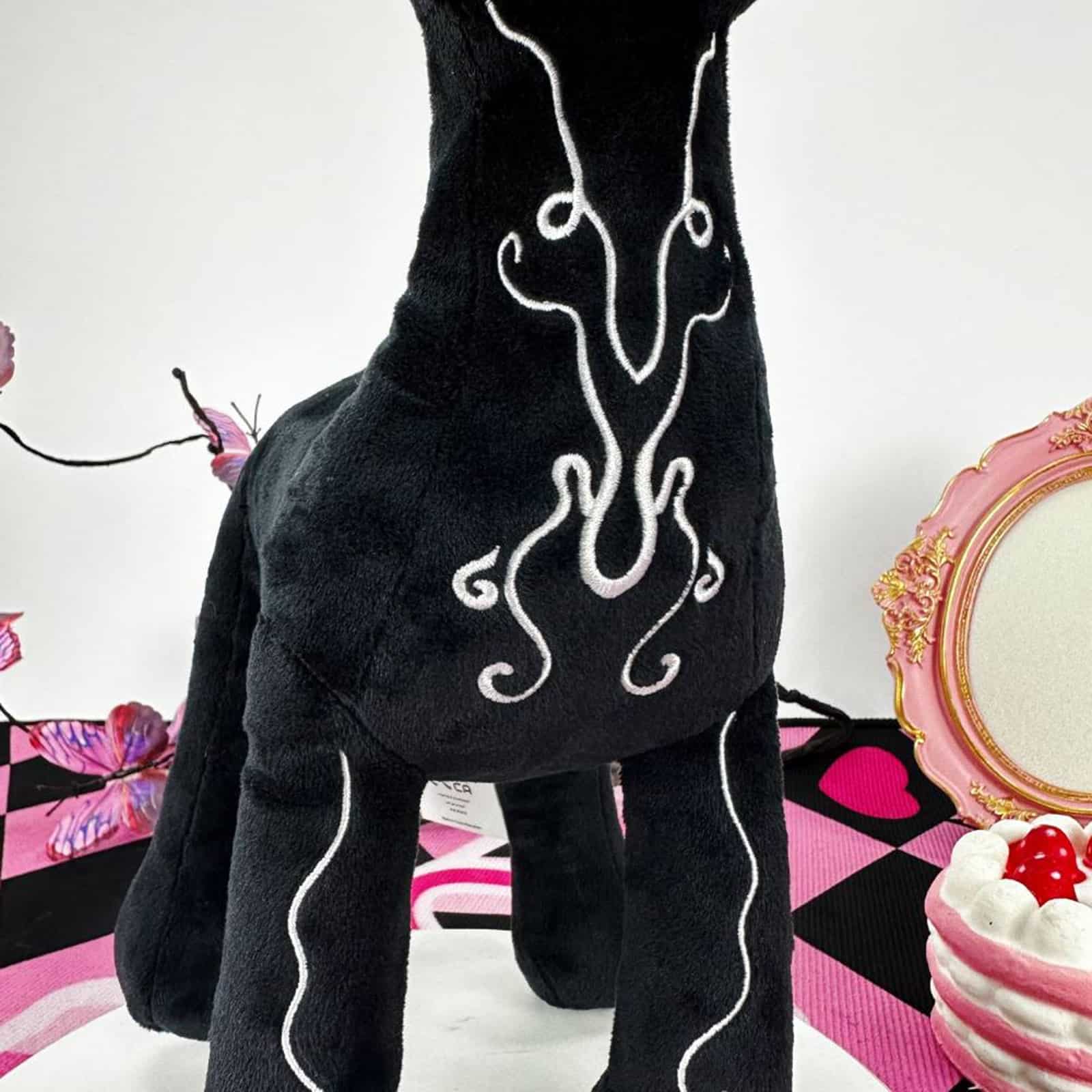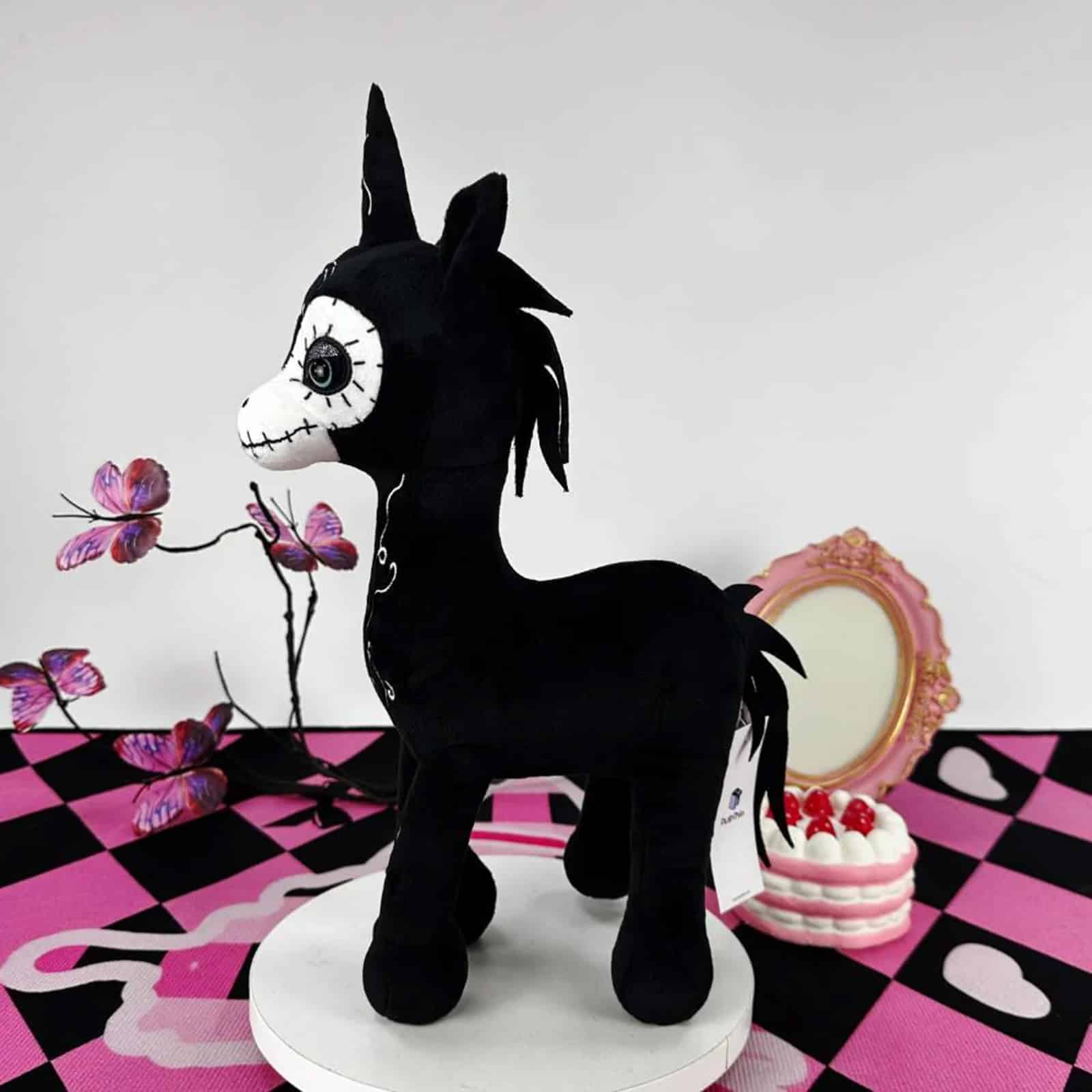 Dieses außergewöhnliche Gothic-Plüschtier in Form eines schwarzen Einhorns verbindet düstere Eleganz mit geheimnisvollem Charme. Der Körper ist mit weißen Ornamentstickereien verziert, die an skelettartige Muster erinnern, während das lange Horn und die markanten Augen den mystischen Look unterstreichen. Das glatte Minky-Material macht das Einhorn angenehm weich und kuschelig, zugleich bleibt es ein echter Blickfang als Sammlerstück oder dekoratives Highlight.