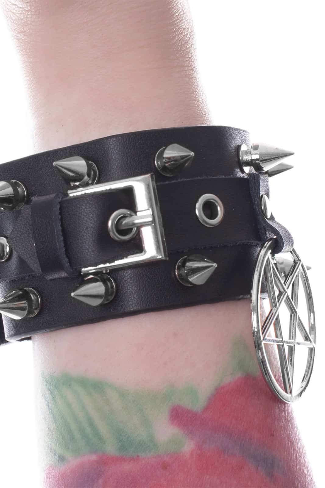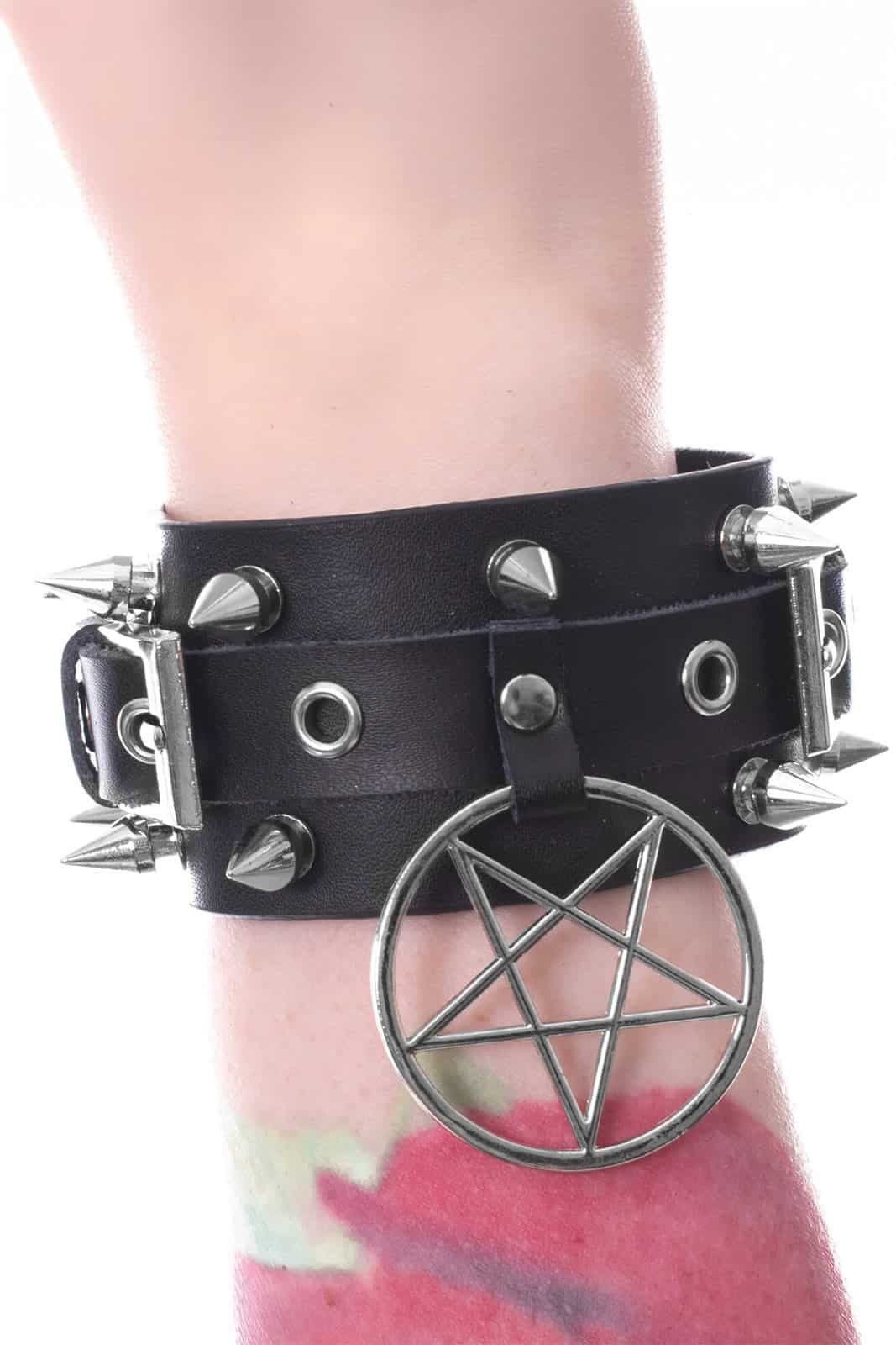 Dieses Armband vereint Rebellion und Stil in einem markanten Design. Hergestellt aus schwarzem Kunstleder mit silberfarbenen Metallnieten und spitzen Ziernieten, zieht es alle Blicke auf sich. Ein großes Pentagramm-Anhänger betont den okkulten Charakter des Accessoires und macht es zum perfekten Statement für Gothic- und Metal-Looks. Dank der Druckknopfreihen lässt sich die Weite individuell anpassen.