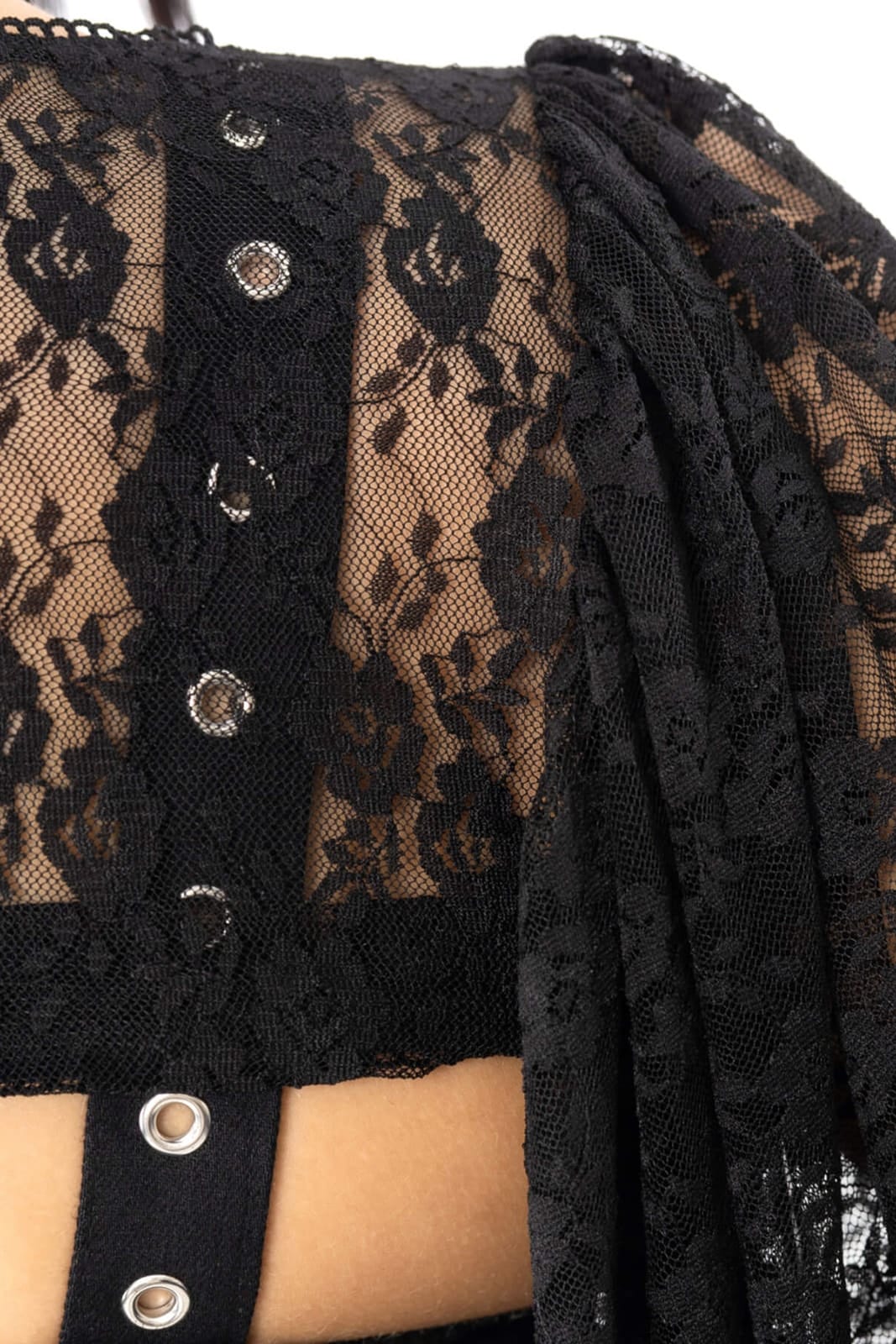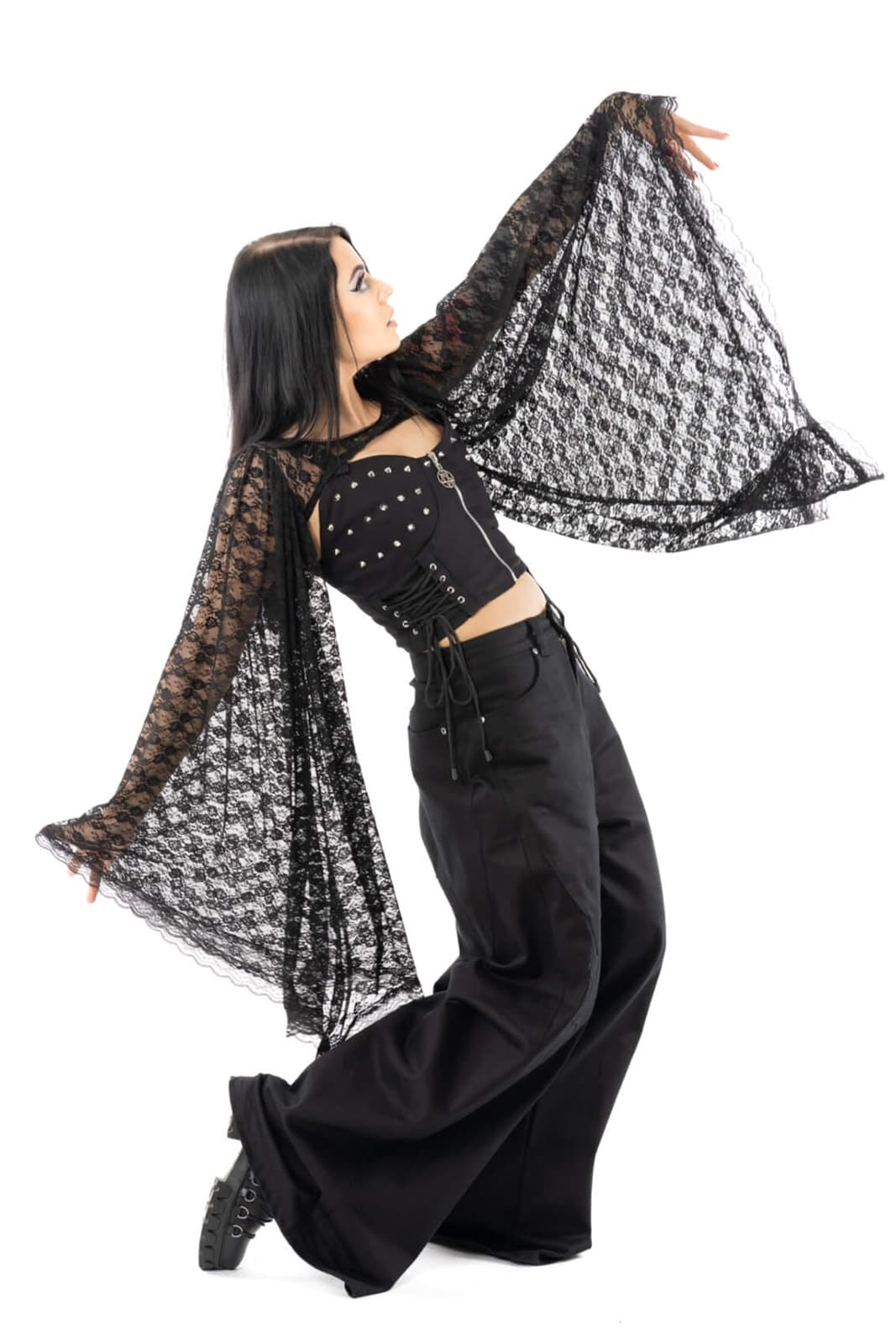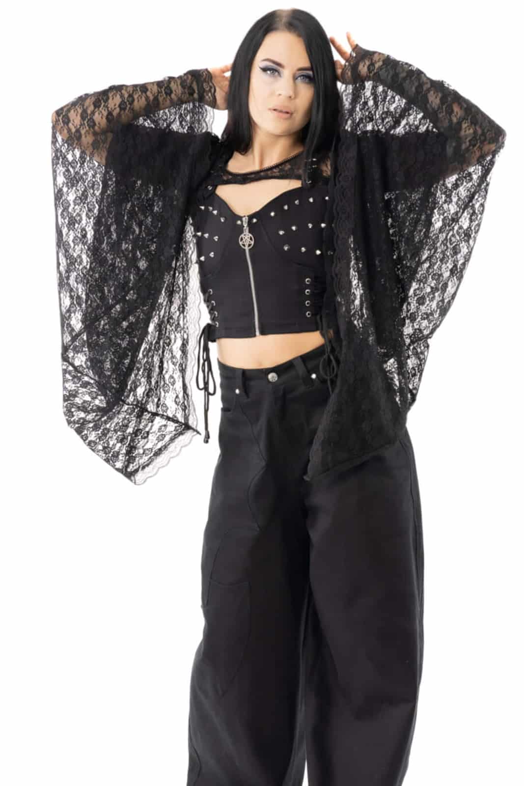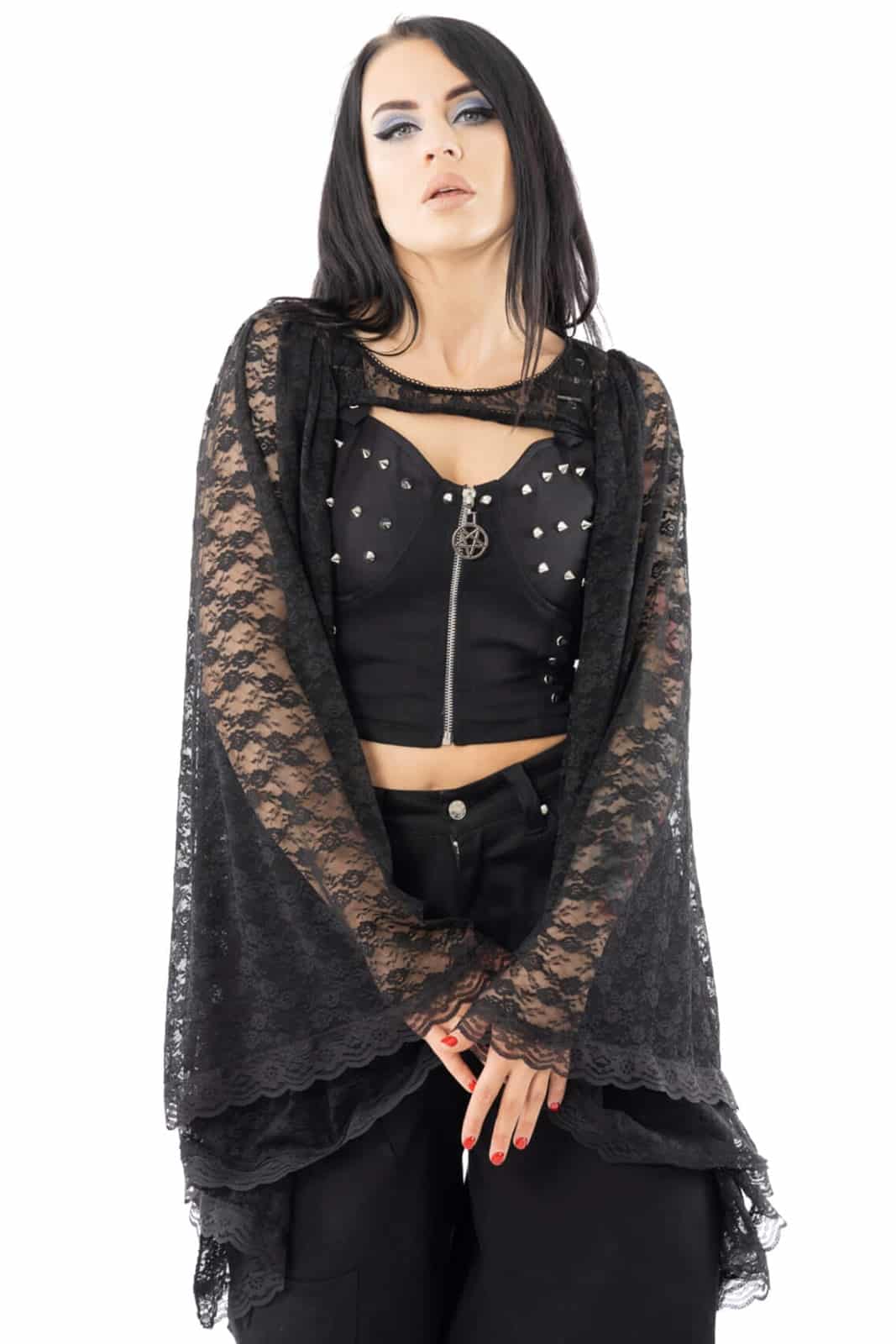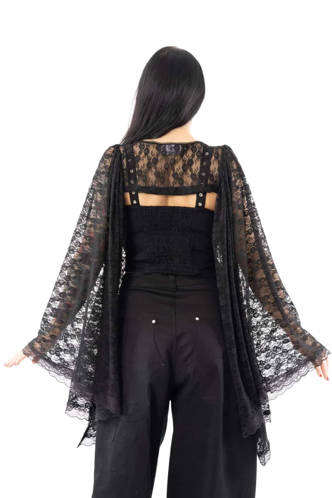 Ein Hauch von Romantik trifft auf dunkle Eleganz: Dieses zarte Spitzen-Cape verleiht jedem Outfit eine geheimnisvolle Aura. Die weit geschnittenen, fließenden Ärmel sorgen für dramatische Bewegungen, während das florale Muster der Spitze edle Akzente setzt. Offen getragen, umschmeichelt es die Silhouette und lässt sich ideal mit figurbetonten Tops oder Korsetts kombinieren. Die strukturierte Schulterpartie mit Metallösen rundet das Design mit einem subtilen Hauch Industrial-Charme ab – perfekt für individuelle Looks zwischen Gothic, Festival und Abendgarderobe.