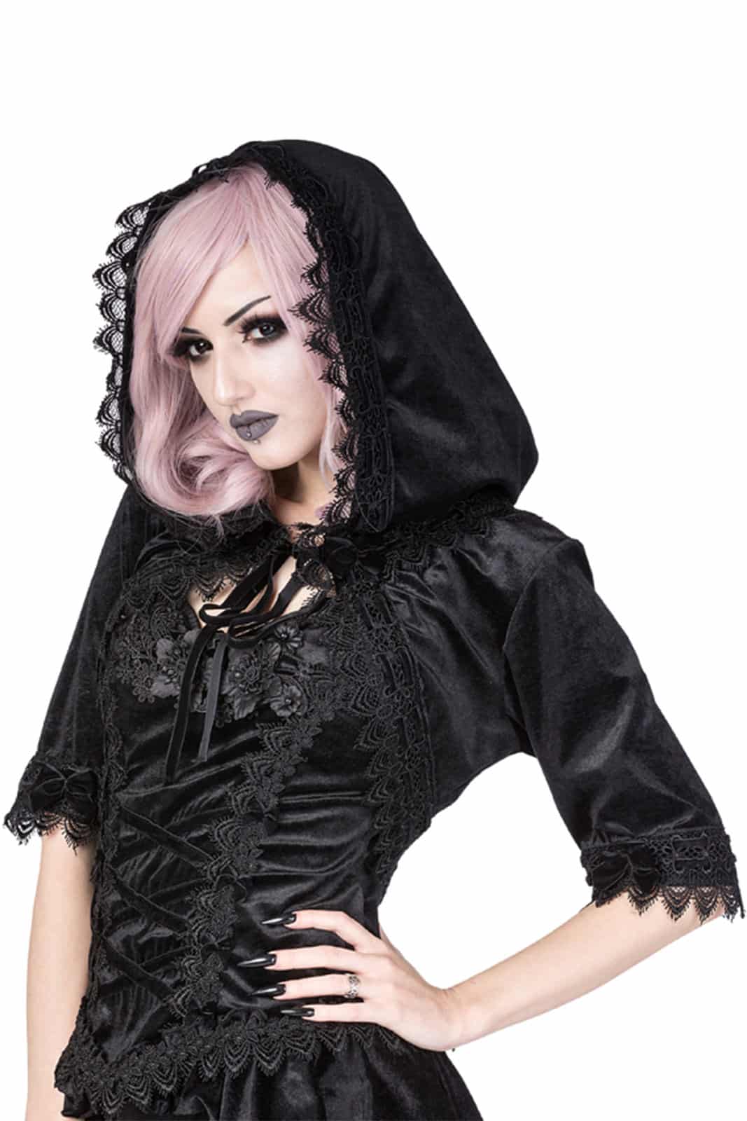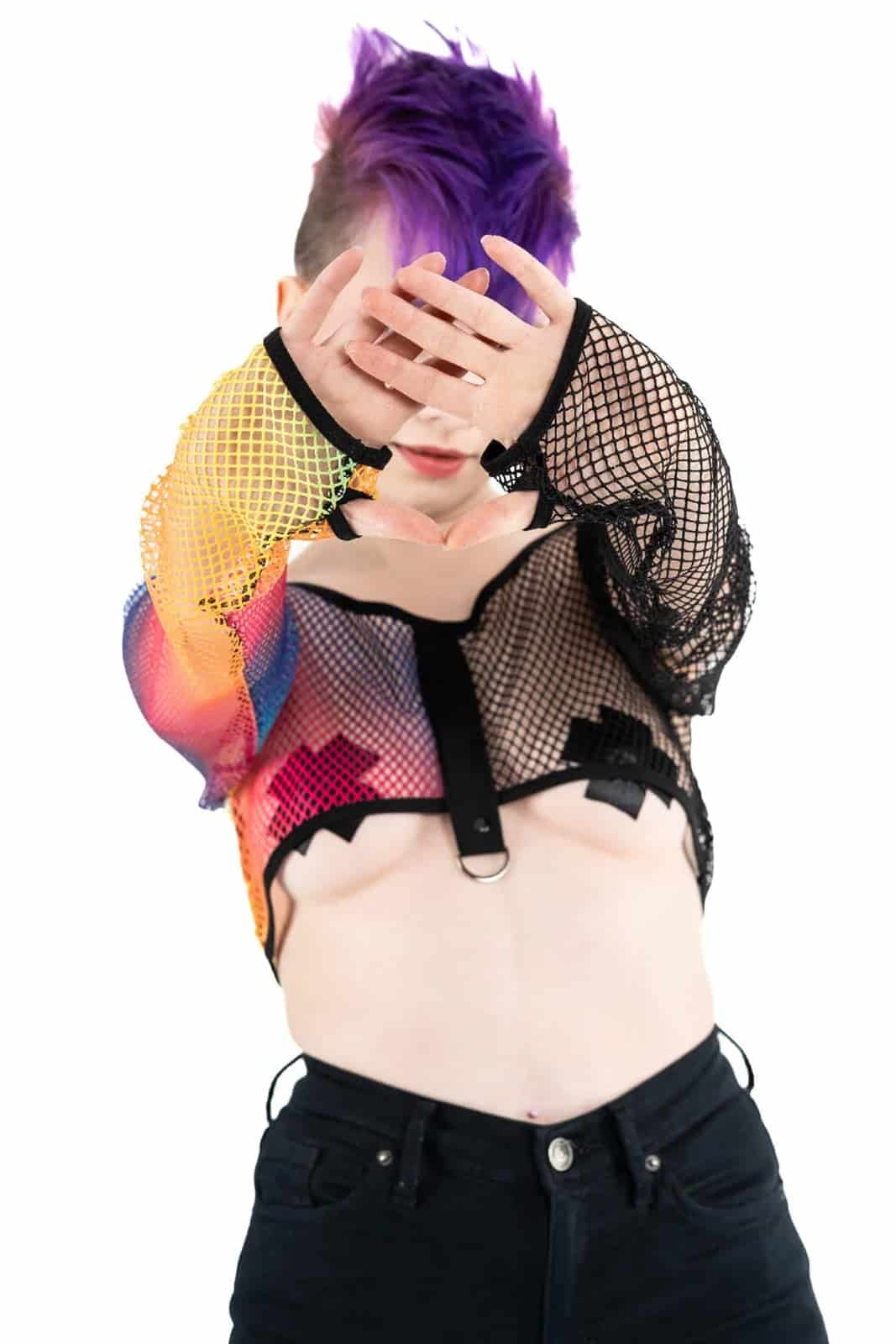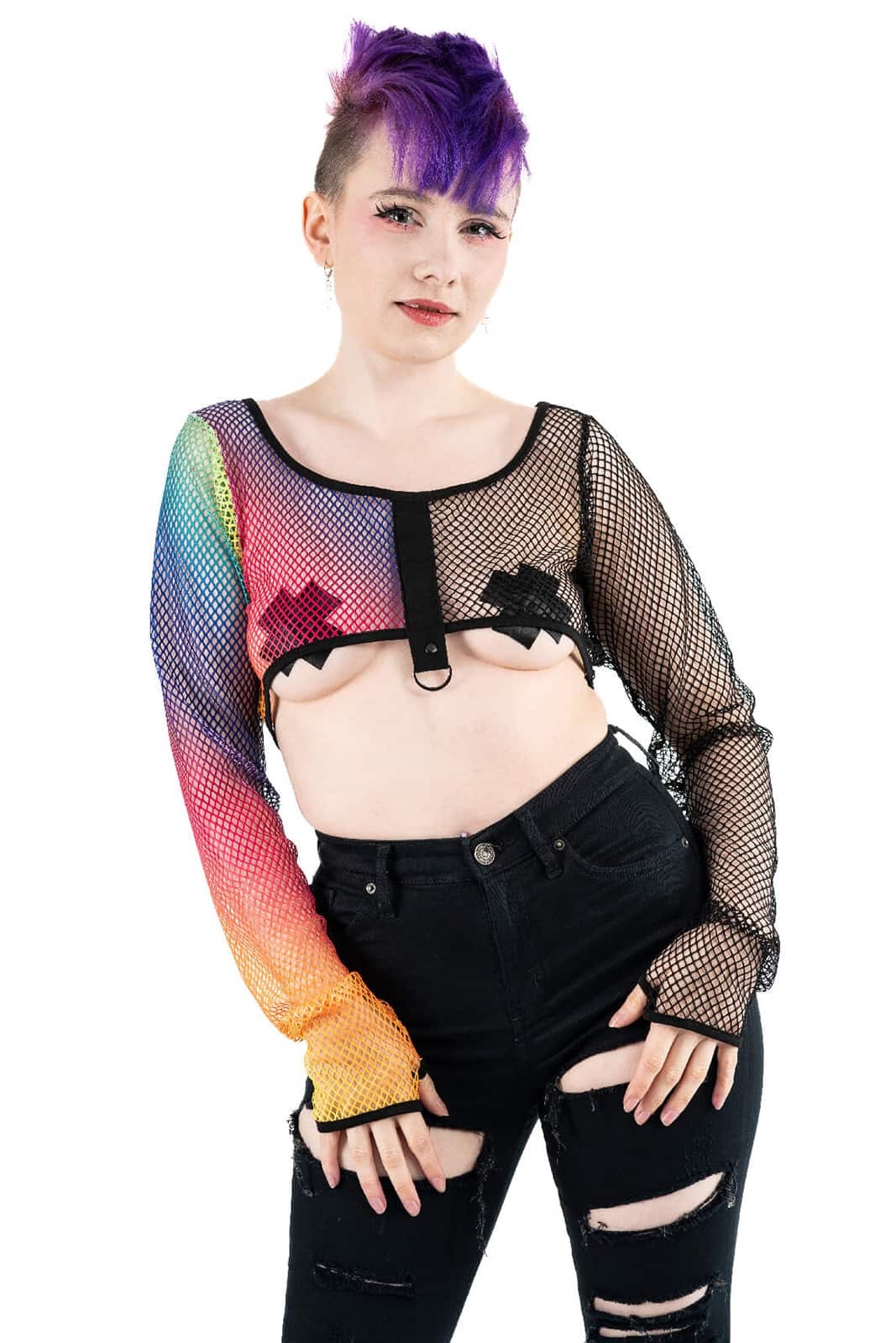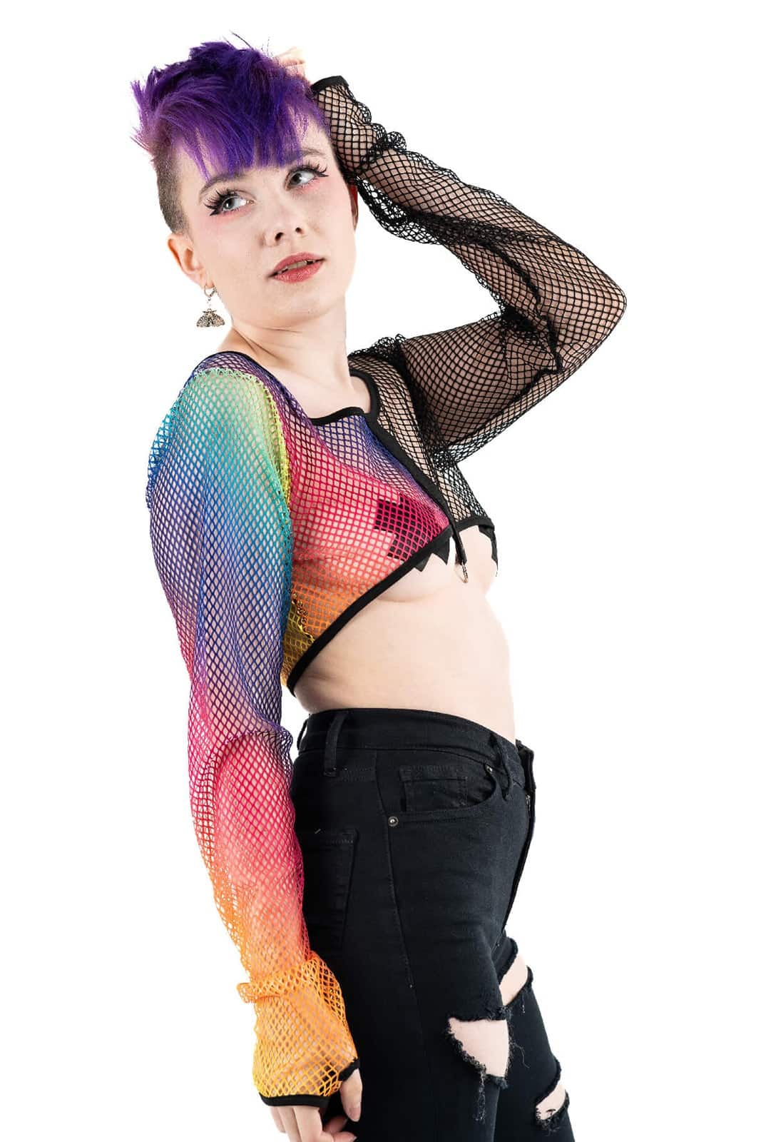 Gothic-Bolero aus feinem Netzmaterial in zweigeteilter Optik. Während die eine Seite in tiefem schwarz beeindruckt, fasziniert die andere Seite in ihren Regenbogenfarben.