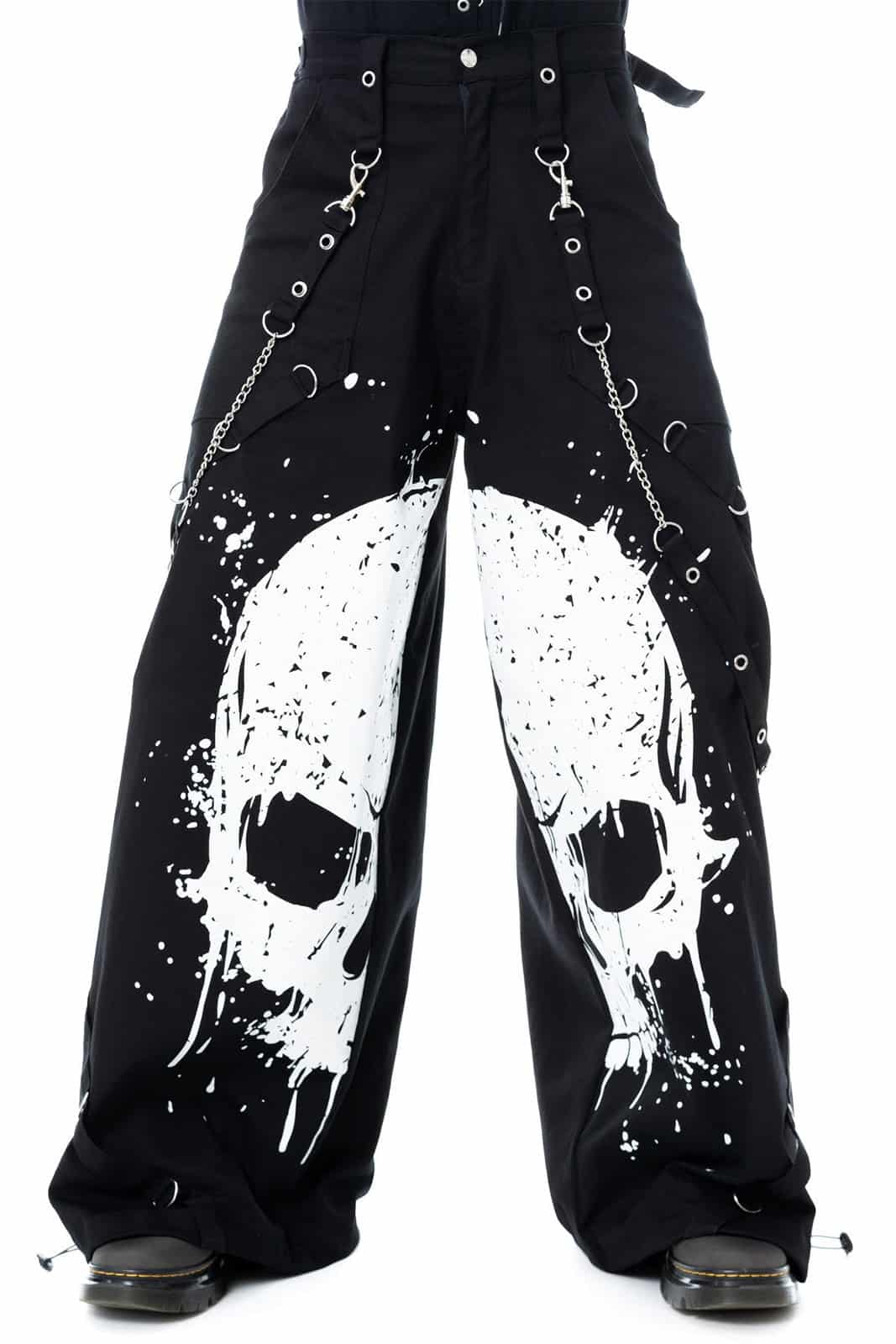 Eine kompromisslose Statement-Hose im Industrial- und Dark-Streetwear-Stil. Der markante Skull-Print auf den Beinen trifft auf eine schwere, robuste Baumwollqualität und wird durch Harness-Gurte, Metallösen und Kettenelemente ergänzt. Der weite Schnitt sorgt für Tragekomfort, während die vielen Details der Hose ihren rauen, rebellischen Charakter verleihen – perfekt für auffällige Alternative-, Gothic- und Techwear-Looks.