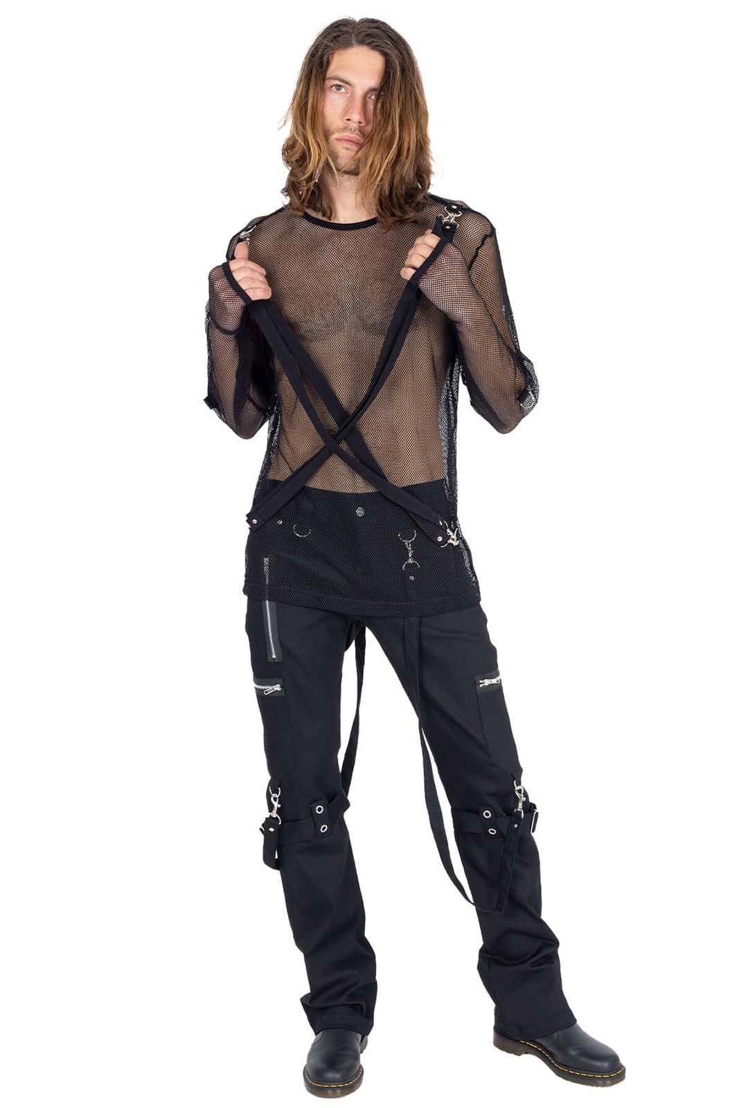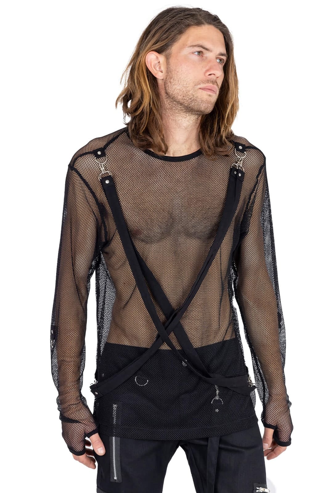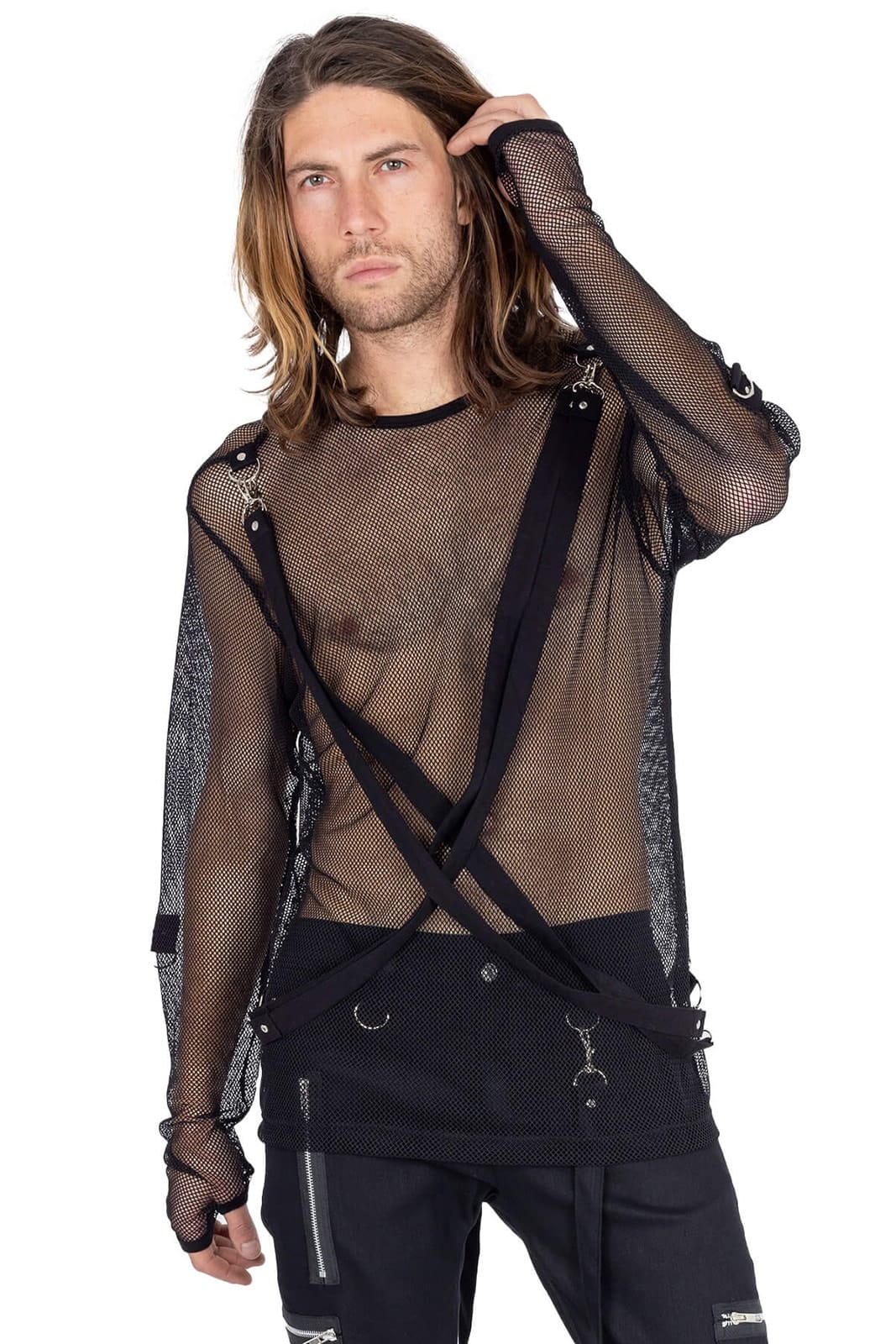 Klassisch geschnittenes Netzshirt mit Rundhalsausschnitt und langen Ärmeln. Verziert mit zwei überkreuzten Riemen. Die langen Ärmel sind mit Daumenlöchern ausgestattet.