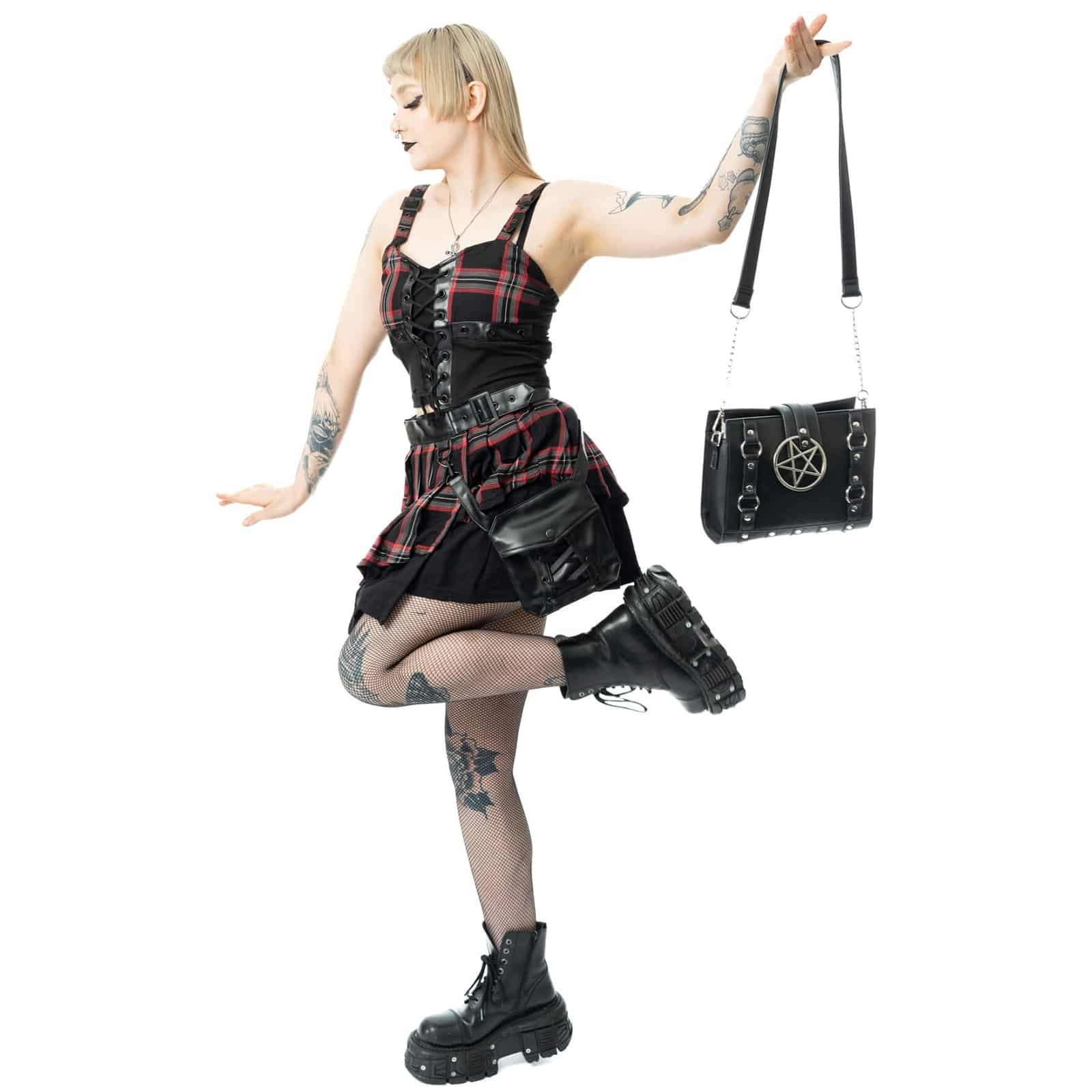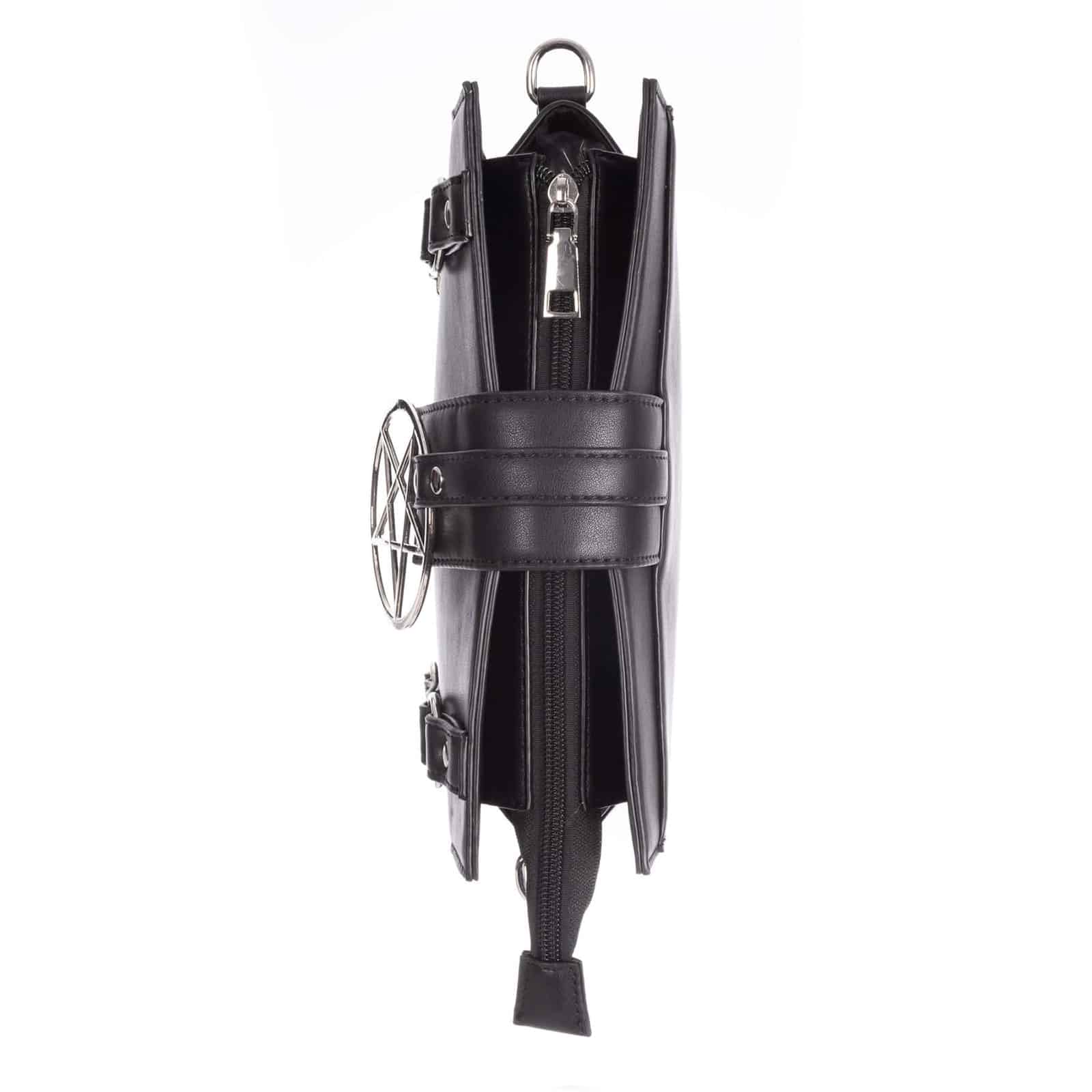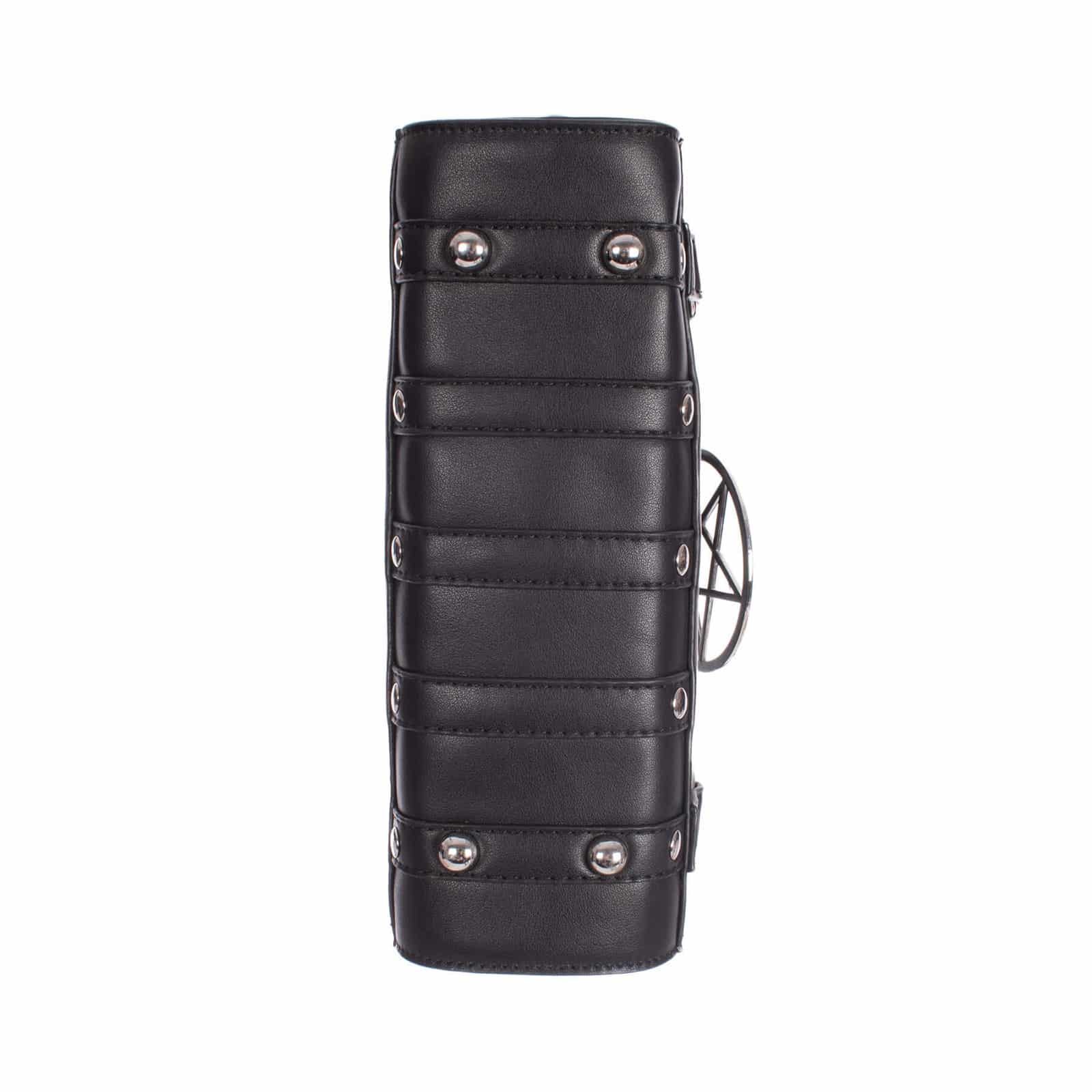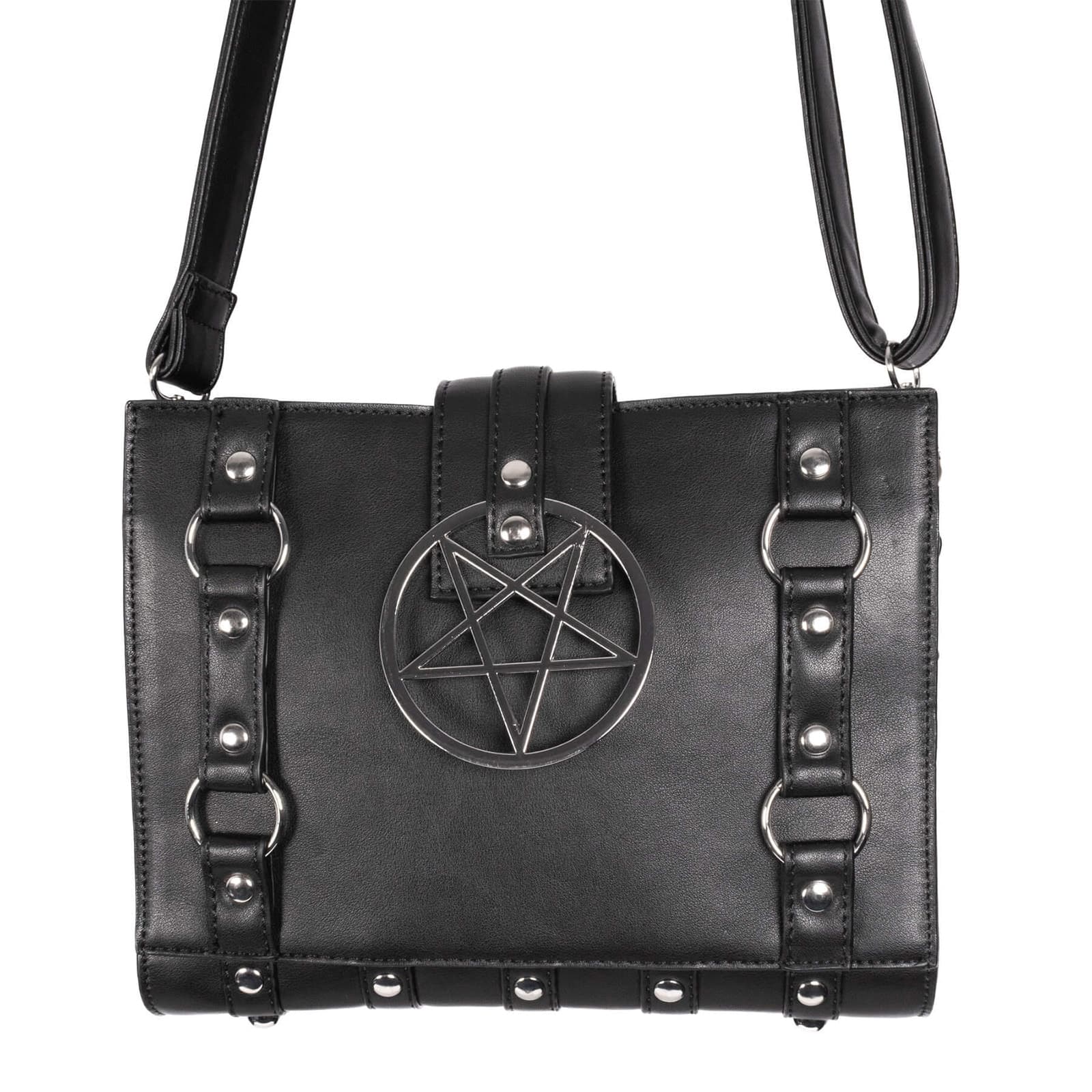 Diese Tasche kombiniert klare Linien mit einem markanten Gothic-Design. Gefertigt aus hochwertigem Polyurethan, überzeugt sie durch ihre stabile Form und ihre edle, leicht glänzende Oberfläche. Das zentrale Pentagramm aus Metall verleiht dem Look eine okkulte Note, während Nieten und D-Ringe den Industrial-Charakter betonen. Der verstellbare Schulterriemen lässt sich wahlweise mit Kette oder PU-Gurt tragen – perfekt für Alltag, Festival oder Nachtleben.