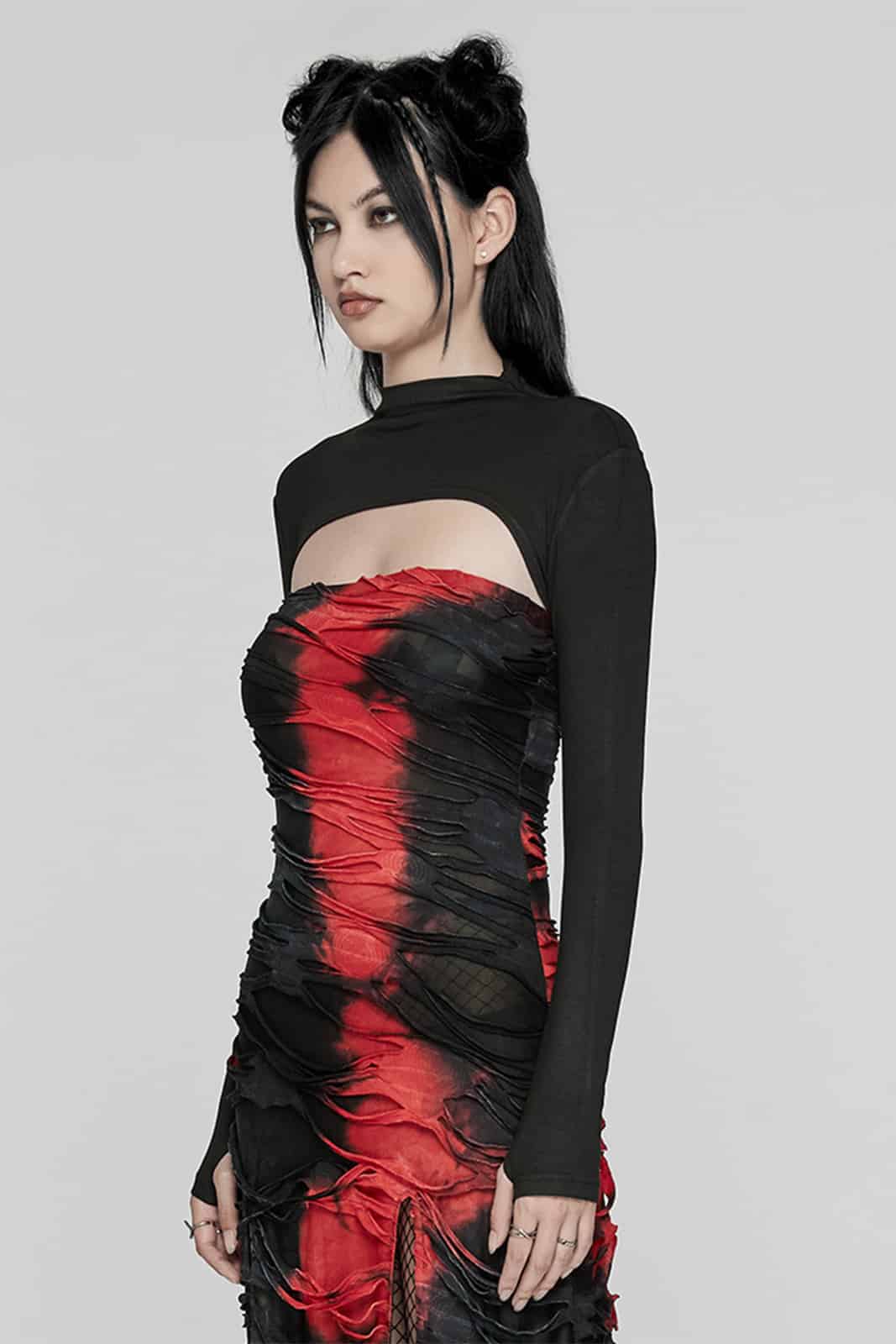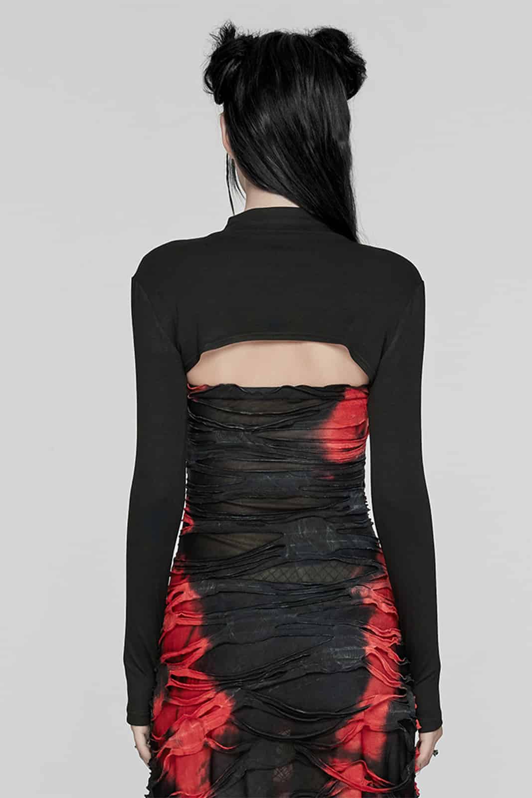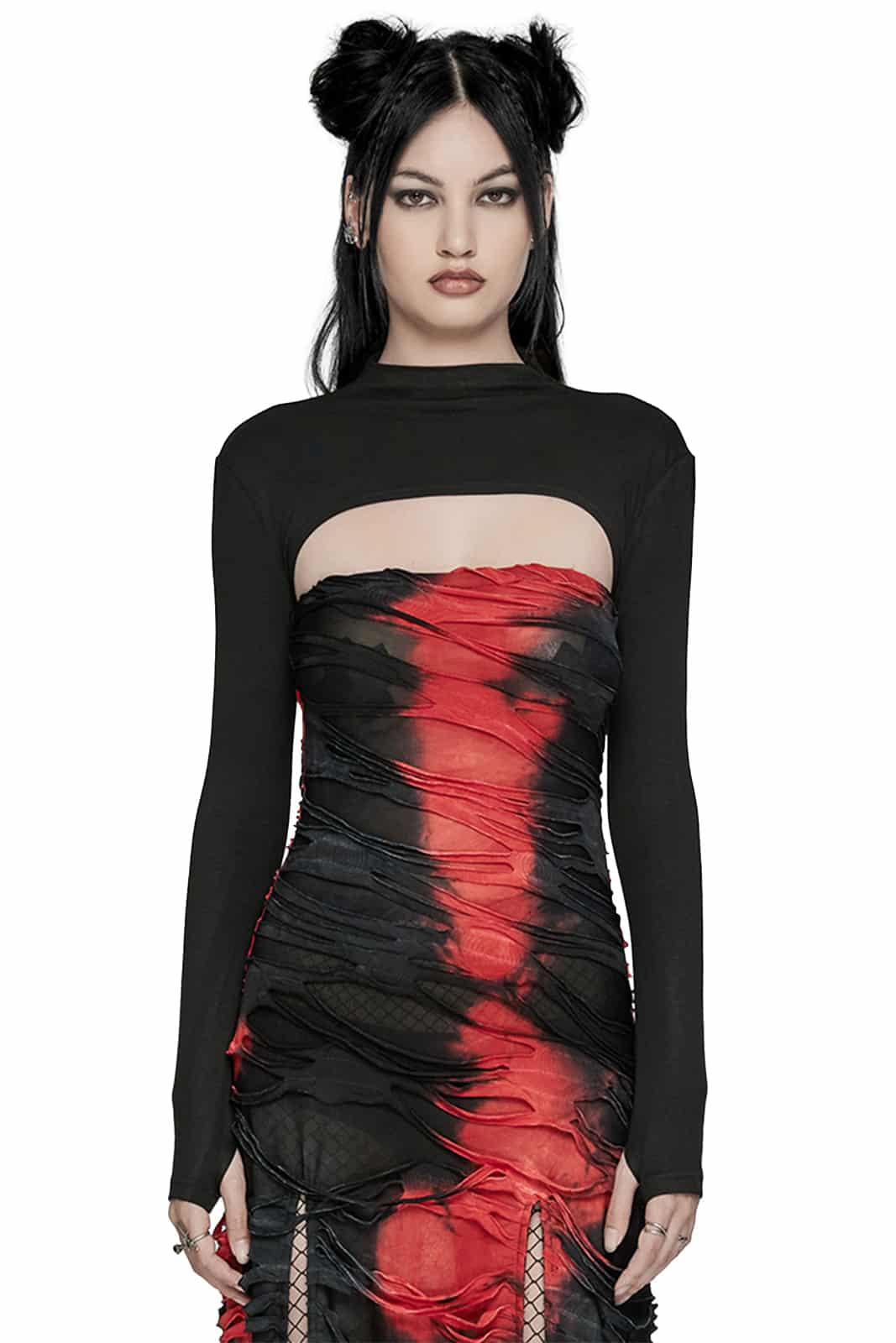 Der Black Line Shrug ist ein reduziertes Layering-Piece für moderne Dark- und Nu-Goth-Looks. Gefertigt aus weichem, elastischem Jersey schmiegt sich der Shrug angenehm an und setzt mit seinem klaren Schnitt gezielte Akzente. Der schlichte Mock-Neck verleiht dem Design eine strukturierte Note, während die Daumenlöcher einen modernen, leicht utilitären Charakter hinzufügen. Der abgerundete Saum fließt weich über die Silhouette und betont den Oberkörper – ideal zum Kombinieren mit Kleidern, Tops oder Corsagen.