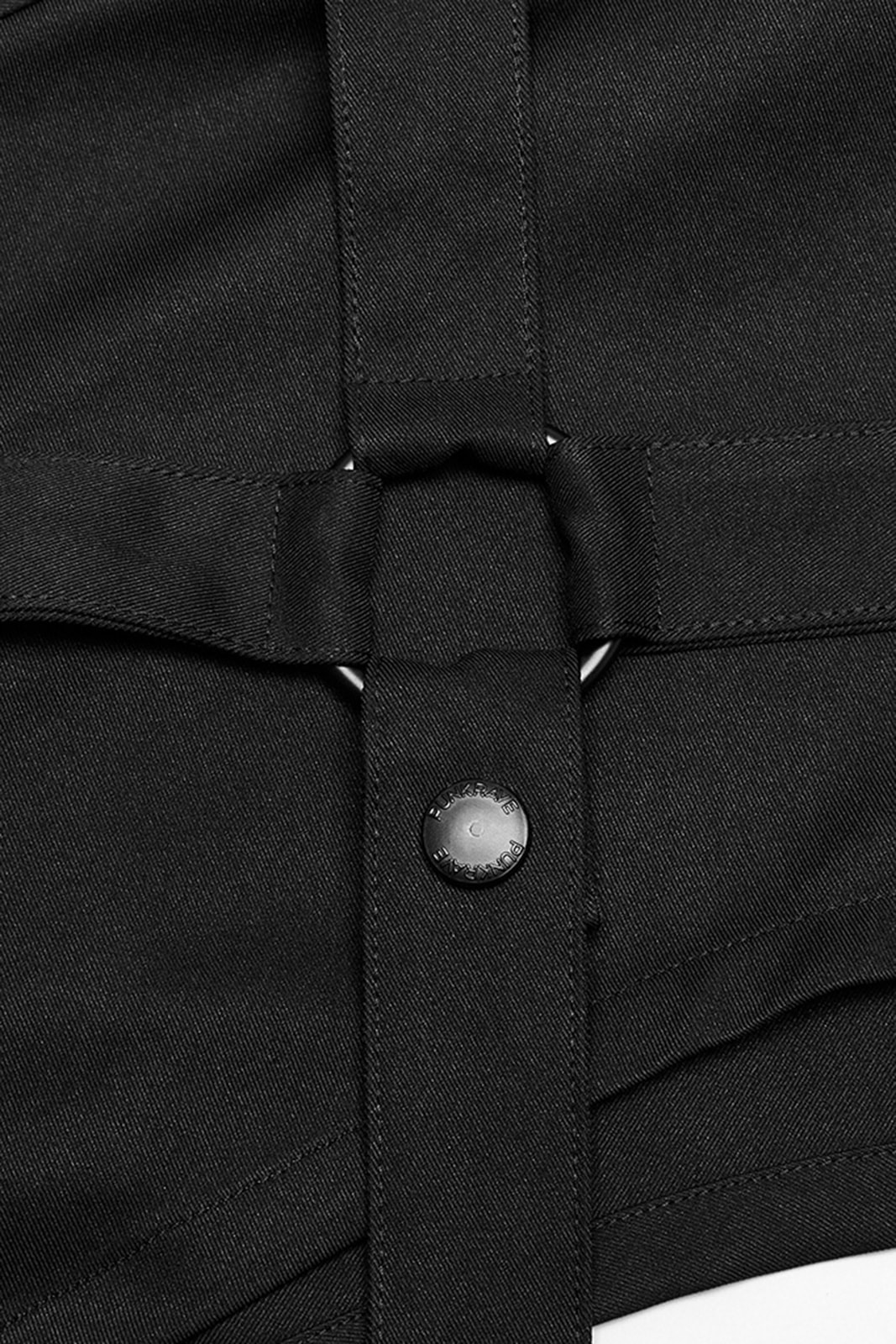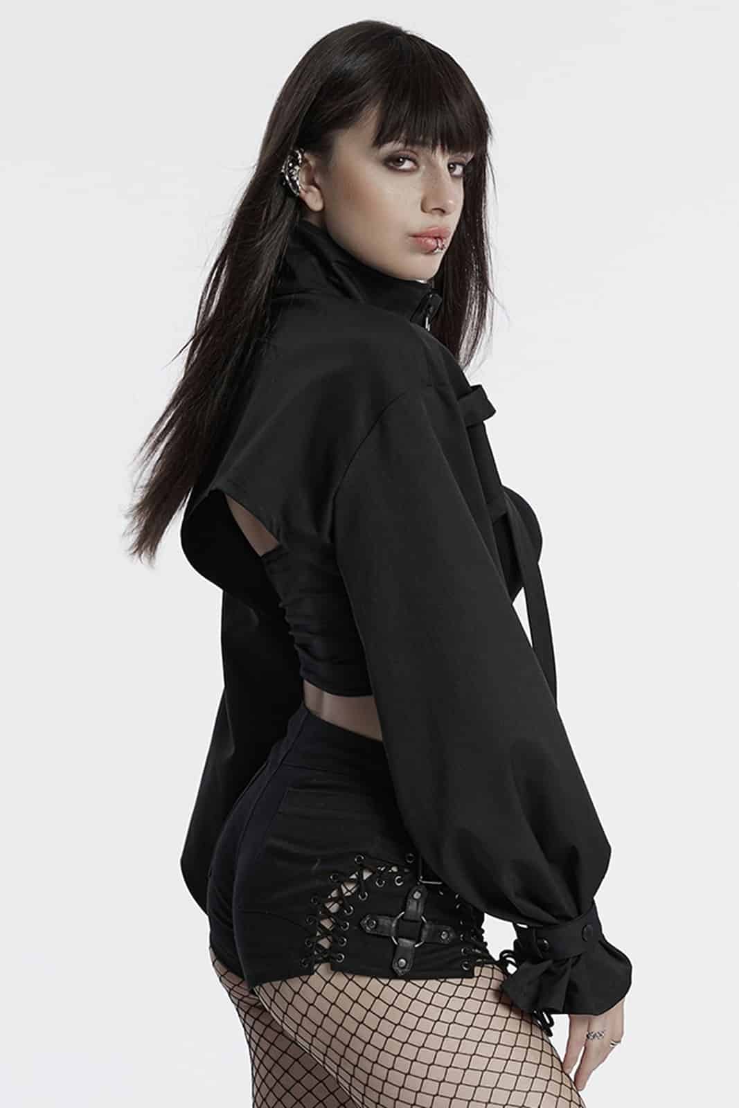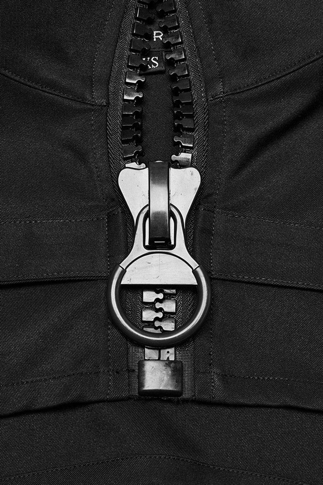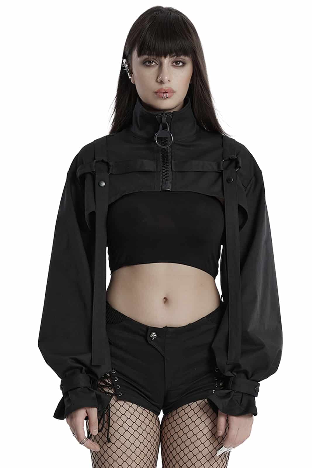 Dieser schwarze Bolero im Techwear-Stil kombiniert futuristische Ästhetik mit funktionalem Design. Die kurze Jacke ist aus strapazierfähigem Material gefertigt und überzeugt mit klaren Linien und markanten Details.