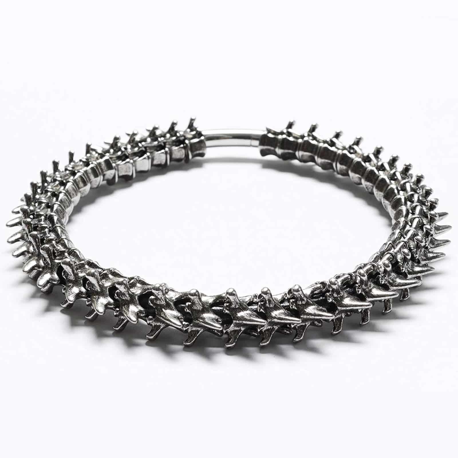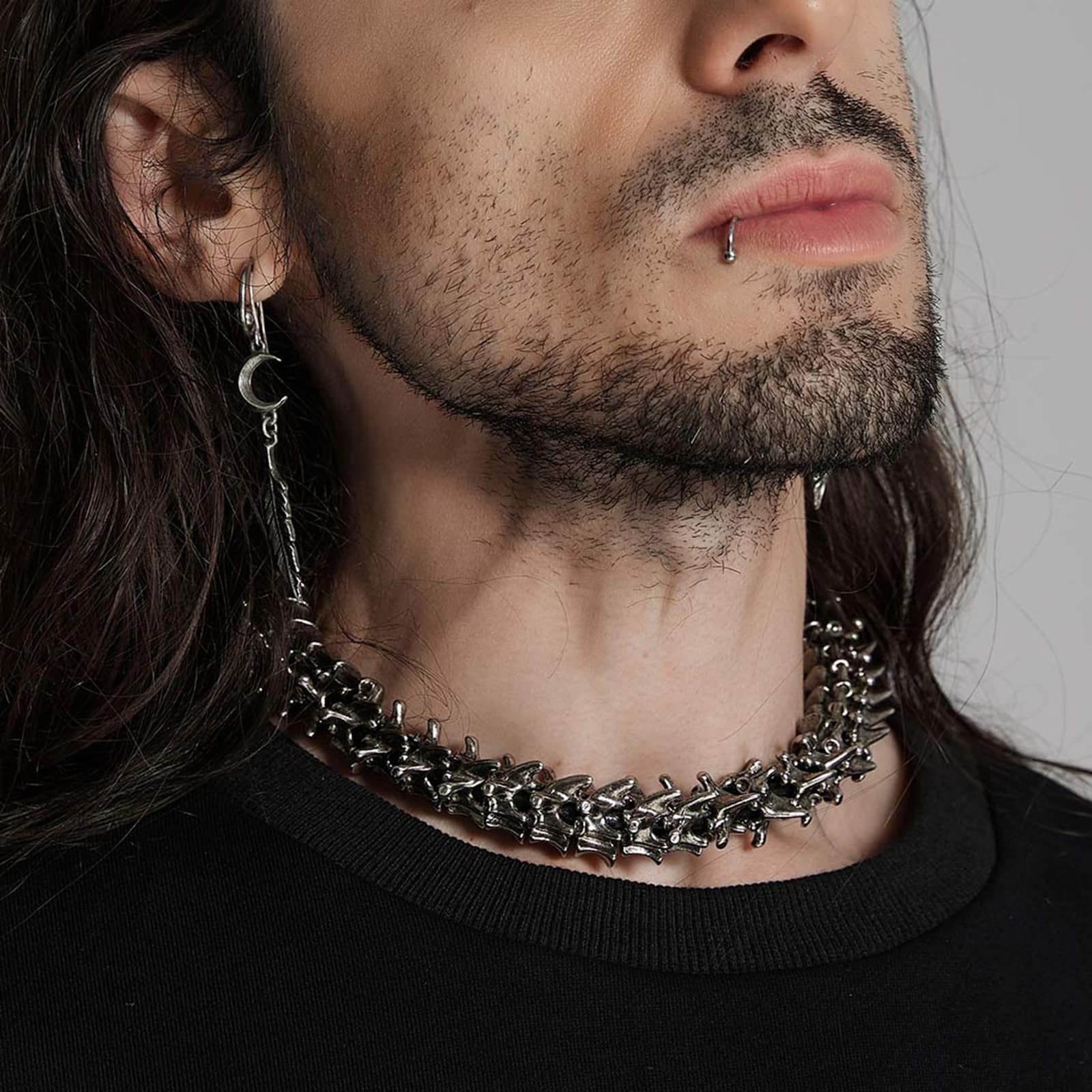 Dieser markante Gothic-Choker wirkt wie ein Relikt aus den Tiefen vergessener Katakomben. Die detailreiche Wirbelkettengliederung in silbernem Finish legt sich wie ein dunkles Artefakt um den Hals. Dank Magnetverschluss trägt sich das Stück ebenso bequem wie kraftvoll und wird so zu einem mystischen Statement für jede Gelegenheit.