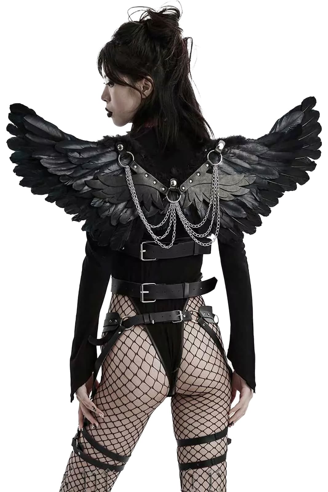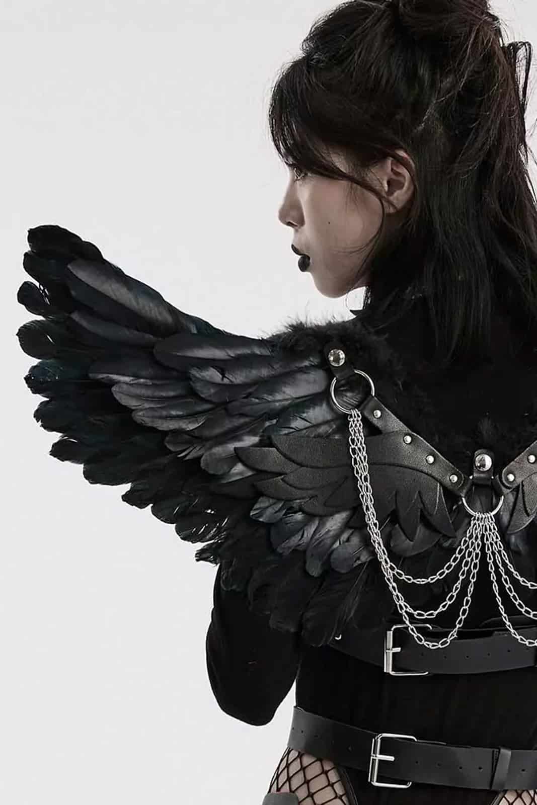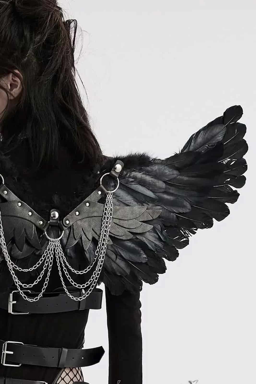 Die geschichteten Federflügel sind an einen abnehmbaren Harness aus schwarzem Kunstleder und hängenden Ketten aus Metall angebracht. Die Schultergurte sind elastisch und angenehm zu tragen.
