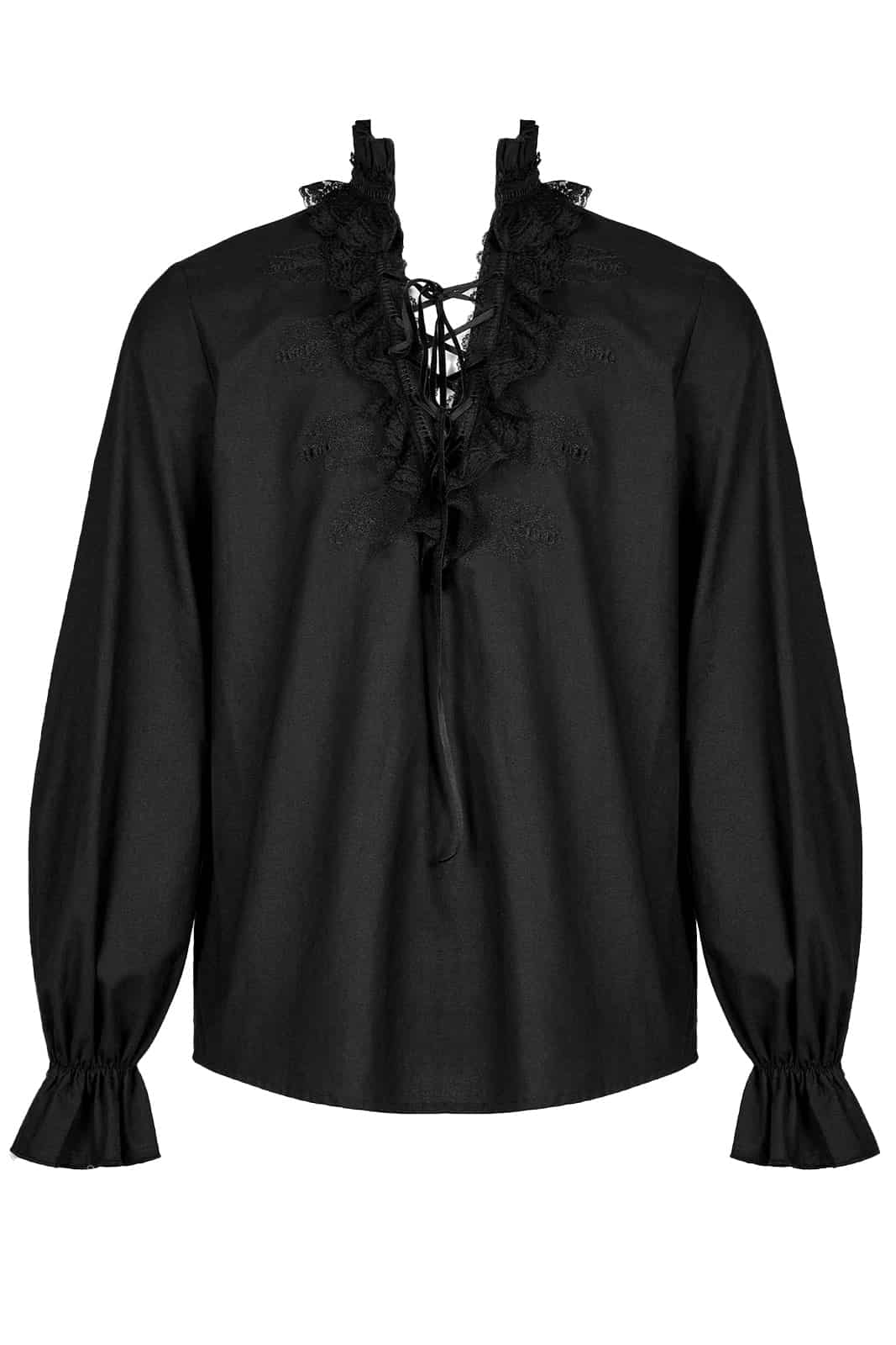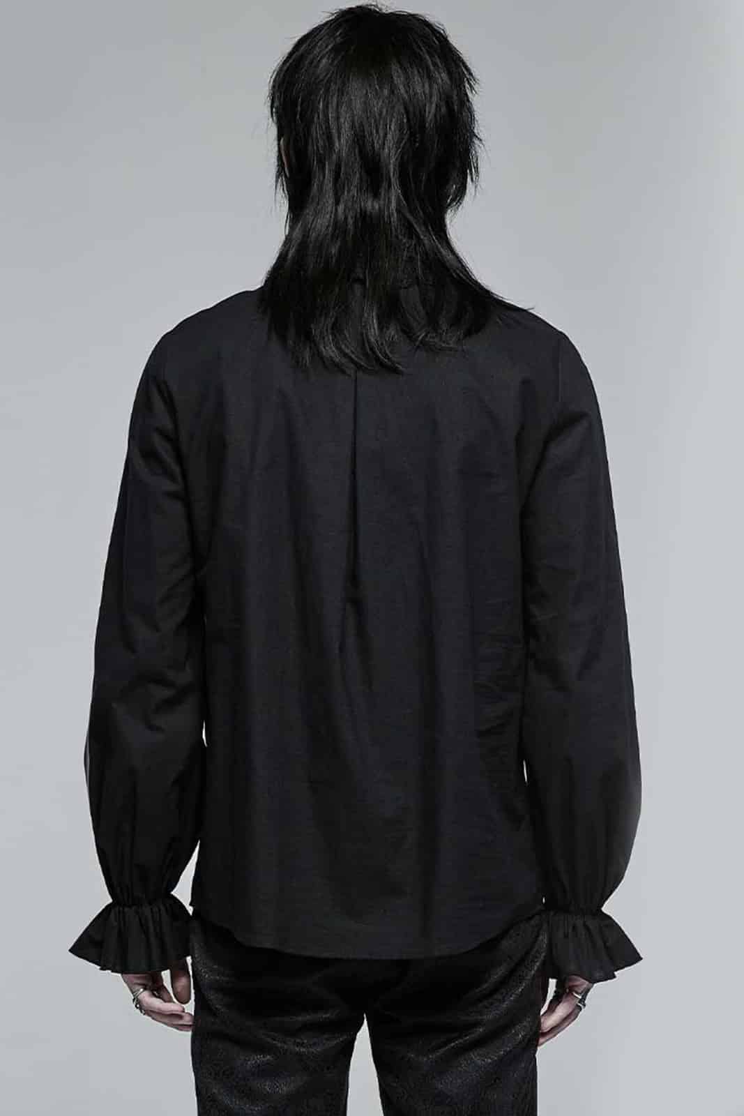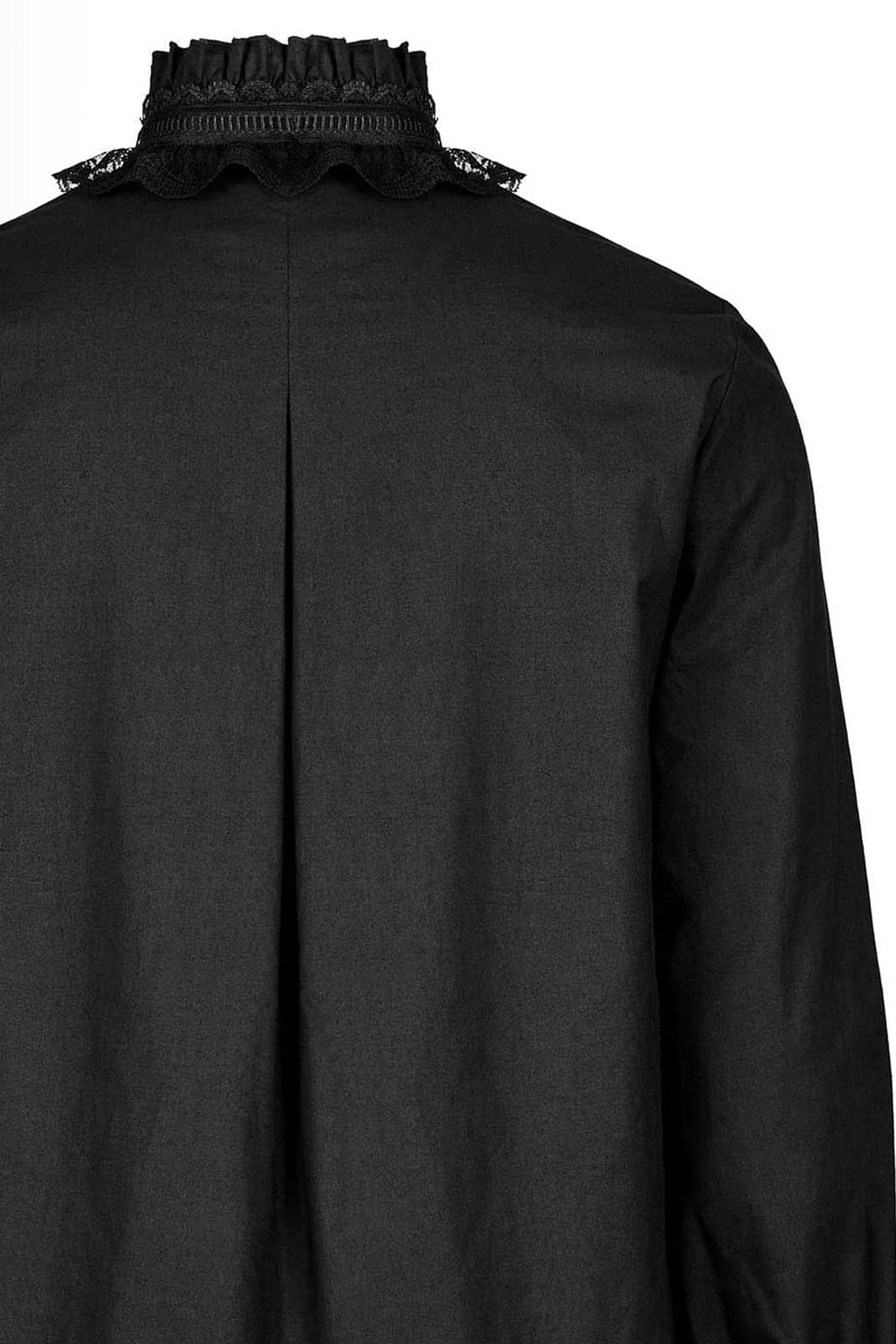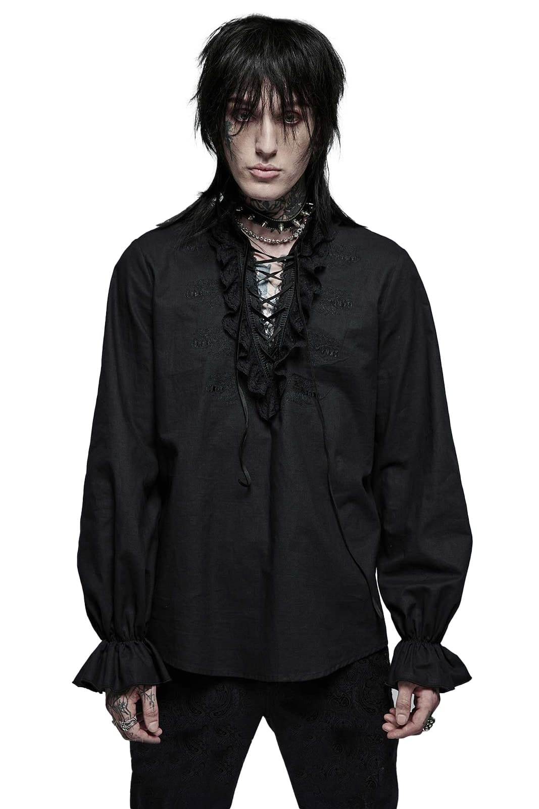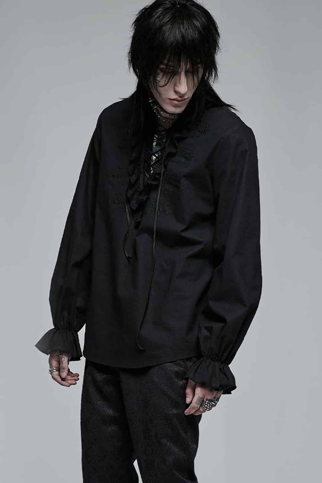 Romantisches Gothic-Hemd aus reiner Baumwolle im schwarzen Poet-Stil. Die entspannte Passform ist mit einer Black-on-Black Skelett-Brustkorbstickerei entlang des Ausschnitts verziert. Die Ärmelbündchen sind leicht gerafft.