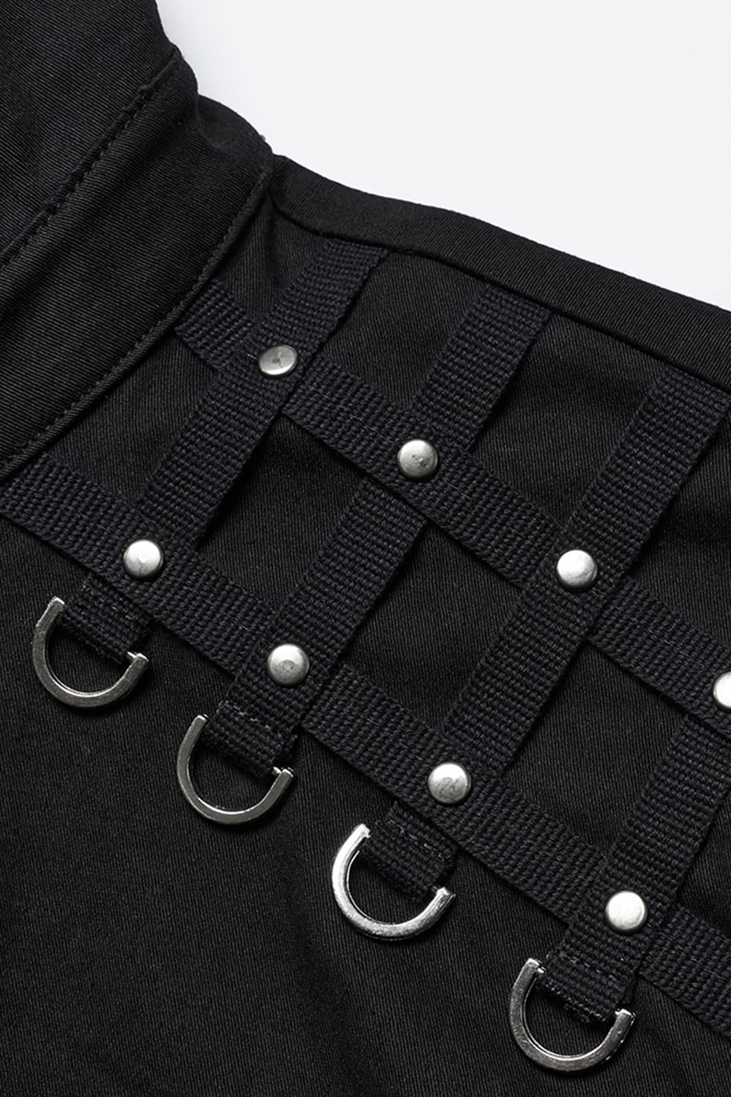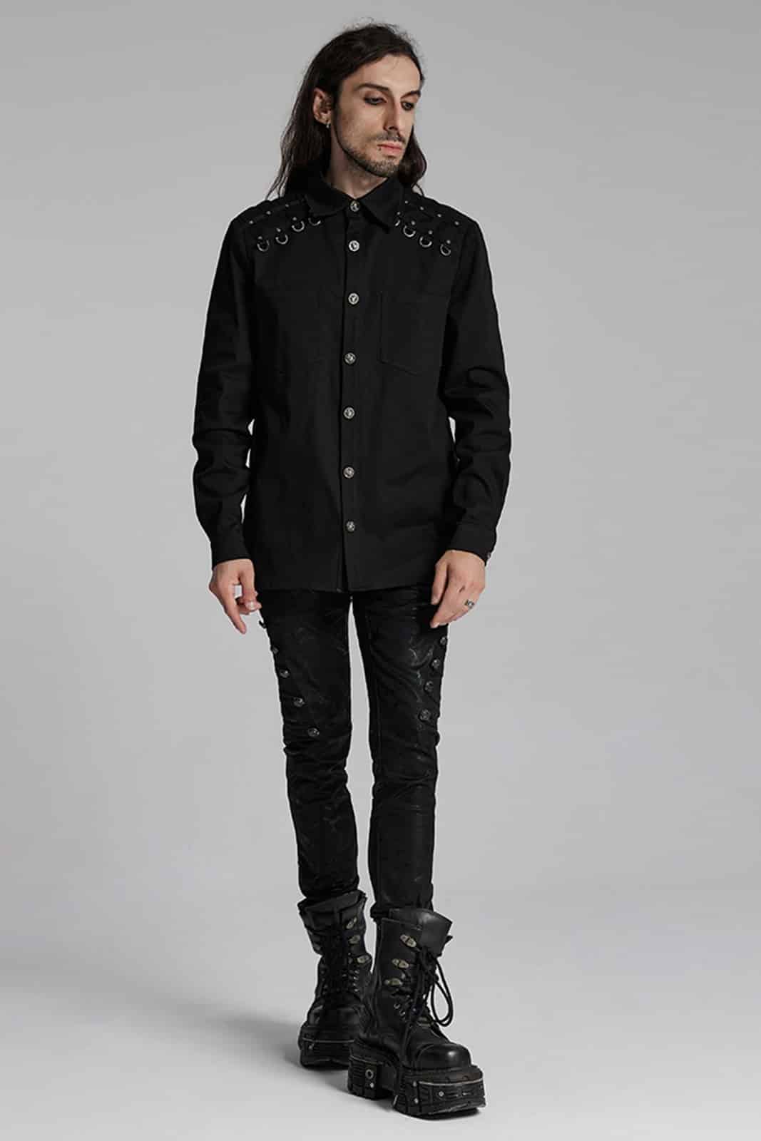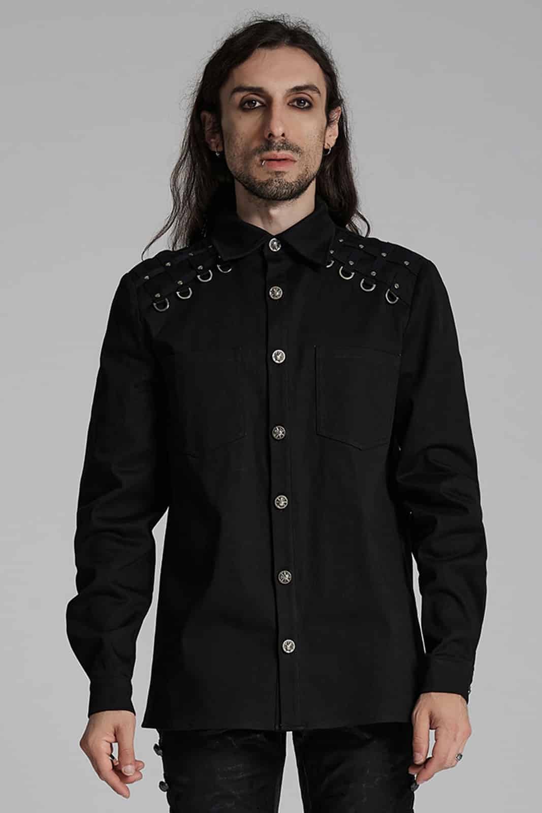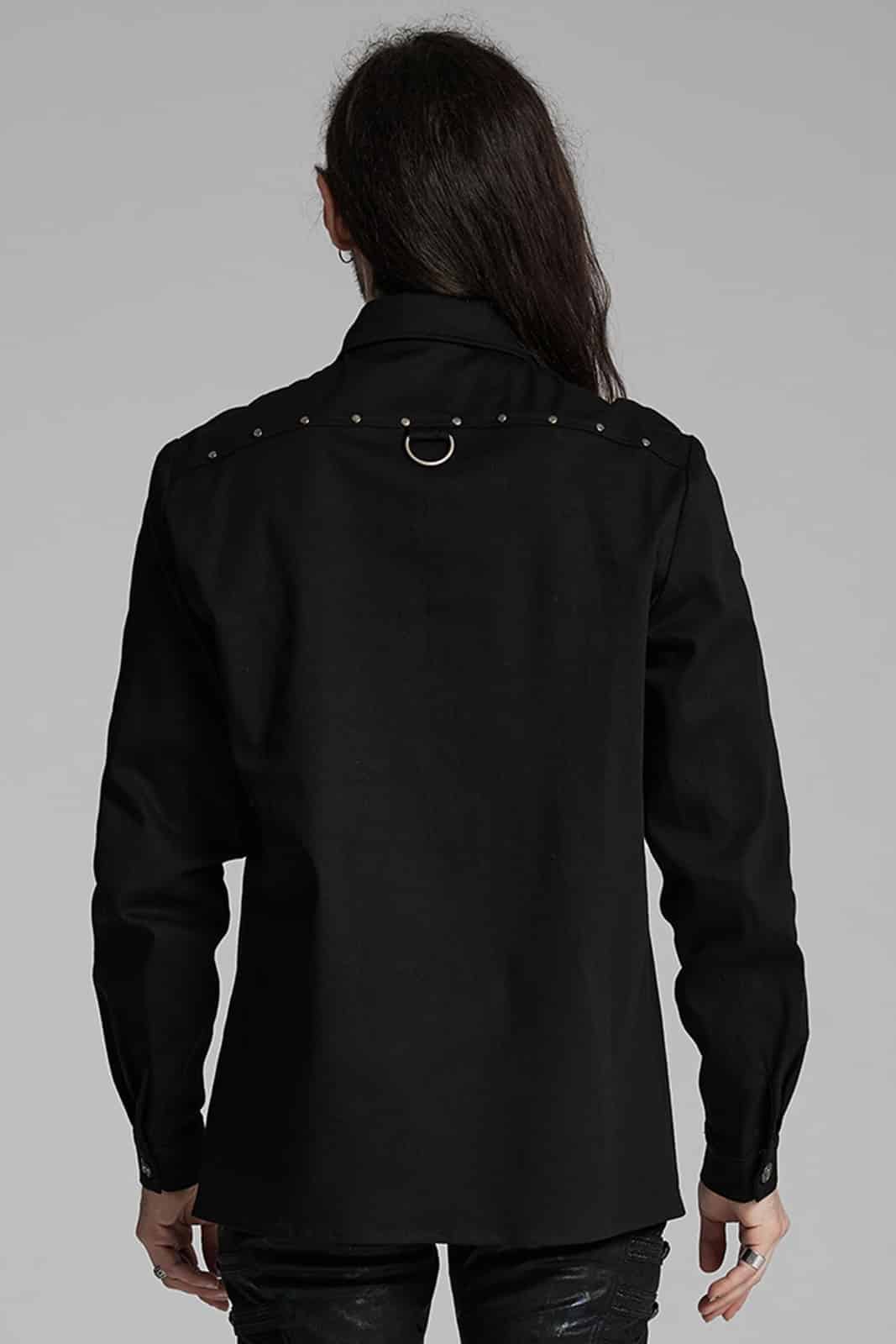 Klassisch geschnittenes Hemd mit kurzem Stehkragen und geknöpfter Front. Besetzt mit zwei Brusttaschen. Die Schulterpartie ist mit D-Ringen und kleinen Nieten verziert. Ein horizontal verlaufendes Nietenband auf dem Rücken sorgt für eine breite Nackenpartie.