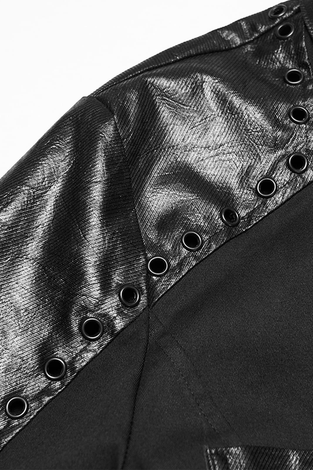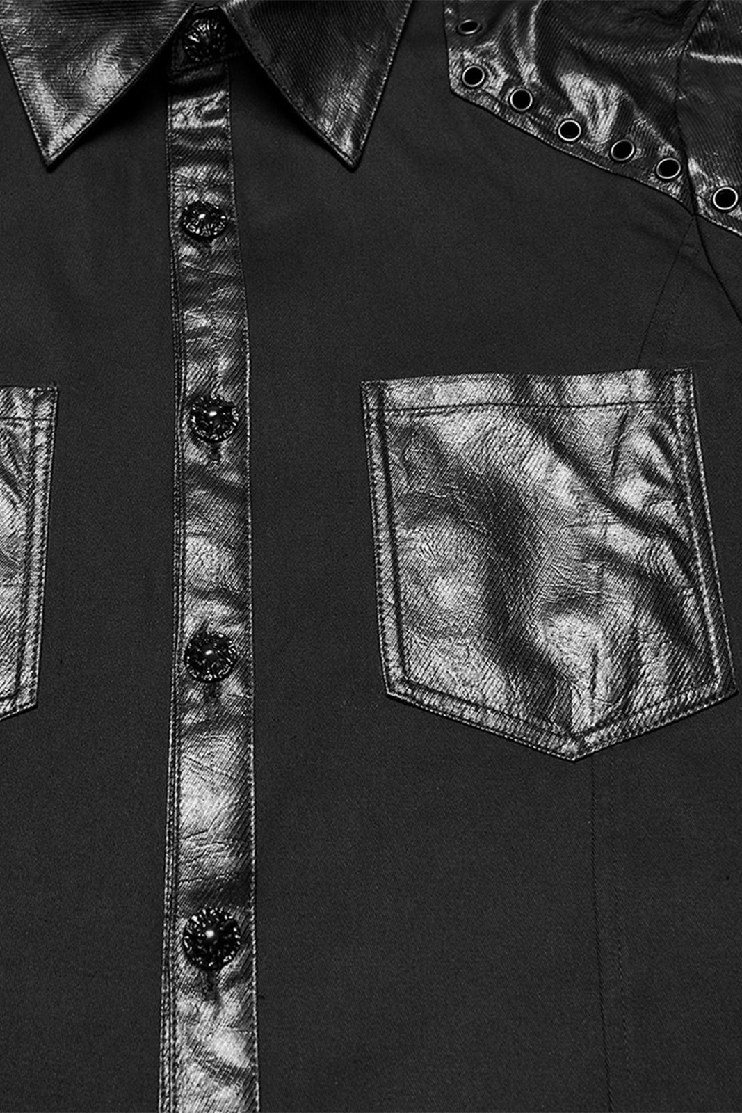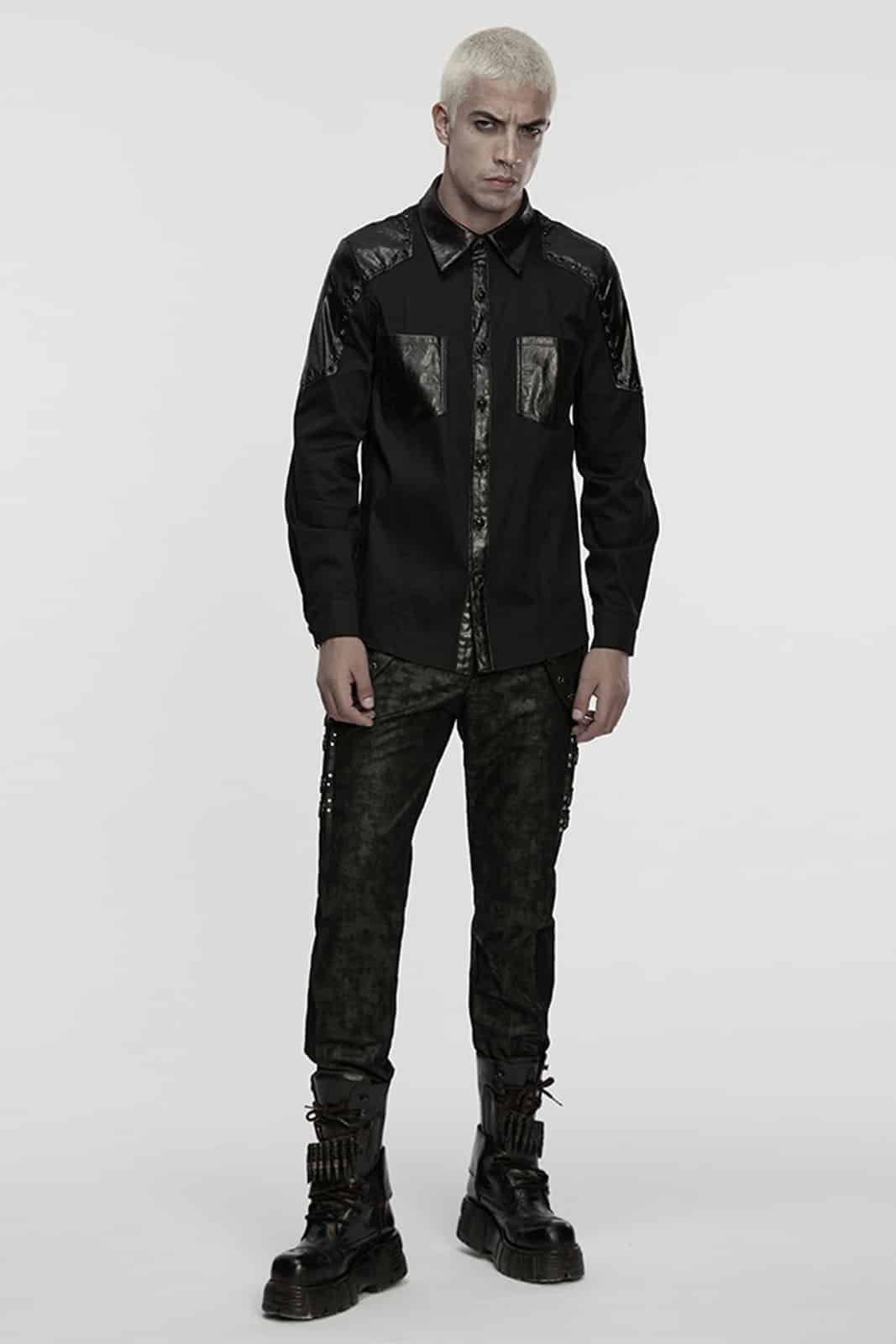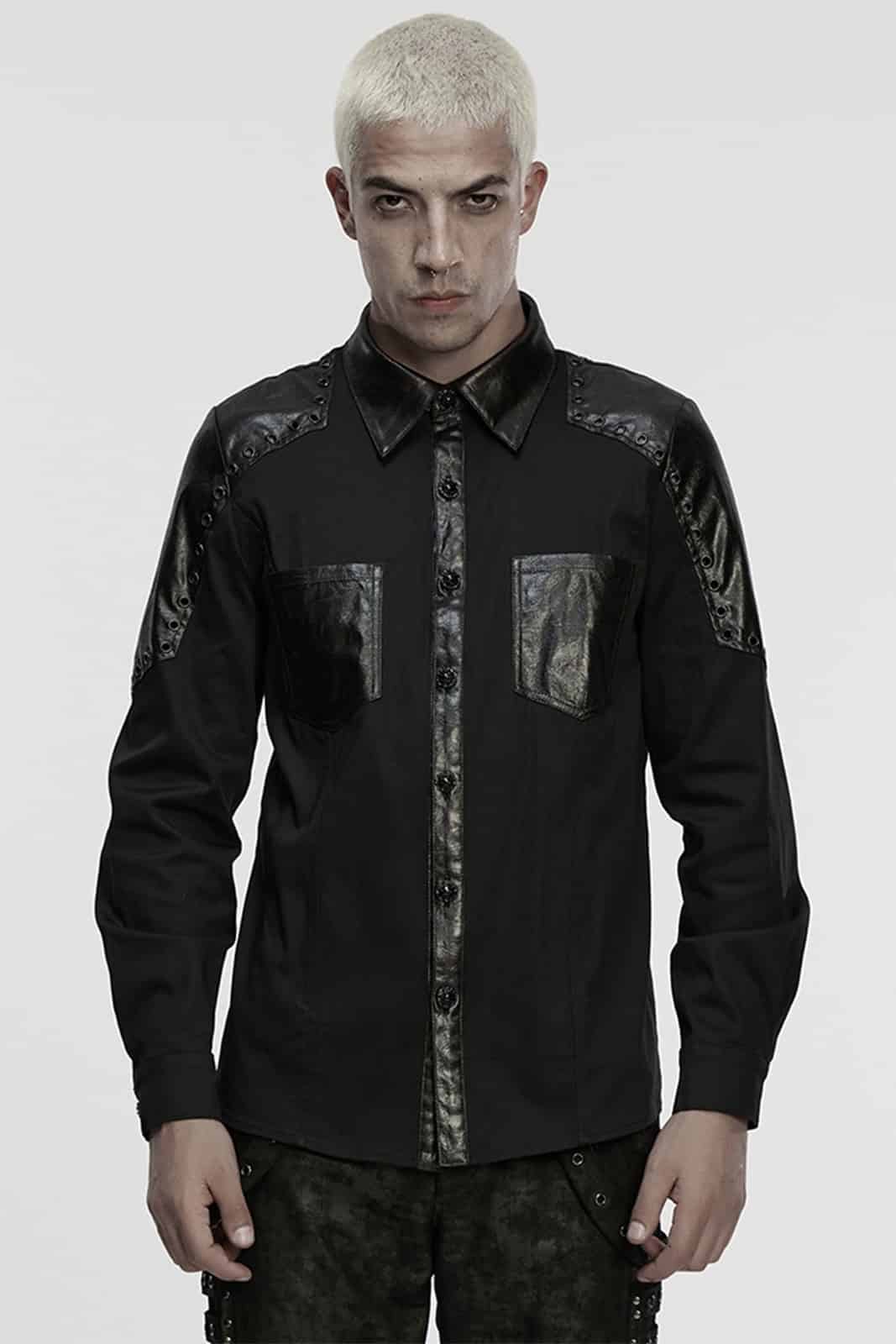 Dieses figurbetonte Gothic-Hemd für Herren verbindet klassische Schnittführung mit markanten Akzenten in Lederoptik. Der cleane Look wird durch beschichtete Details an Kragen, Knopfleiste, Schultern und Brusttaschen gebrochen und erhält so eine moderne, leicht industrielle Note. Ideal für elegante Gothic-, Industrial- oder Darkwear-Outfits mit klarer Linie.