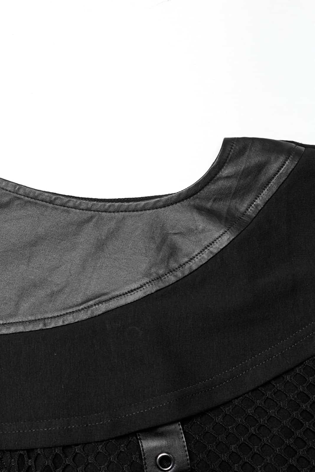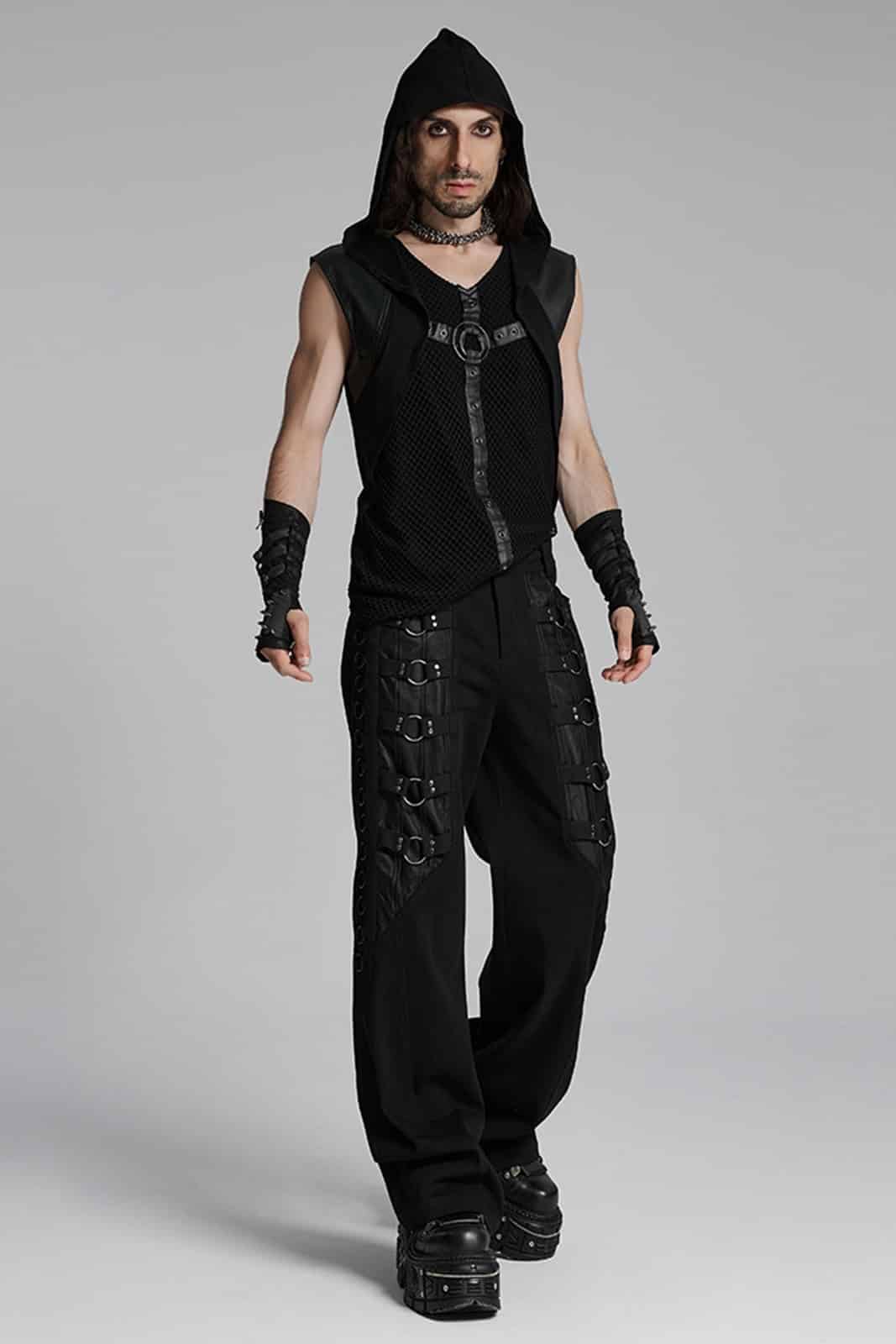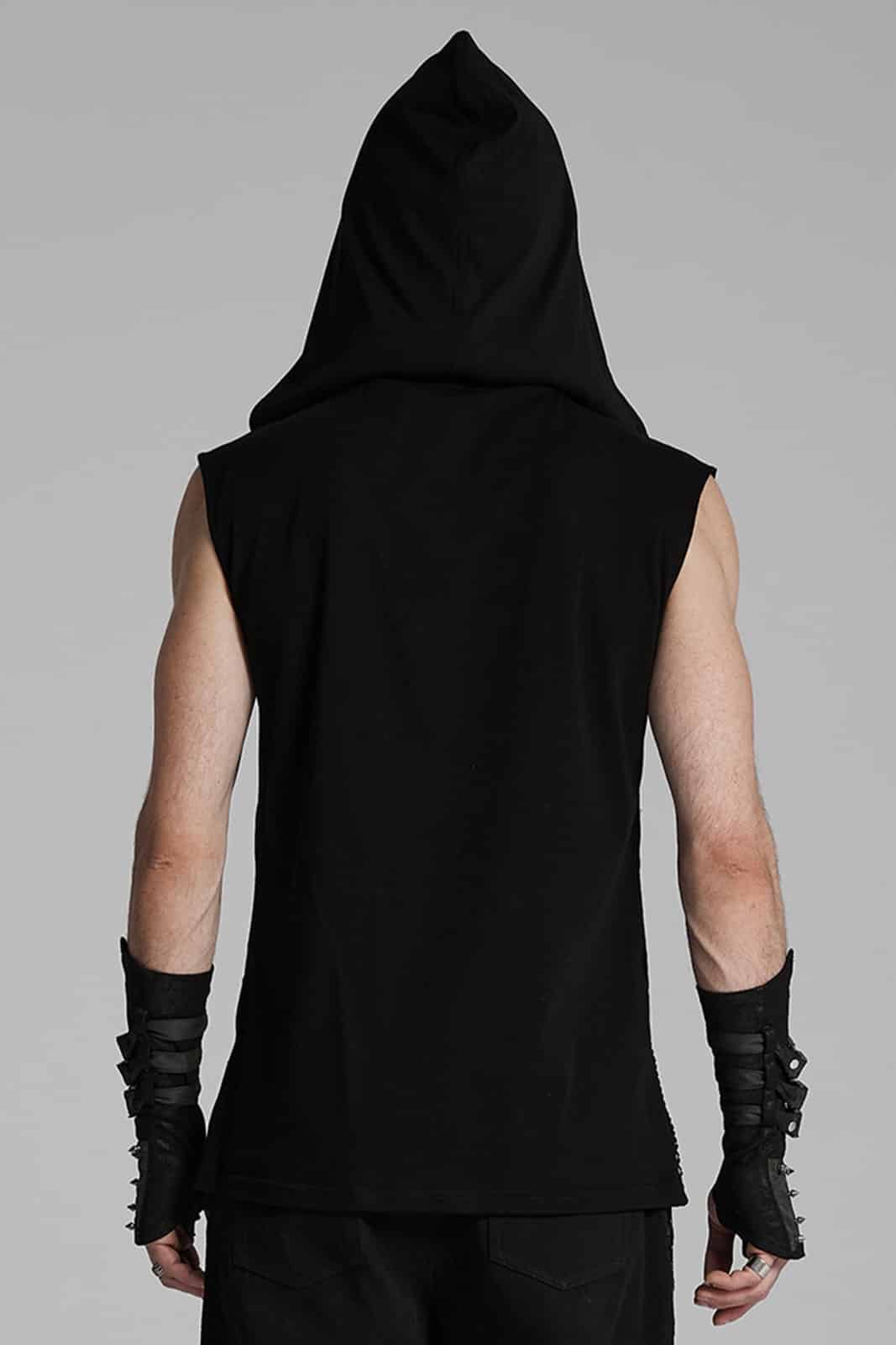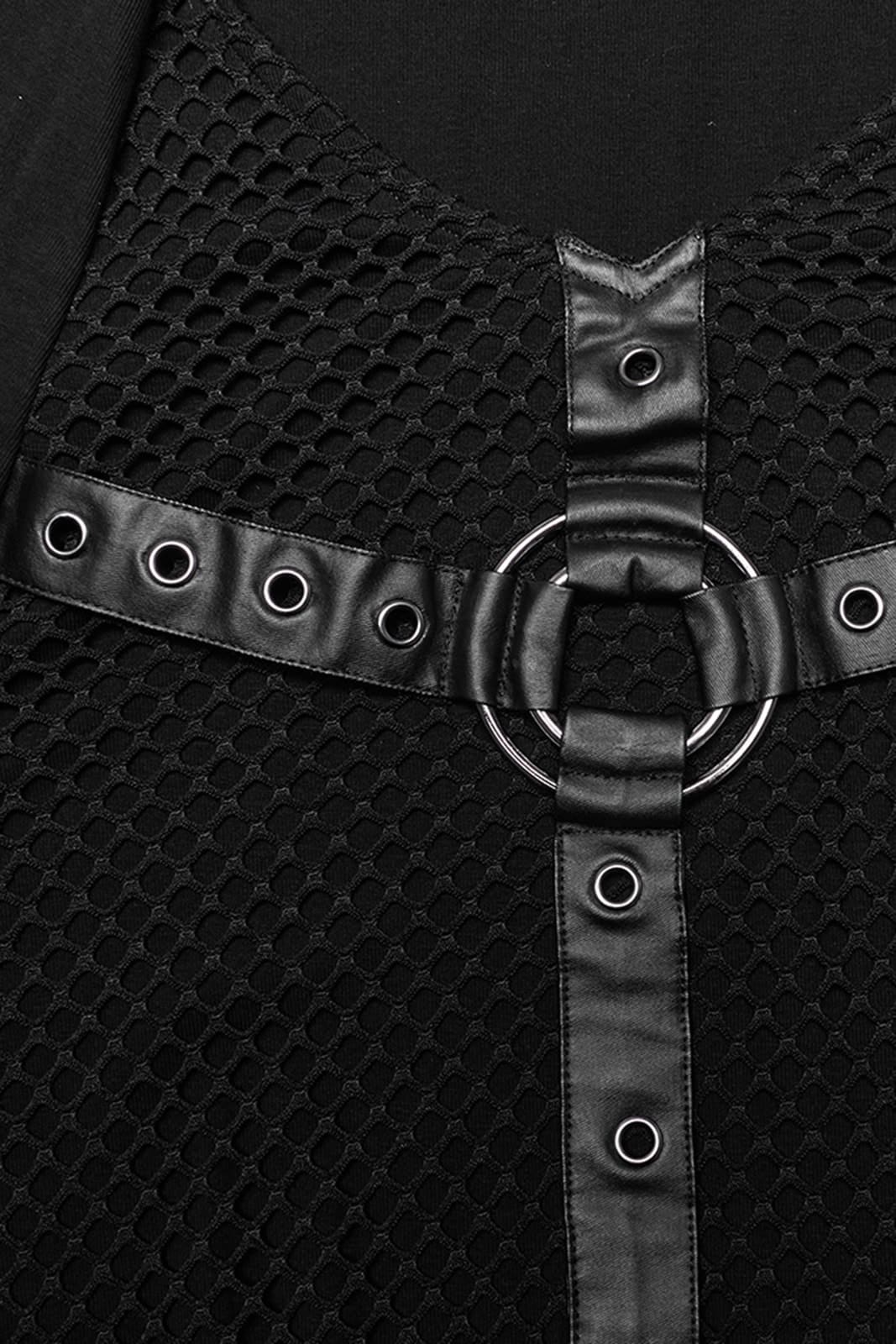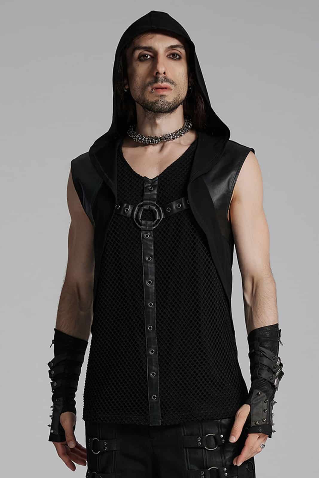 Ärmelloses Shirt mit großer Kapuze, tiefem V-Ausschnitt und doppellagiger Front. Das transparente Mesh-Material der Vorderseite ist mit einer blickdichten Unterschicht versehen. In Kreuzform ziert ein Riemendetail die Front.