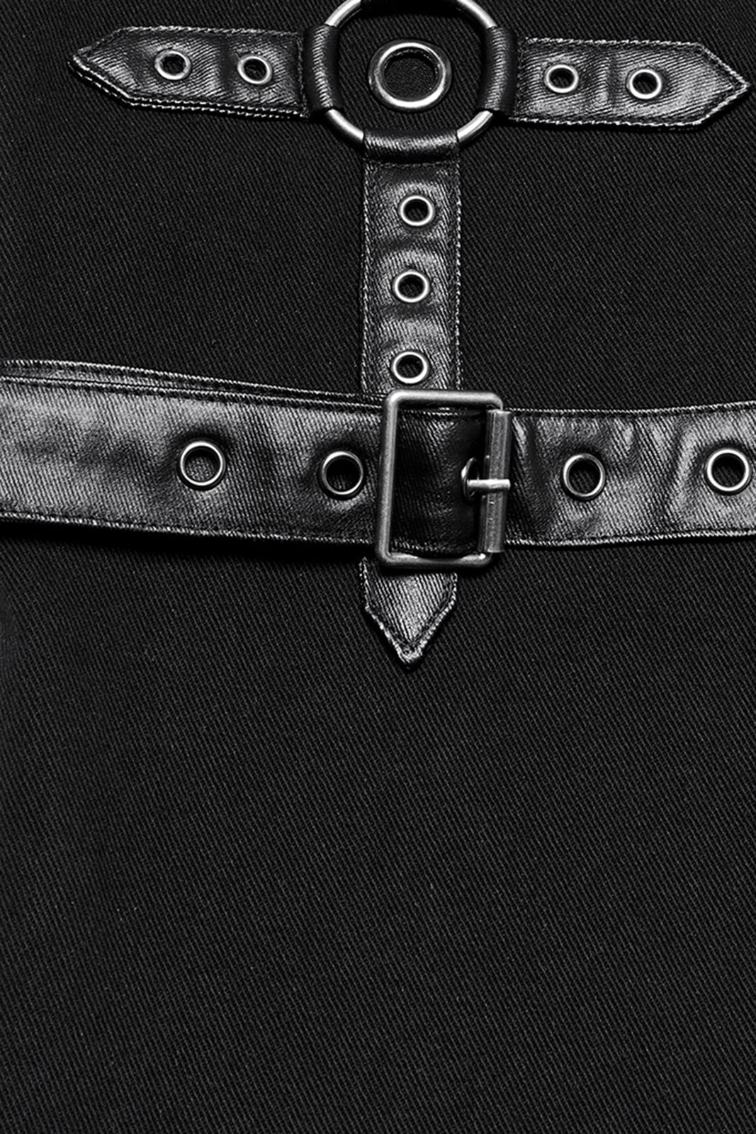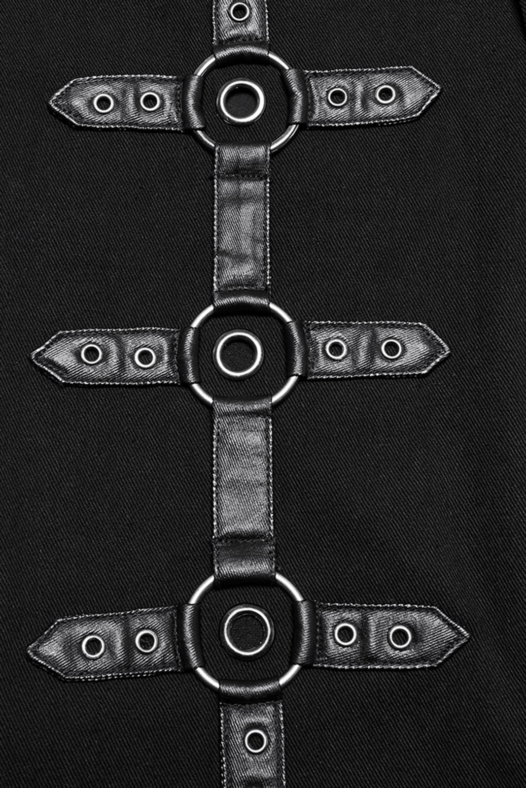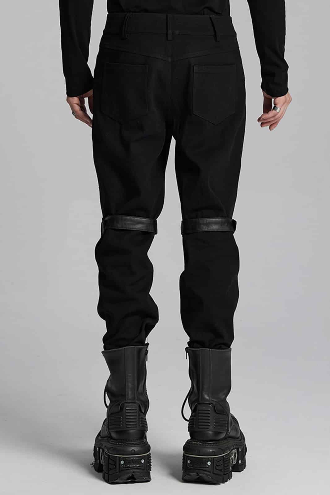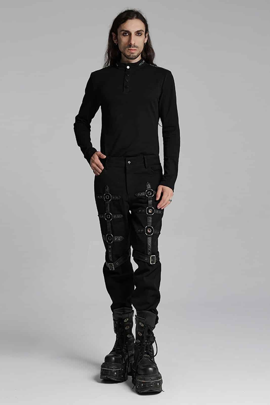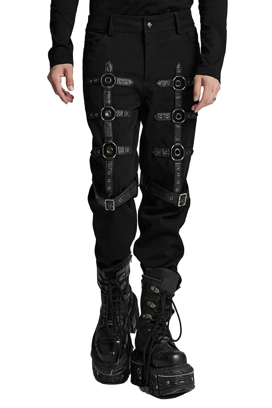 Gothic-Hose mit geradem Schnitt, Reißverschluß und Totenknopf-Verschluss. Mit zwei Taschen vorn und zwei Gesäßtaschen sowie Gürtelschlaufen. Die Schenkel sind mit Riemen und kreuzförmigen Riemen besetzt in deren Mitte ein O-Ring eingearbeitet ist.