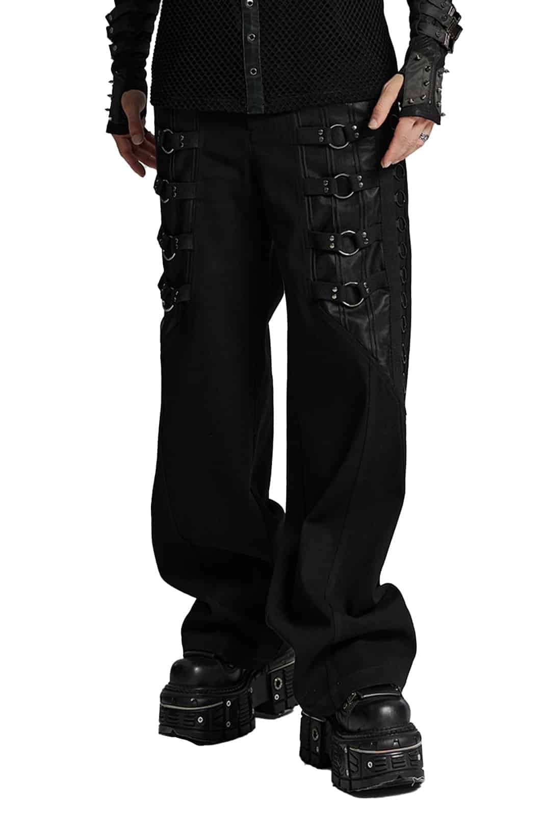 Gothic-Hose mit geradem Schnitt, Reißverschluß und Totenknopf-Verschluss. Mit zwei Taschen vorn und zwei Gesäßtaschen sowie Gürtelschlaufen. Die Schenkel sind verziert mit O-Ringen und nietenbesetzten Bändern.