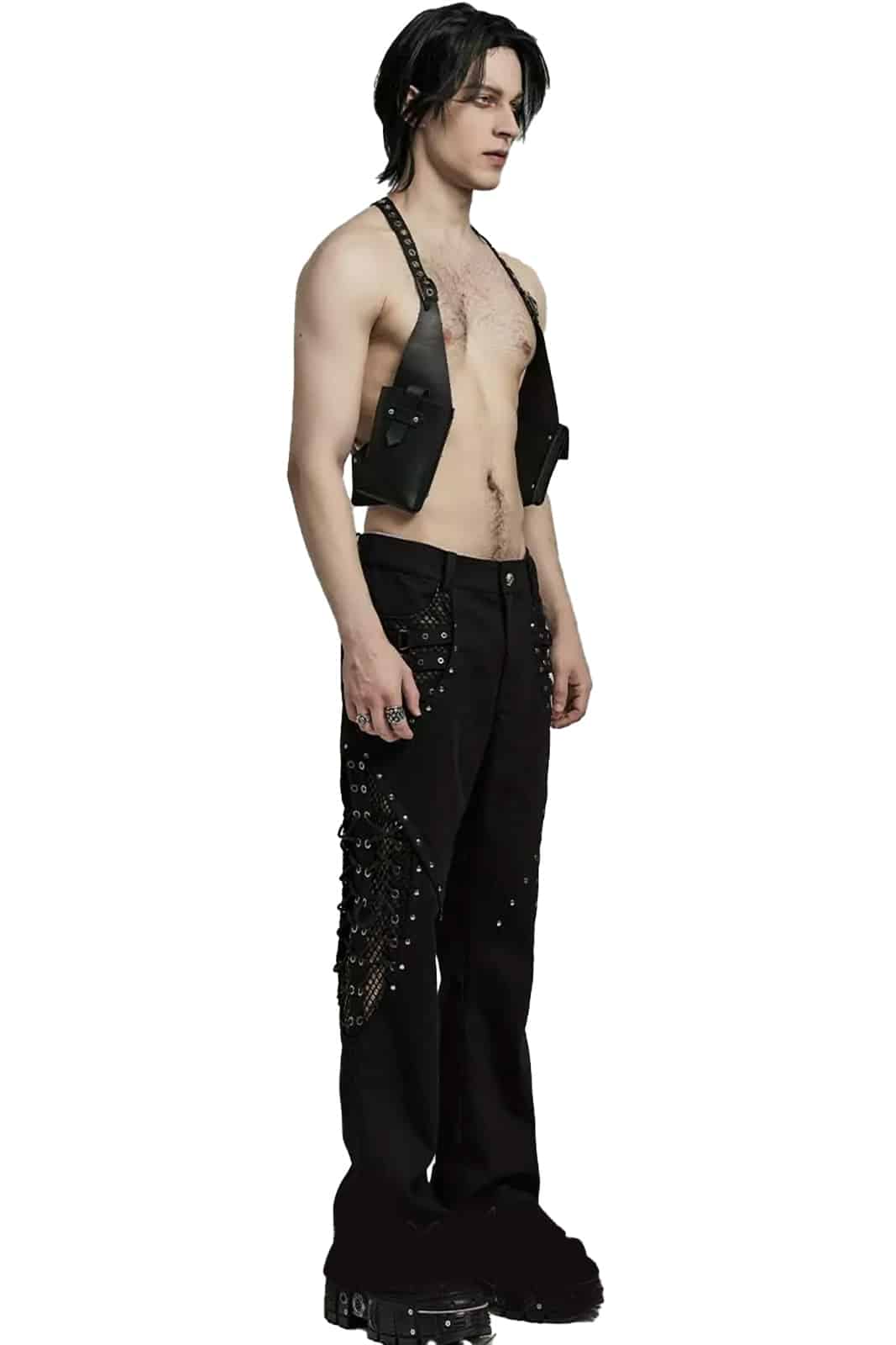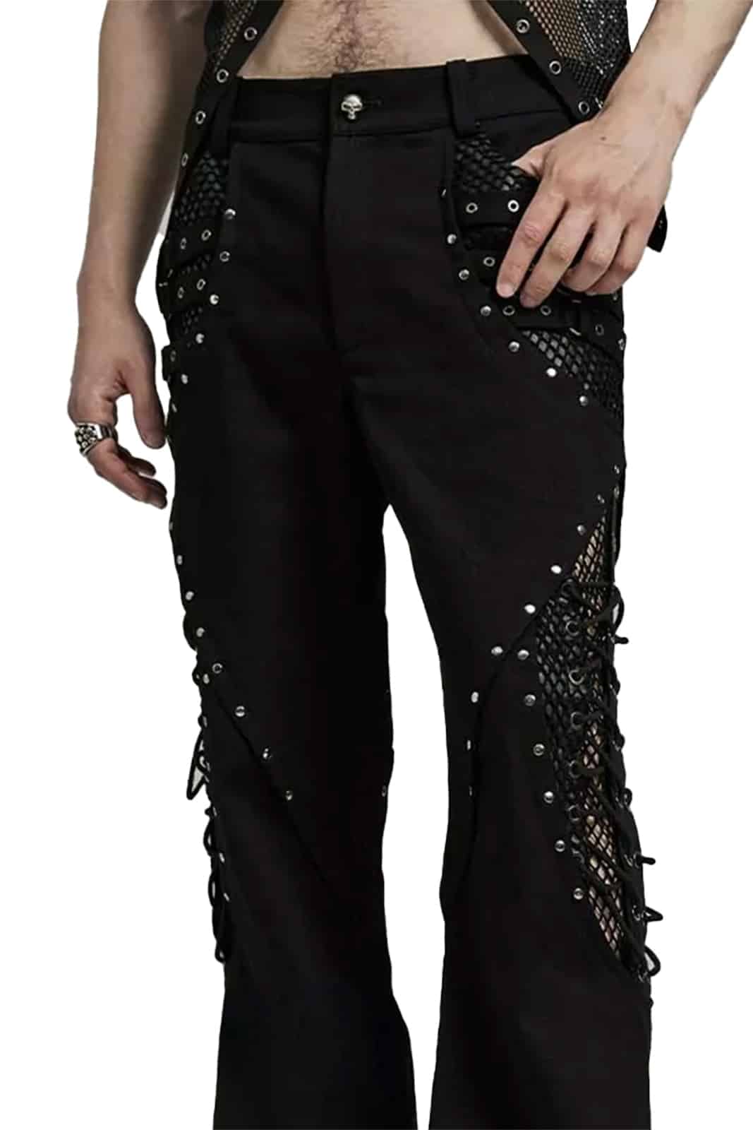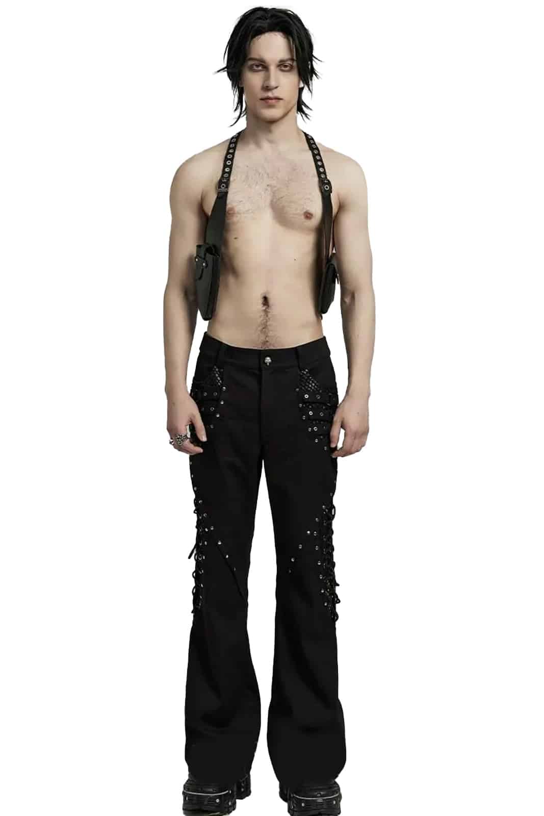 Entfessle Deine dunkle Cyberpunk-Seite mit dieser Xtraterrestrial-Hose, einer perfekten Mischung aus ausgefallener Mode und sorgfältiger Punk-Rave-Handwerkskunst. Diese schwarze Hose ist so konzipiert, dass sie mit einzigartigen Eigenschaften ein mutiges Statement setzt. Die Seitenteile verfügen über aufwendige Schnürdetails, akzentuiert durch Nietenverzierungen, die für ein rebellisches Flair sorgen. Die ausgestellten Beine sorgen für einen Retro-Touch, der an klassische Old-School-Stile erinnert, und sorgen gleichzeitig für Komfort und Bewegungsfreiheit.