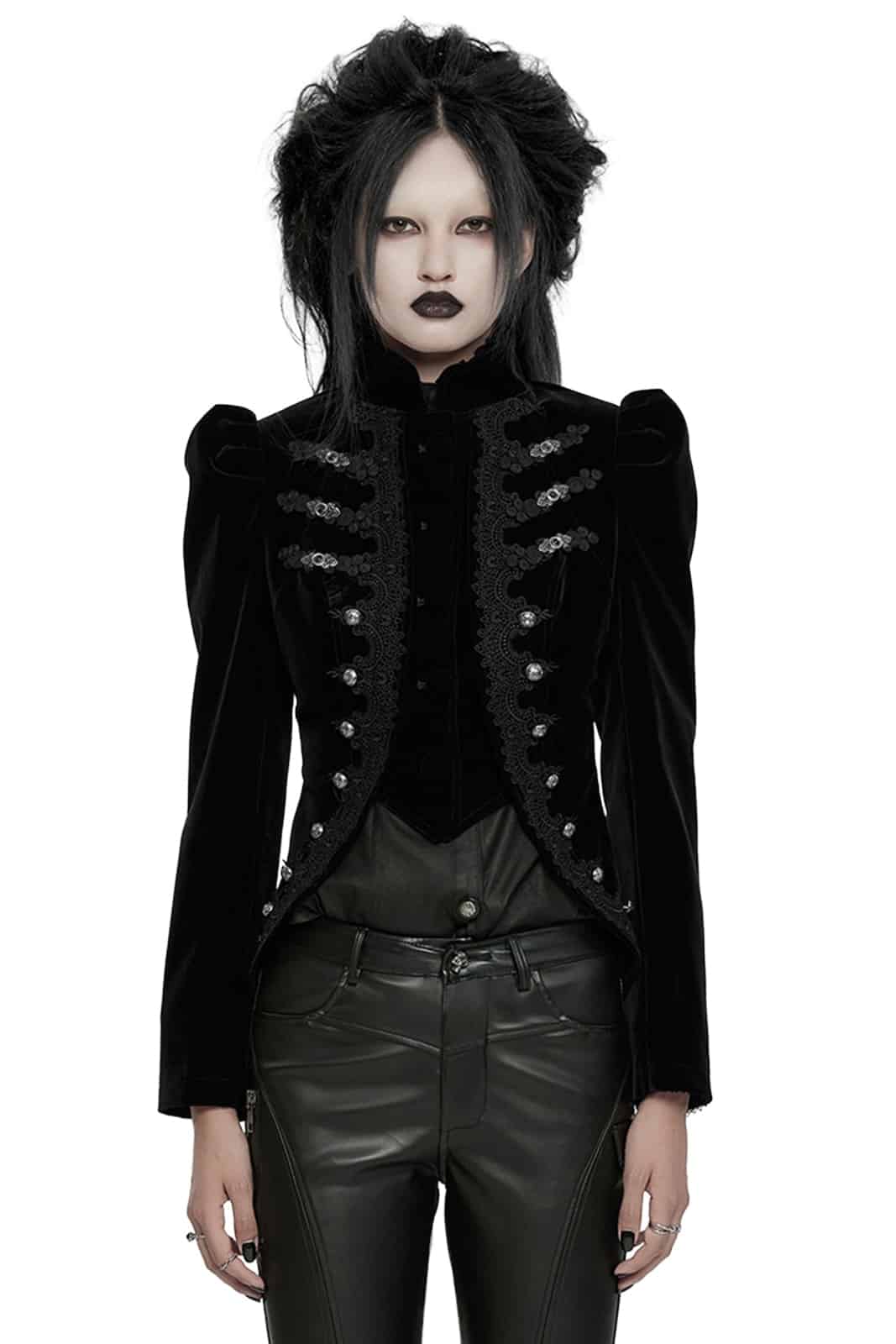 Die Abigail Jacke vereint gotische Opulenz mit viktorianischer Raffinesse und bietet eine markante Silhouette, die die Sinne verzaubert. Diese taillierte Kurzjacke aus luxuriösem schwarzem Samt hat lange Ärmel mit plissierten Schultern für einen dramatischen Touch. Der abgerundete Saum fällt im unteren Rückenbereich leicht ab und verleiht dem Ganzen ein anmutiges Profil. Aufwendige Stickapplikationen zieren die vordere Öffnung, während filigrane und gravierte Zierknöpfe einen kunstvollen Charme verleihen. Die Schnürung am Rücken ermöglicht eine individuelle Passform, und das Satinfutter sorgt für Komfort und Luxus.