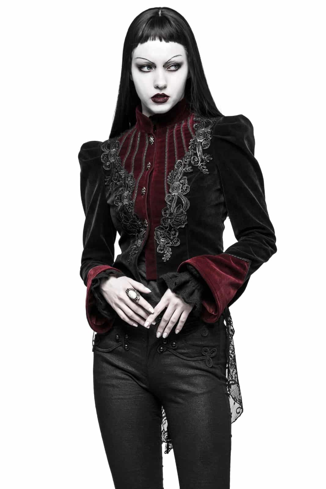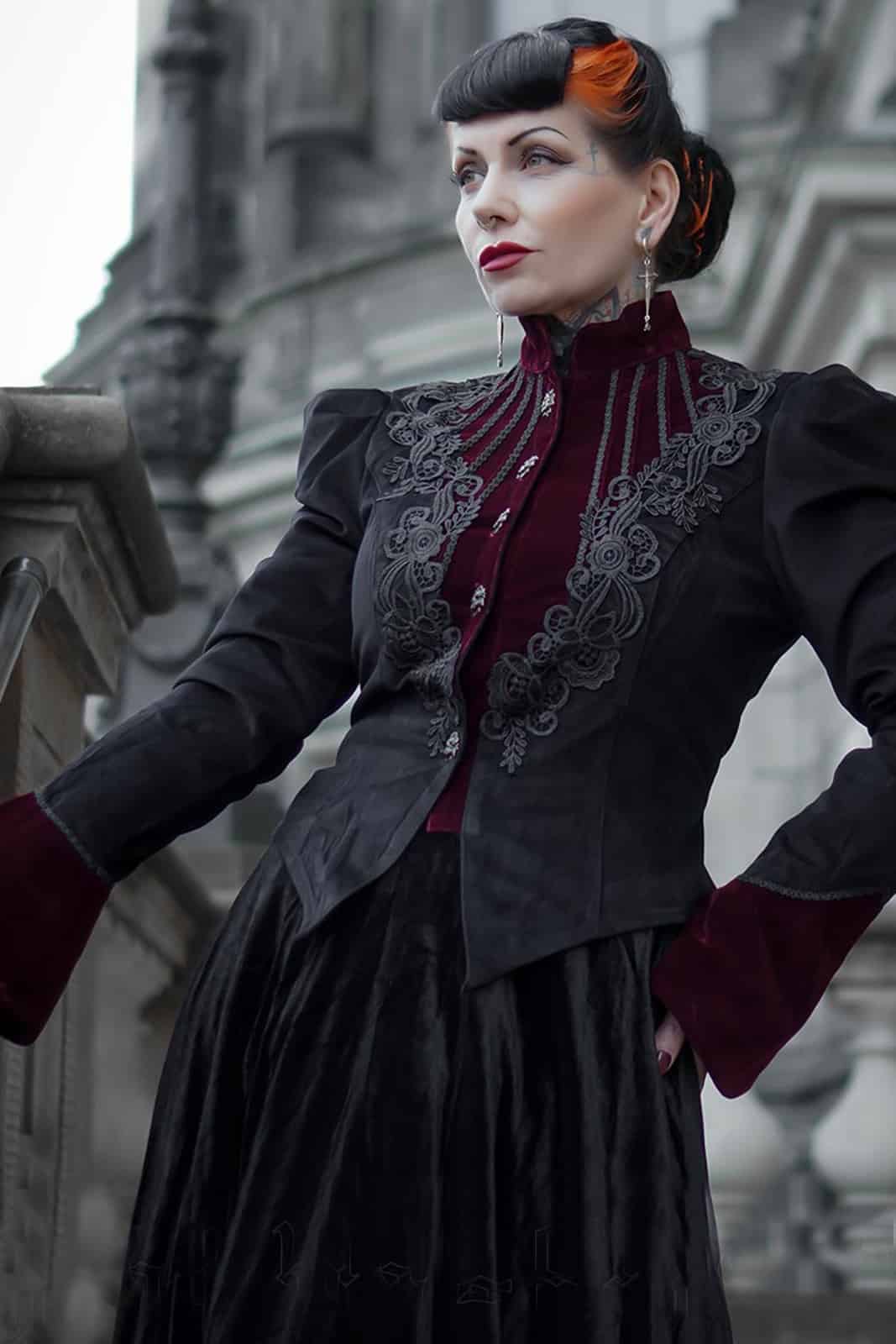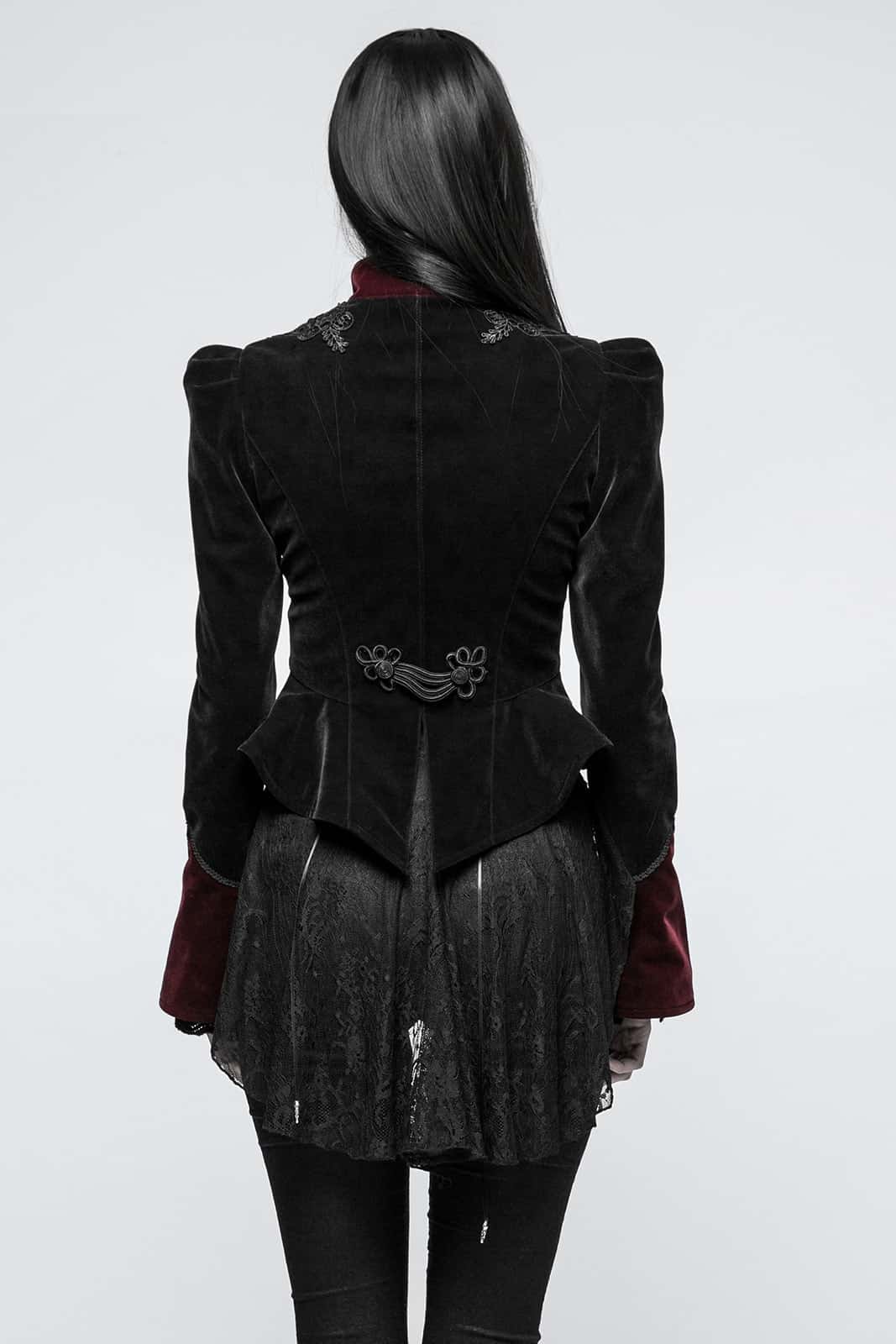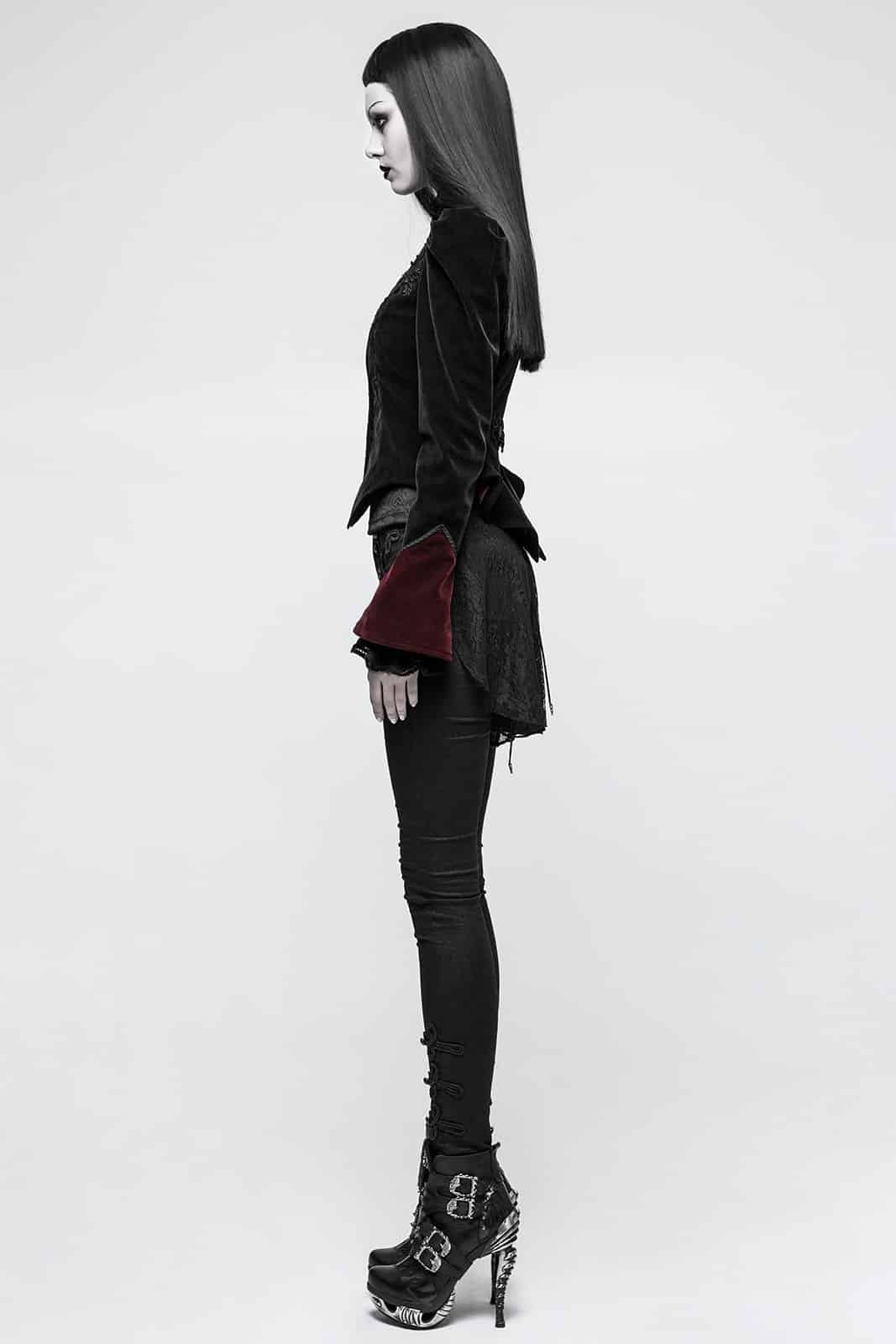 Die Fleur De Lys Jacke von Punk Rave ist ein Meisterwerk viktorianisch-gotischer Mode und vereint aristokratische Eleganz mit dramatischer Silhouette. Gefertigt aus edlem schwarzem und dunkelrotem Twill-Samt schmiegt sich die Jacke in fein strukturierter Optik an und verleiht jedem Auftritt einen majestätischen Charakter. Der hohe Kragen unterstreicht die Anmut und wird durch eine Knopfleiste mit dunkelsilbernen Rosenknöpfen akzentuiert. Zarte Blumenstickereien verlaufen in V-Form entlang der Vorderseite und betonen das Dekollete mit edlem Detailreichtum. Die markanten Leg O’Mutton Ärmel mit weit ausgestellten Samtmanschetten setzen einen dramatischen Akzent und lassen die Jacke wie ein Kleidungsstück aus vergangener Zeit wirken. Die taillierte Passform betont die Figur und geht nach unten in ein leicht ausgestelltes Schößchen über, das die viktorianische Anmut perfekt abrundet. Aus 100% Polyester gefertigt ist diese Jacke ideal für festliche Auftritte, viktorianische Events oder um jedem Gothic Outfit einen Hauch von königlicher Eleganz zu verleihen.