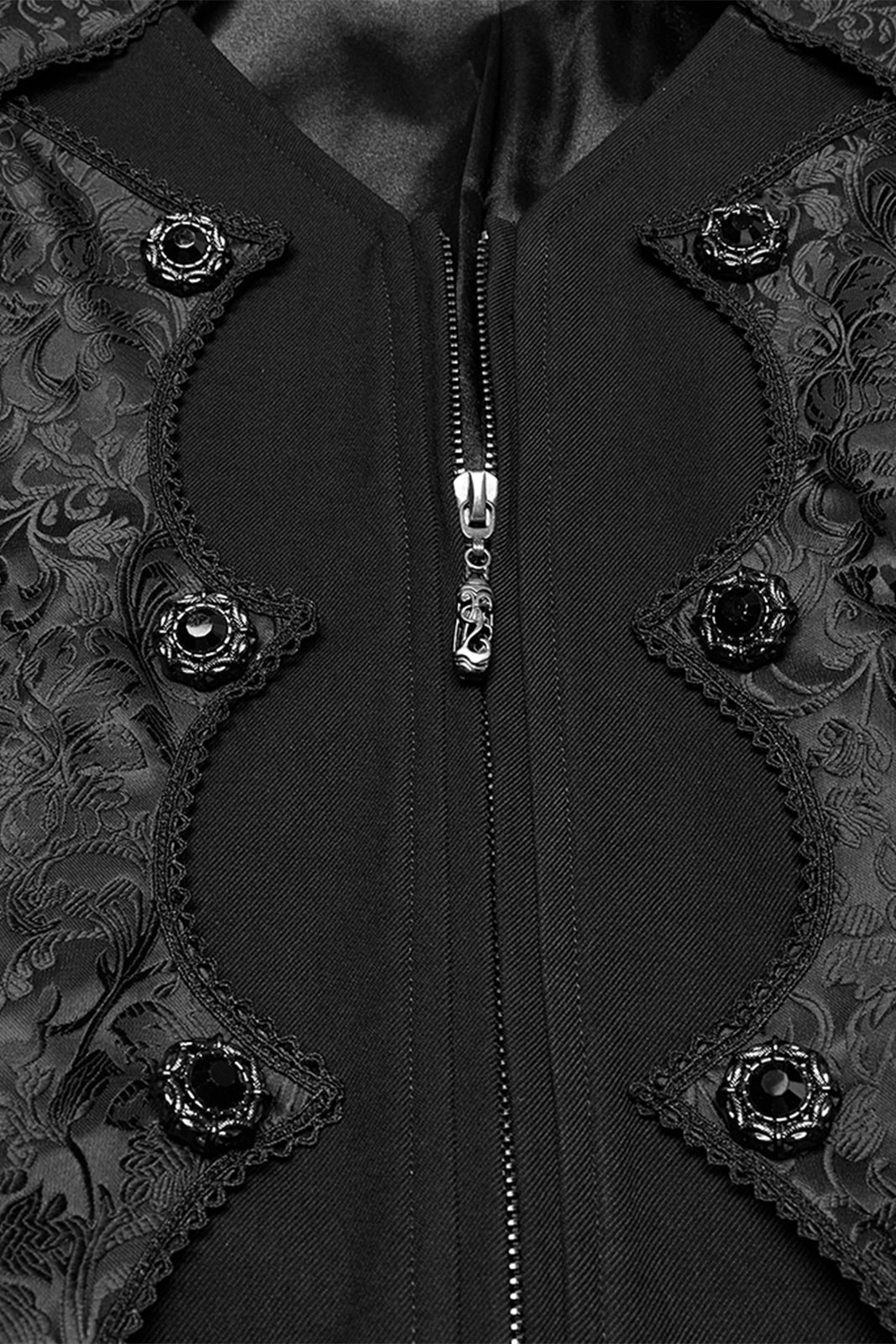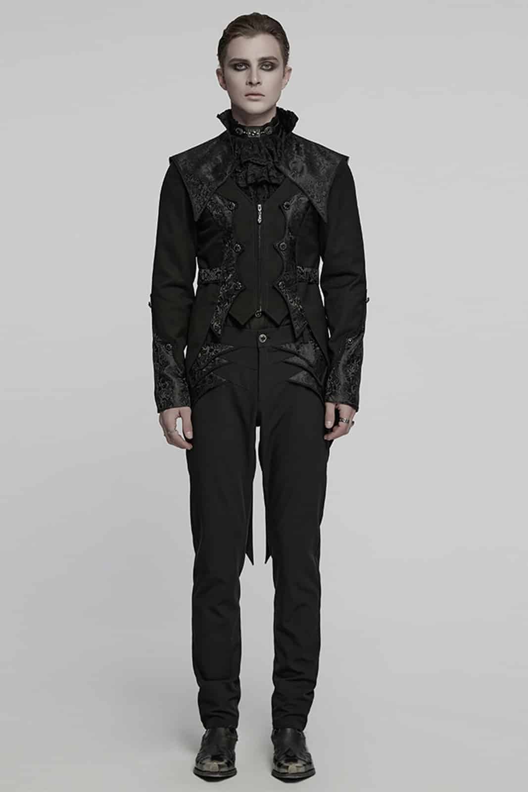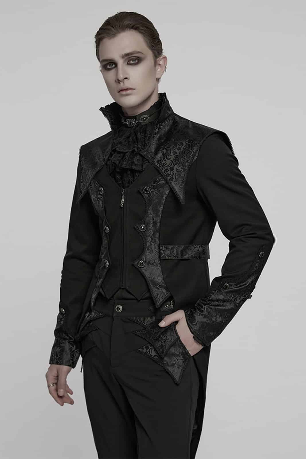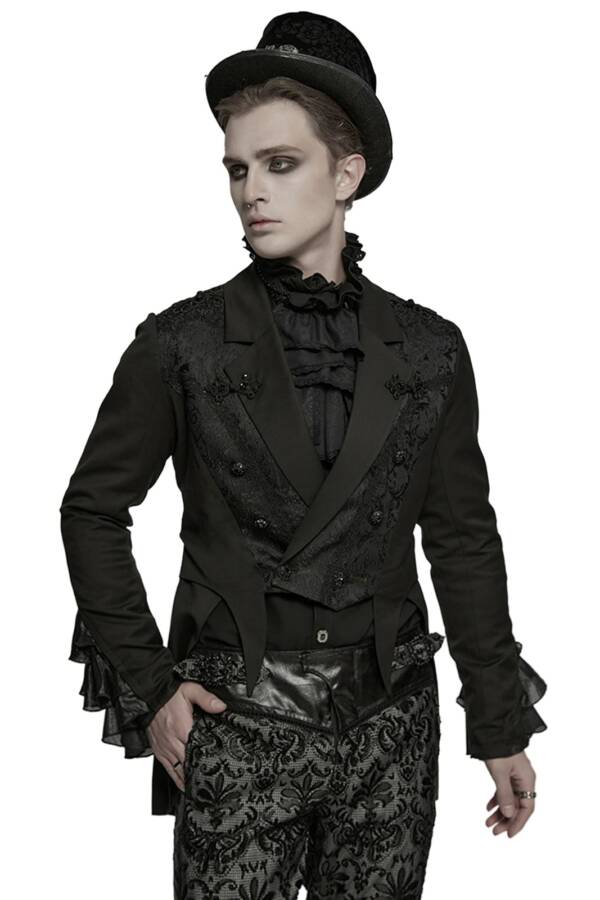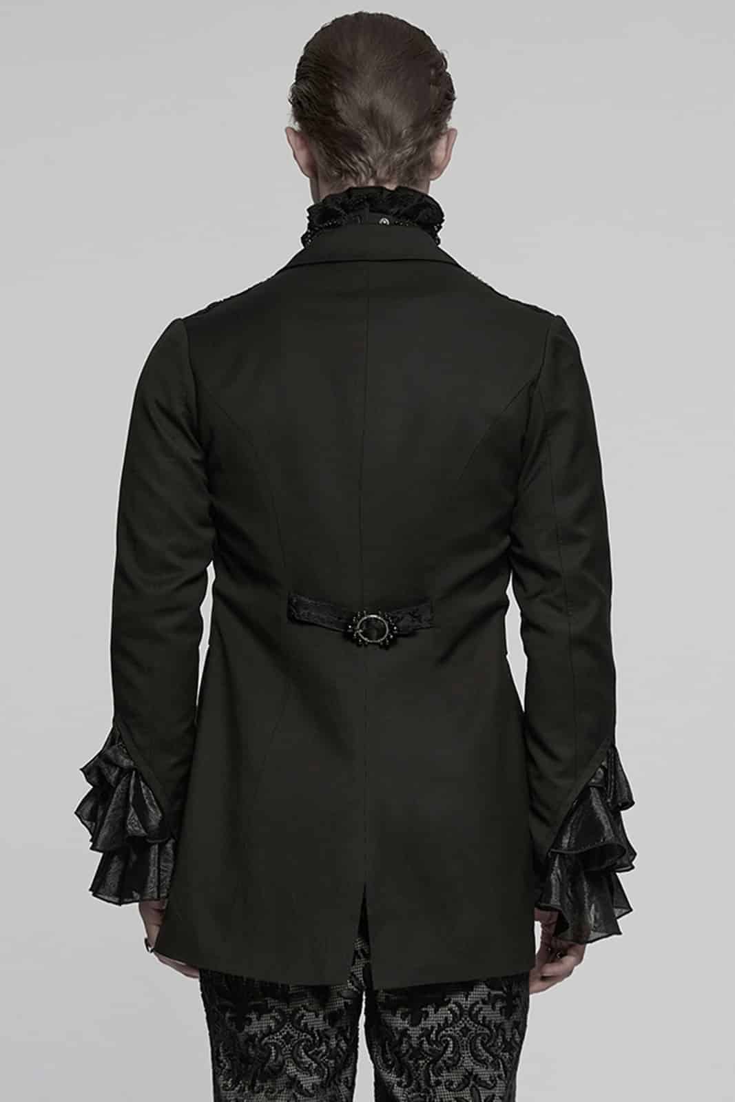 Eleganter viktorianischer Frack für Herren mit aufwendig gemusterten Jacquard-Einsätzen und feinen silbergravierten Knöpfen. Der figurbetonte Schnitt, der hohe Kragen und die dekorative Schnalle am Rücken verleihen diesem Gothic-Jacket einen edlen, aristokratischen Charakter.