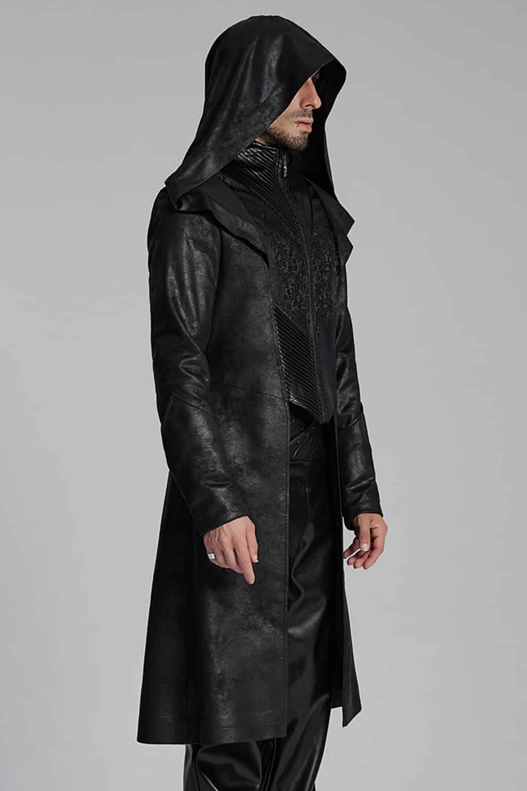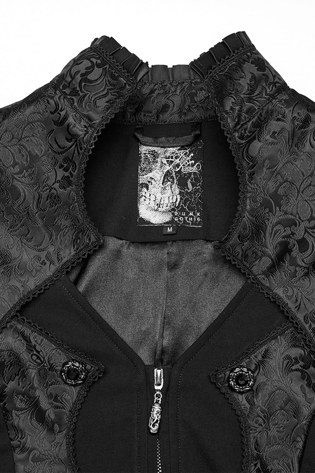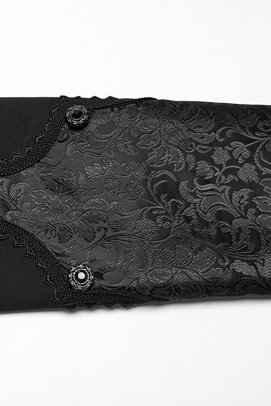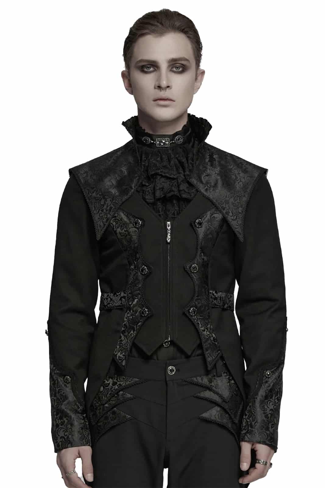 Eleganter viktorianischer Frack für Herren mit aufwendig gemusterten Jacquard-Einsätzen und feinen silbergravierten Knöpfen. Der figurbetonte Schnitt, der hohe Kragen und die dekorative Schnalle am Rücken verleihen diesem Gothic-Jacket einen edlen, aristokratischen Charakter.
