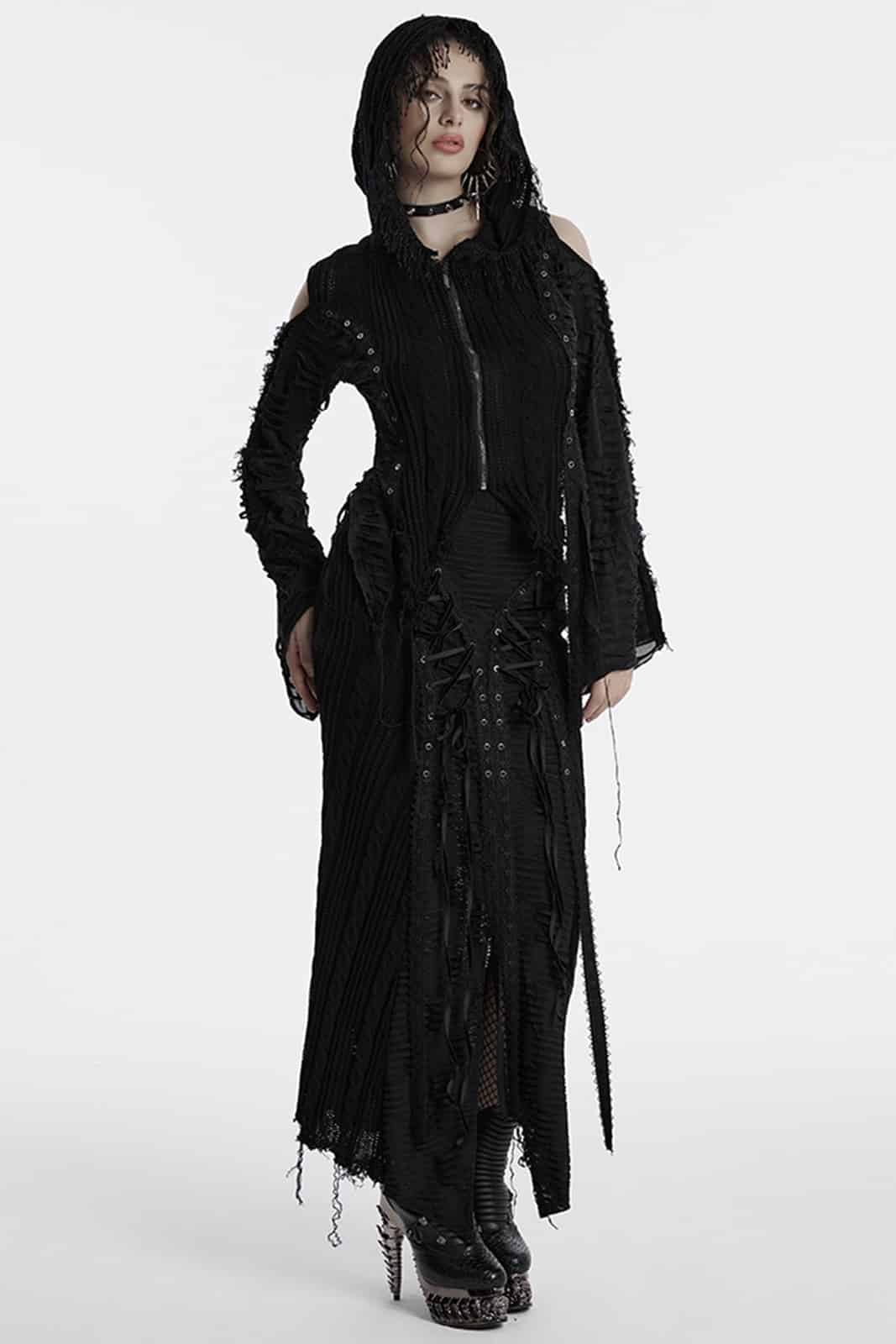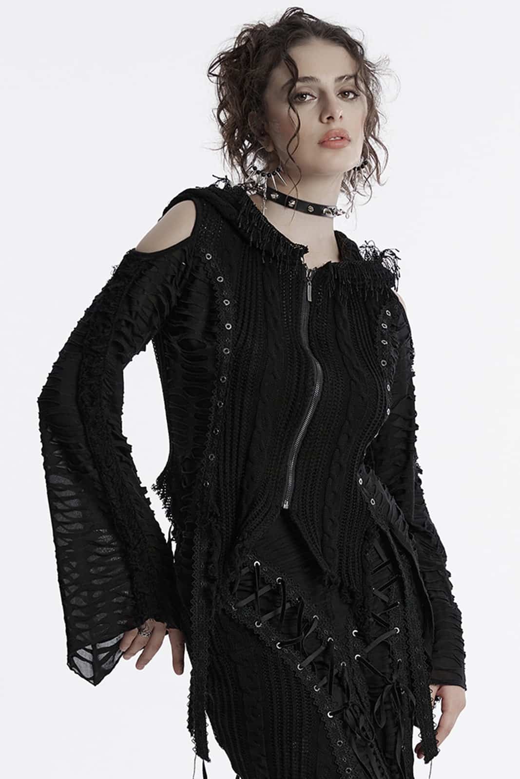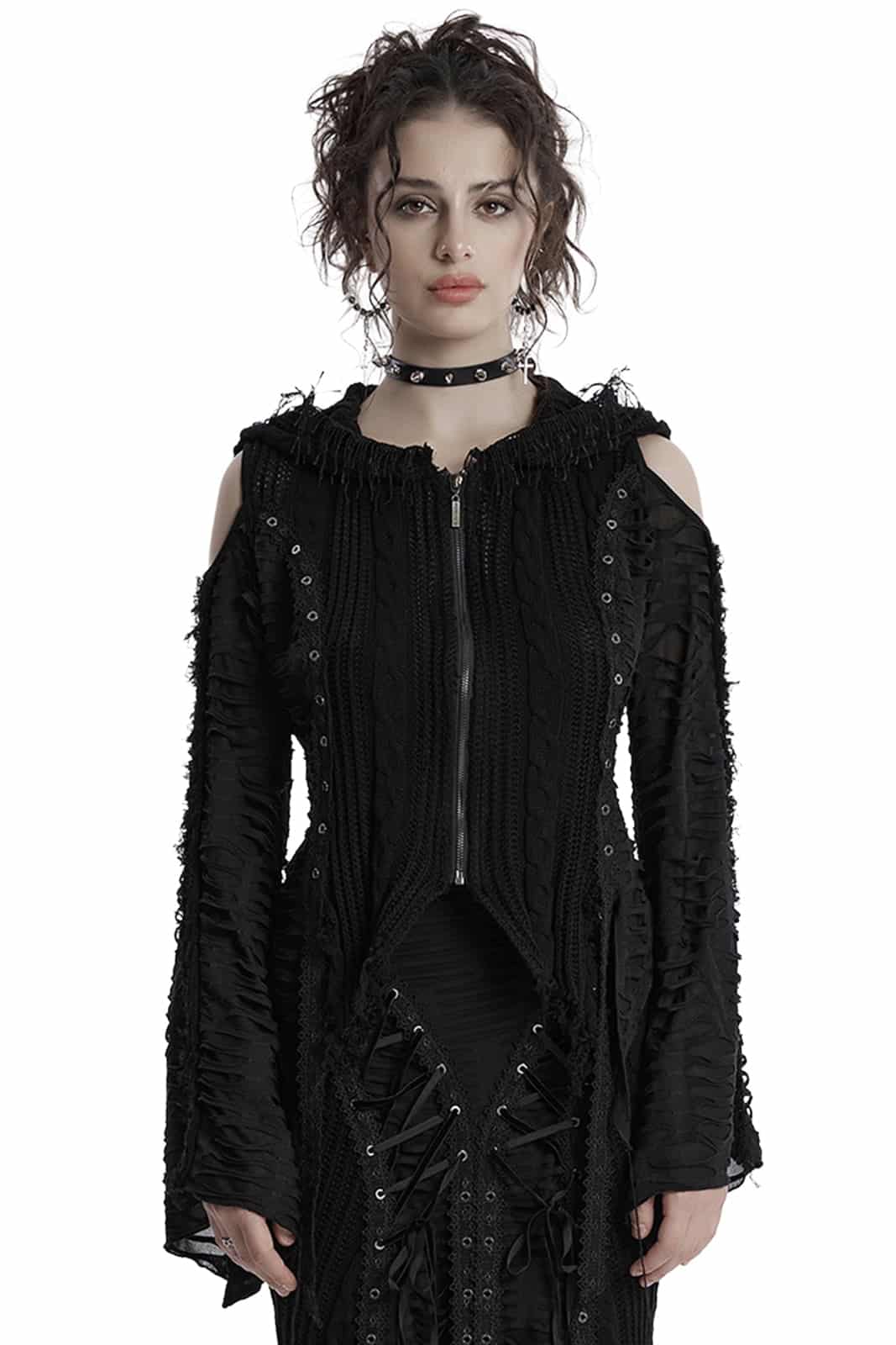 Das Misanthrope Distressed Zipper Hoodie von Punk Rave vereint düsteren Stil mit rebellischer Attitüde. Zerrissene Details und freiliegende Schultern verleihen dem Design eine raue, zugleich verführerische Note – perfekt für einen ausdrucksstarken Gothic-Look.