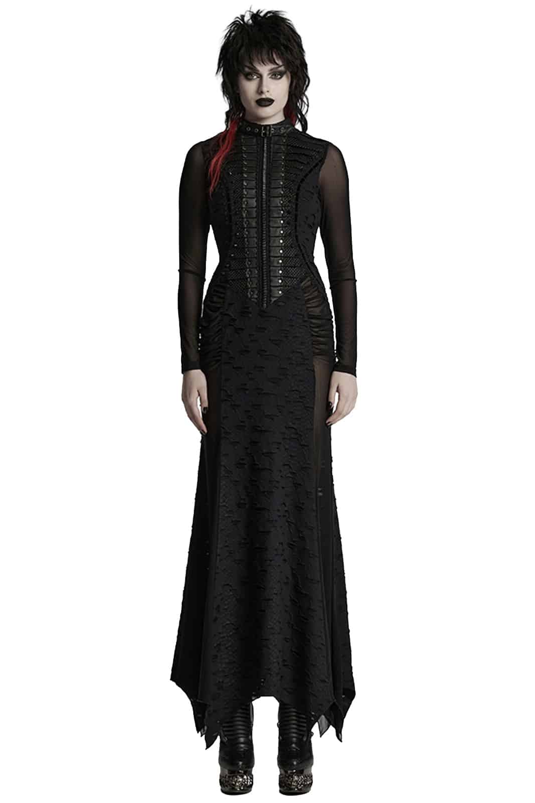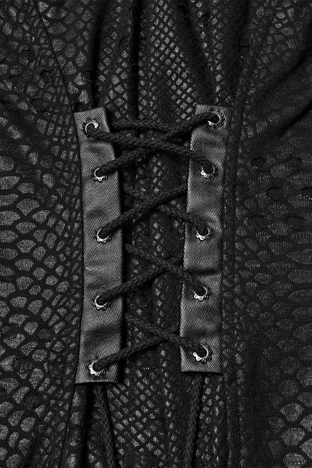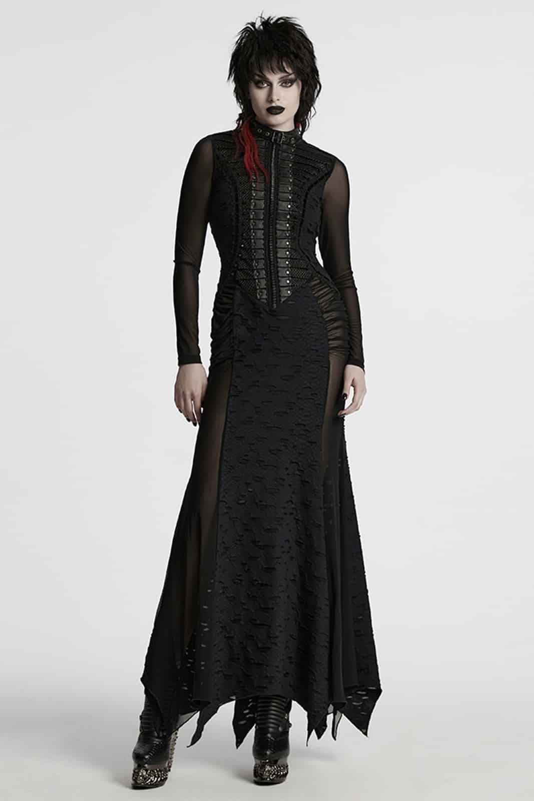Ein Kleid voller dunkler Eleganz: Eclipsa Noctis verbindet eine figurbetonte Meerjungfrauen-Silhouette mit kontrastreichen Stoffstrukturen für einen eindrucksvollen Gothic-Look. Das lange Design setzt auf eine Mischung aus Mesh, strukturiertem Reptil-Print-Jersey, Lederimitat und schwarzem Strukturstoff. Stud-Details, samtige Bänder, Falten entlang des Oberteils und der hohe Kragen mit Schnallenverschluss schaffen ein kraftvolles, geheimnisvolles Gesamtbild. Seitliche Raffung, ein markanter Zickzack-Saum und die Schnürung im Rücken runden das Design ab und ermöglichen eine perfekte Anpassung.