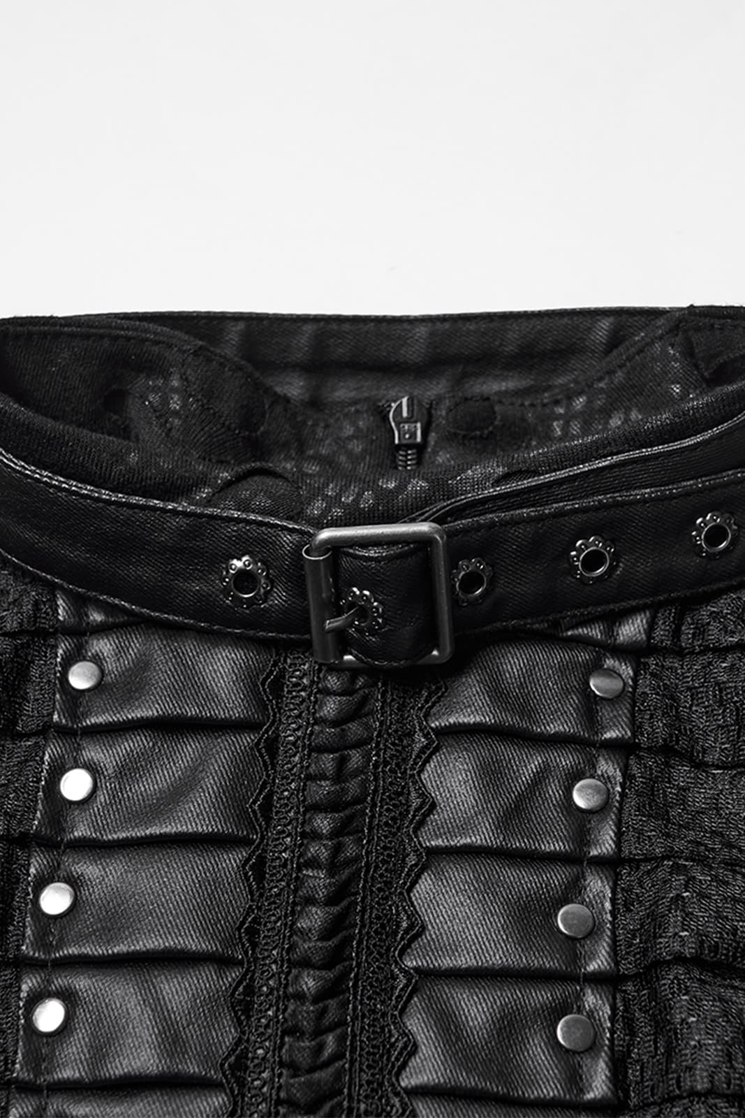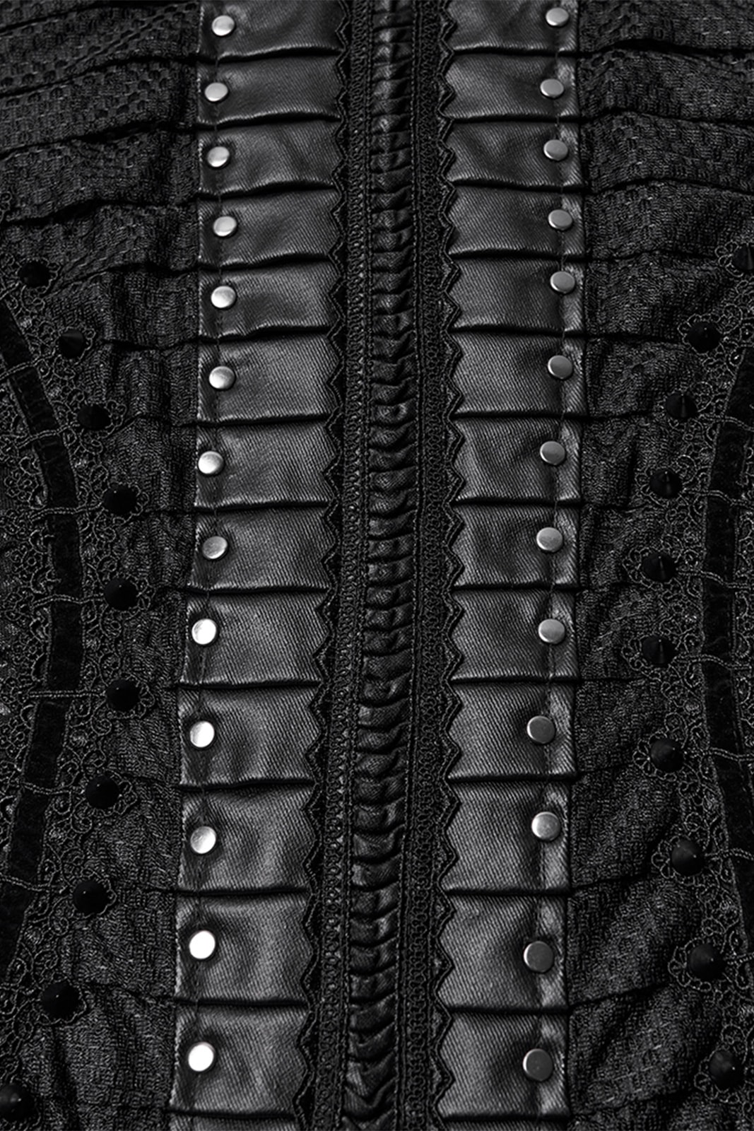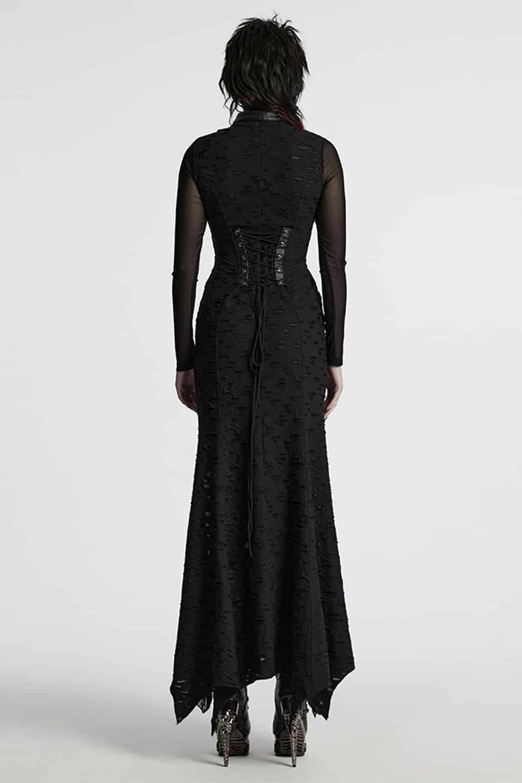 Ein Kleid voller dunkler Eleganz: Eclipsa Noctis verbindet eine figurbetonte Meerjungfrauen-Silhouette mit kontrastreichen Stoffstrukturen für einen eindrucksvollen Gothic-Look. Das lange Design setzt auf eine Mischung aus Mesh, strukturiertem Reptil-Print-Jersey, Lederimitat und schwarzem Strukturstoff. Stud-Details, samtige Bänder, Falten entlang des Oberteils und der hohe Kragen mit Schnallenverschluss schaffen ein kraftvolles, geheimnisvolles Gesamtbild. Seitliche Raffung, ein markanter Zickzack-Saum und die Schnürung im Rücken runden das Design ab und ermöglichen eine perfekte Anpassung.