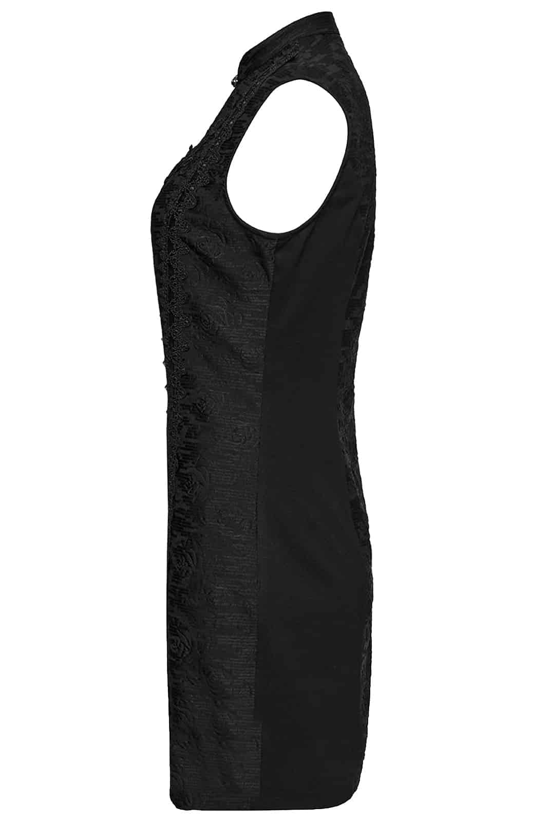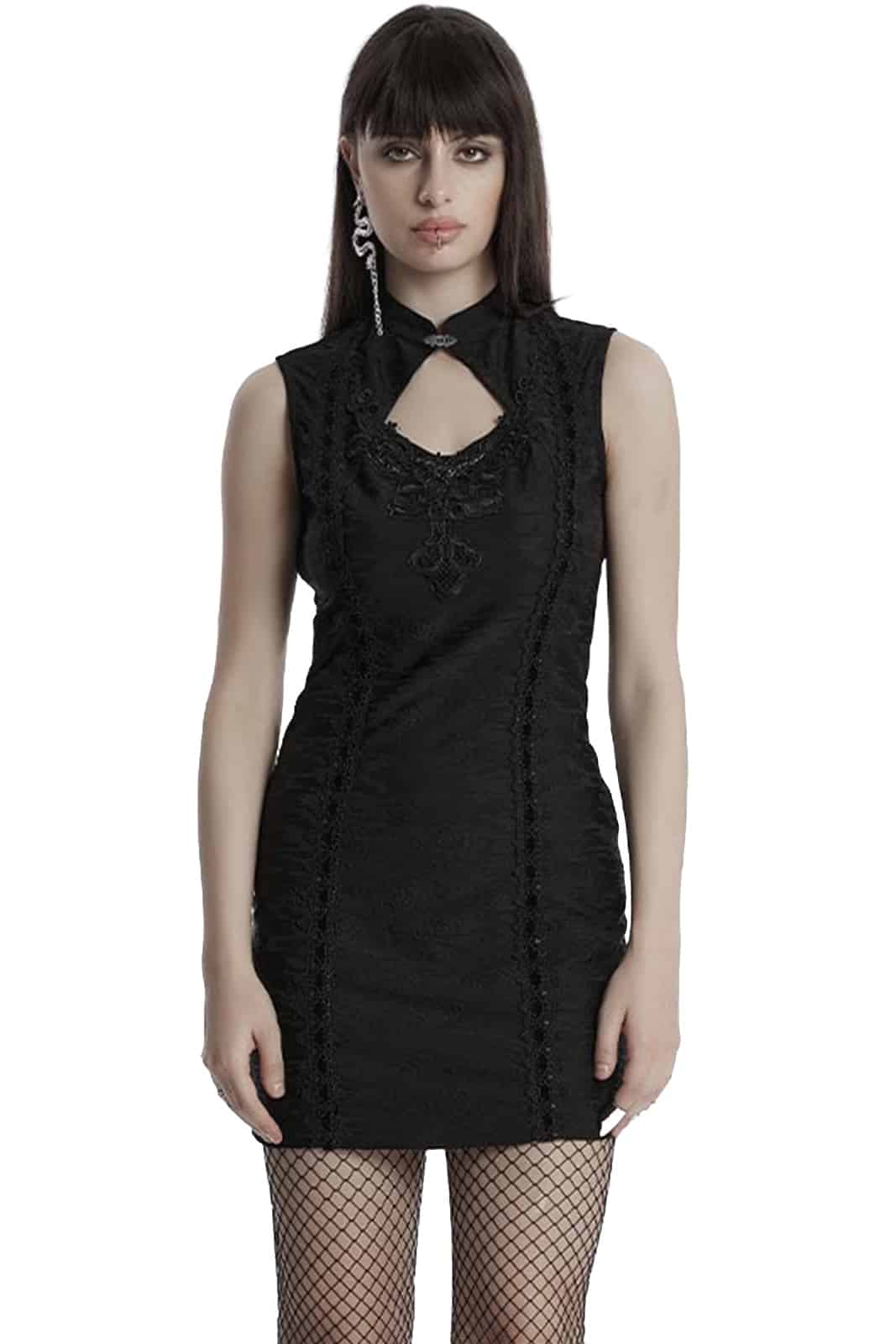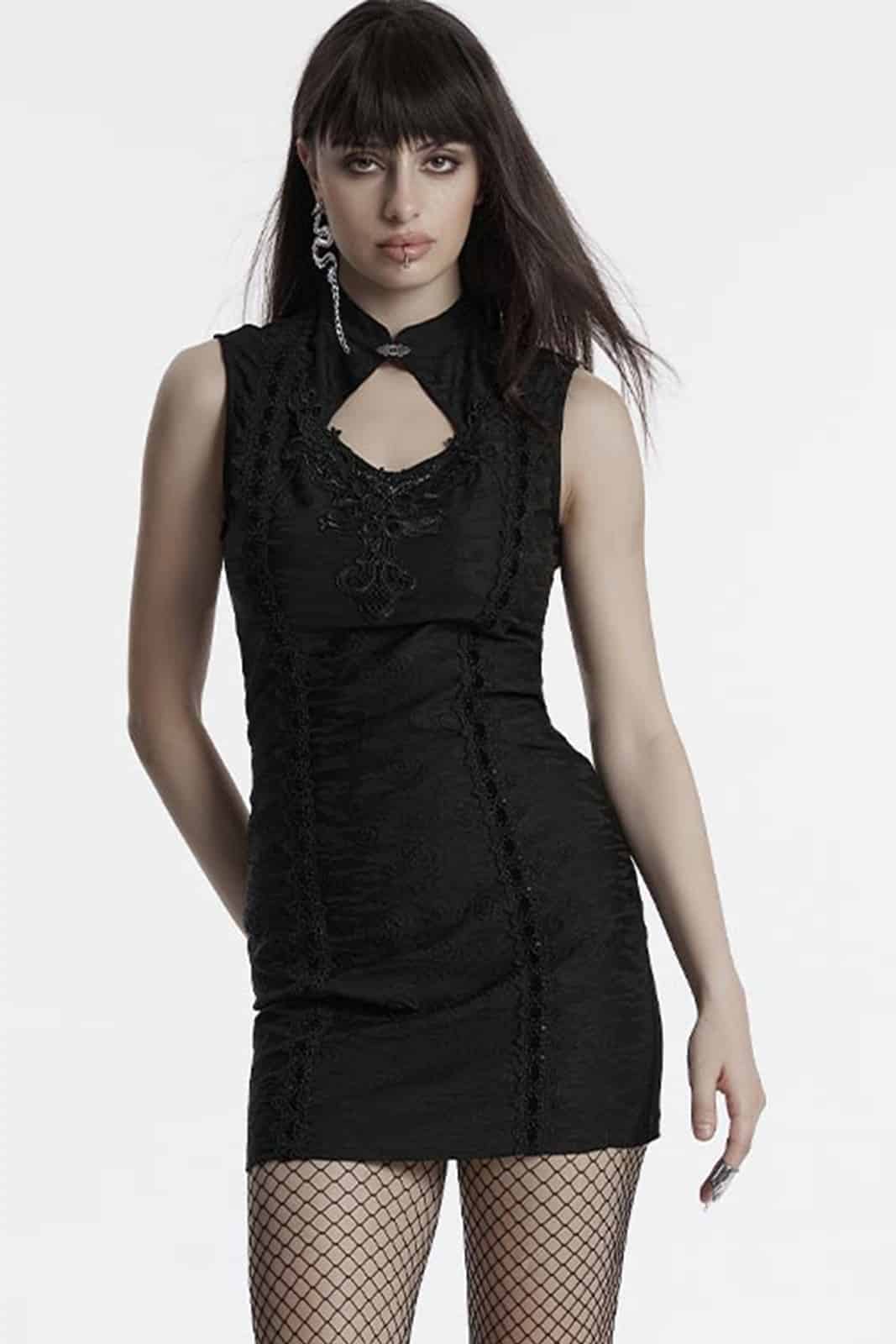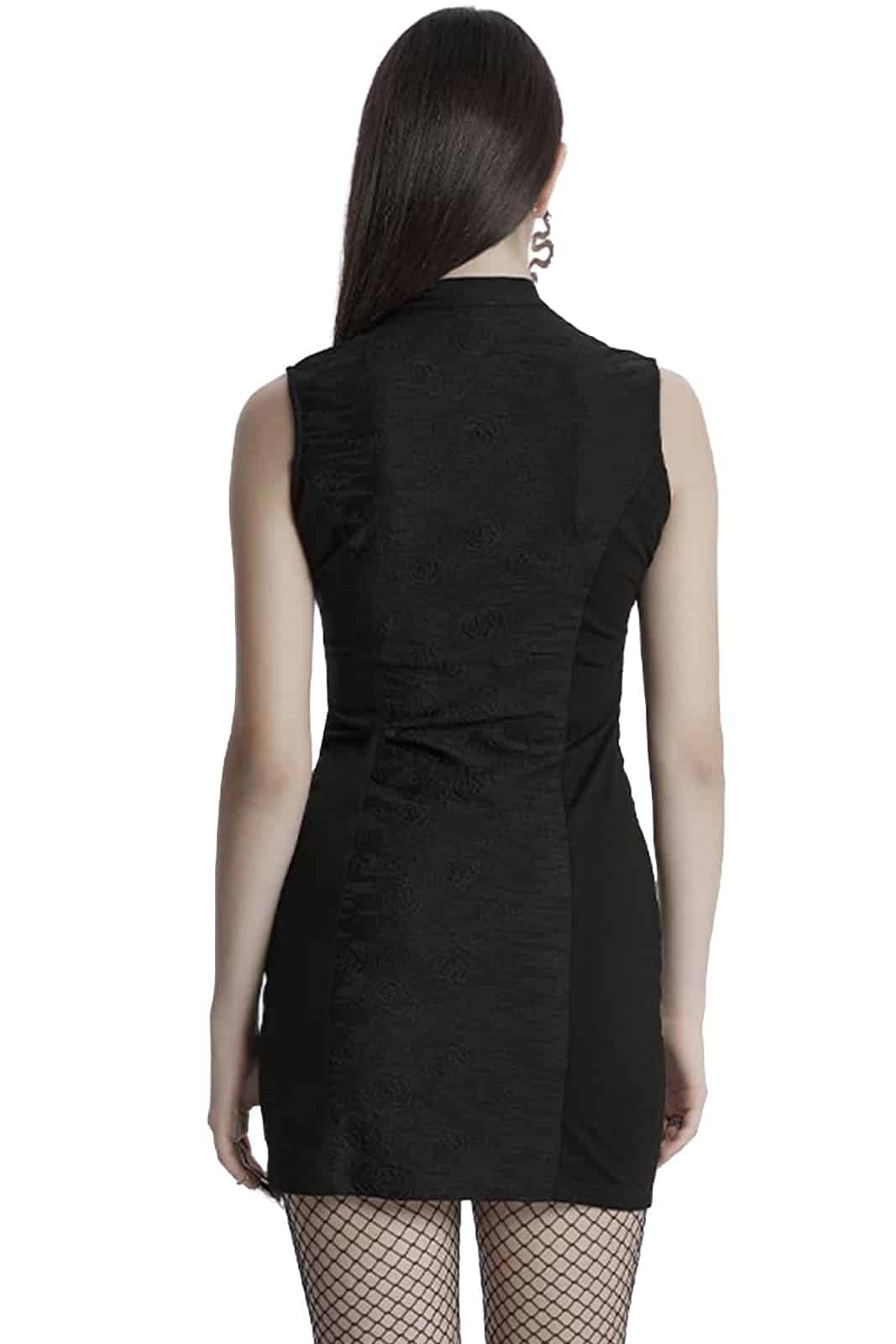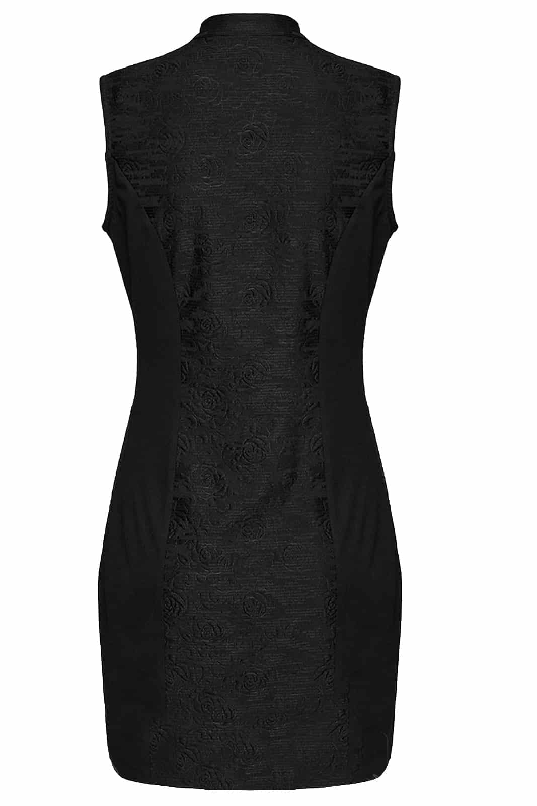 Das Rose Noir Kleid verbindet romantische Gothic-Ästhetik mit klarer, figurbetonter Eleganz. Das geprägte Rosenmuster, kunstvolle Spitzenapplikationen und der hohe Ausschnitt mit dekorativem Cut-out machen dieses ärmellose Mini-Kleid zu einem stilvollen Statement für besondere Anlässe, Clubnächte oder elegante Gothic-Looks.