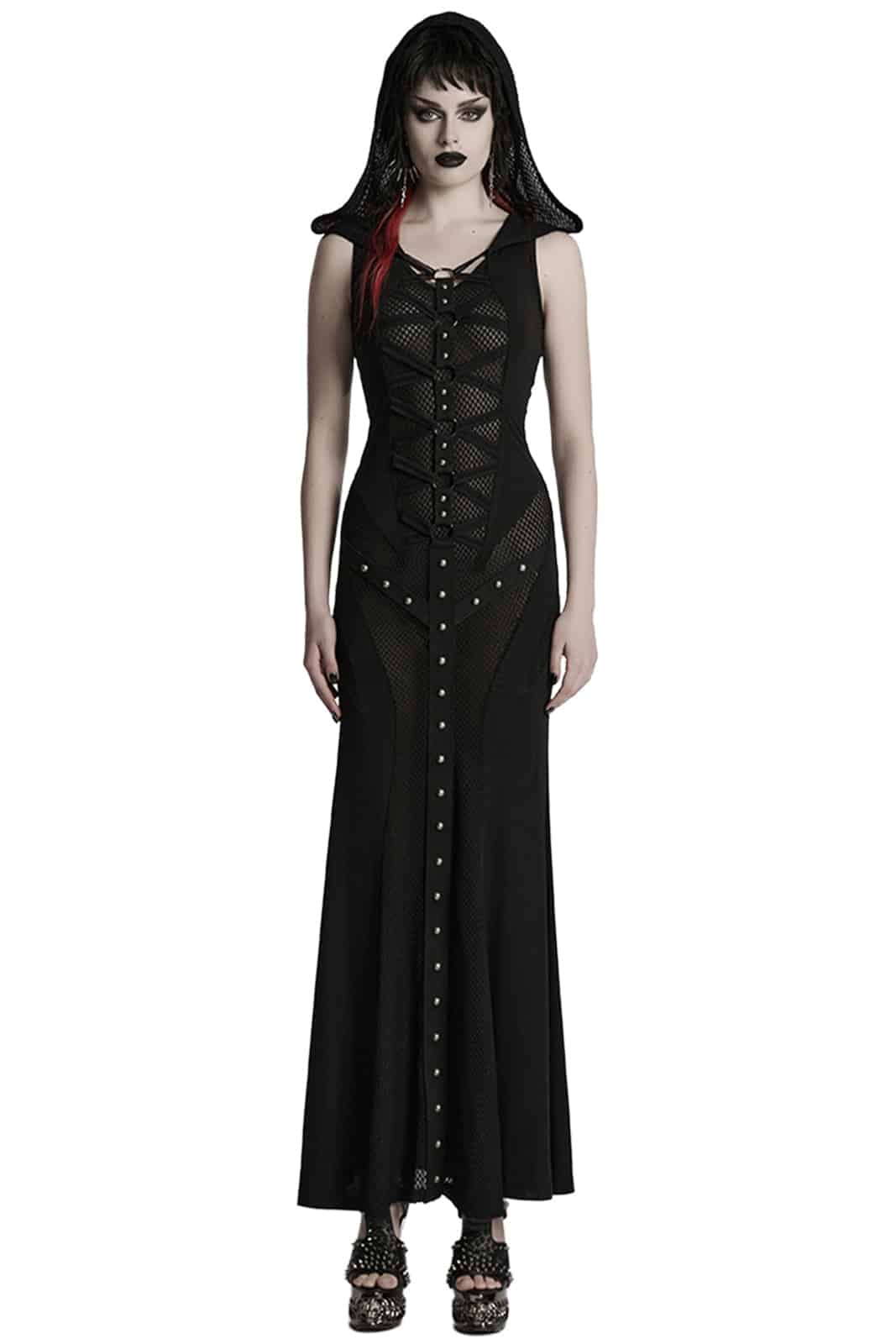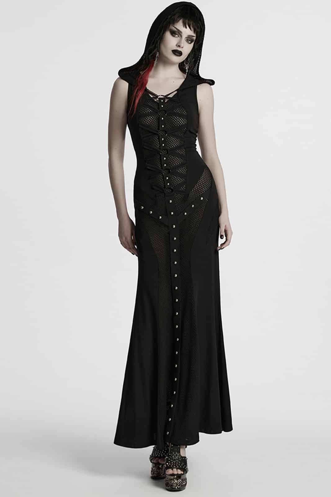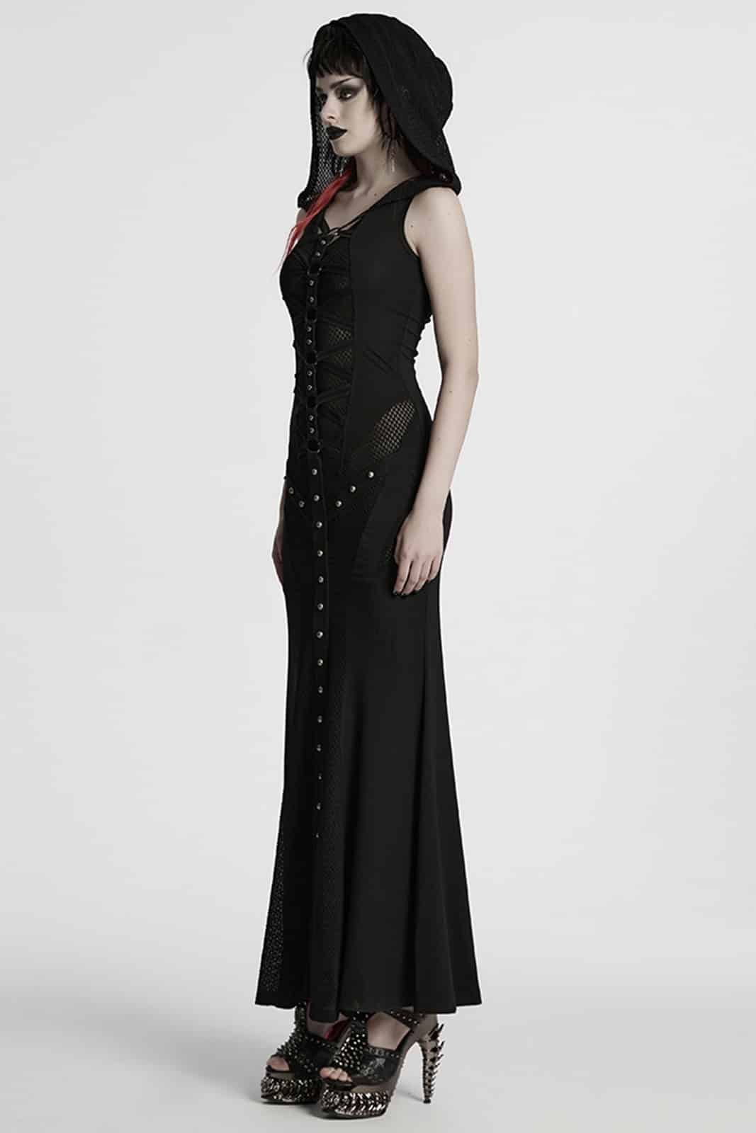 Elegantes Gothic-Maxikleid mit Kapuze, das durch seine figurbetonte Silhouette und raffinierte Details besticht. Mit einem hohen Beinschlitz, Cut-outs an der Taille und einem verstellbaren Rückenschnürsystem vereint es sinnliche Elemente mit dunkler Ästhetik. Das Kleid ist aus elastischem Material gefertigt, das sowohl Komfort als auch eine schmeichelhafte Passform bietet.