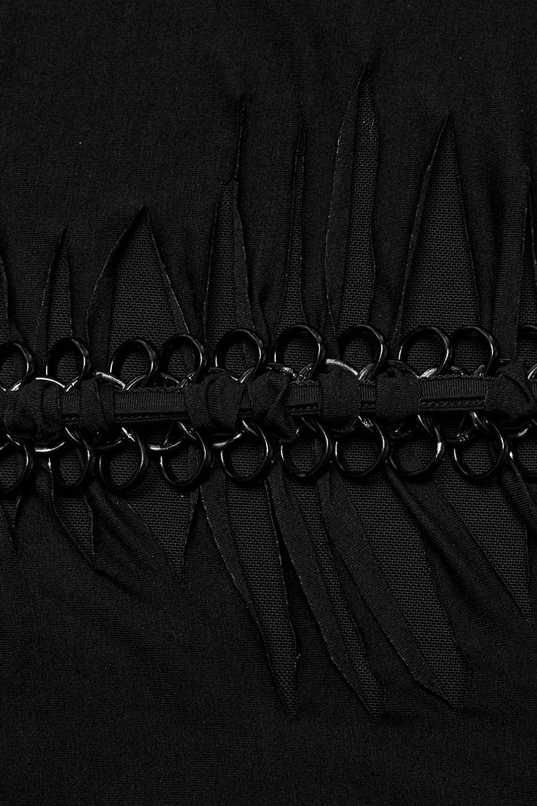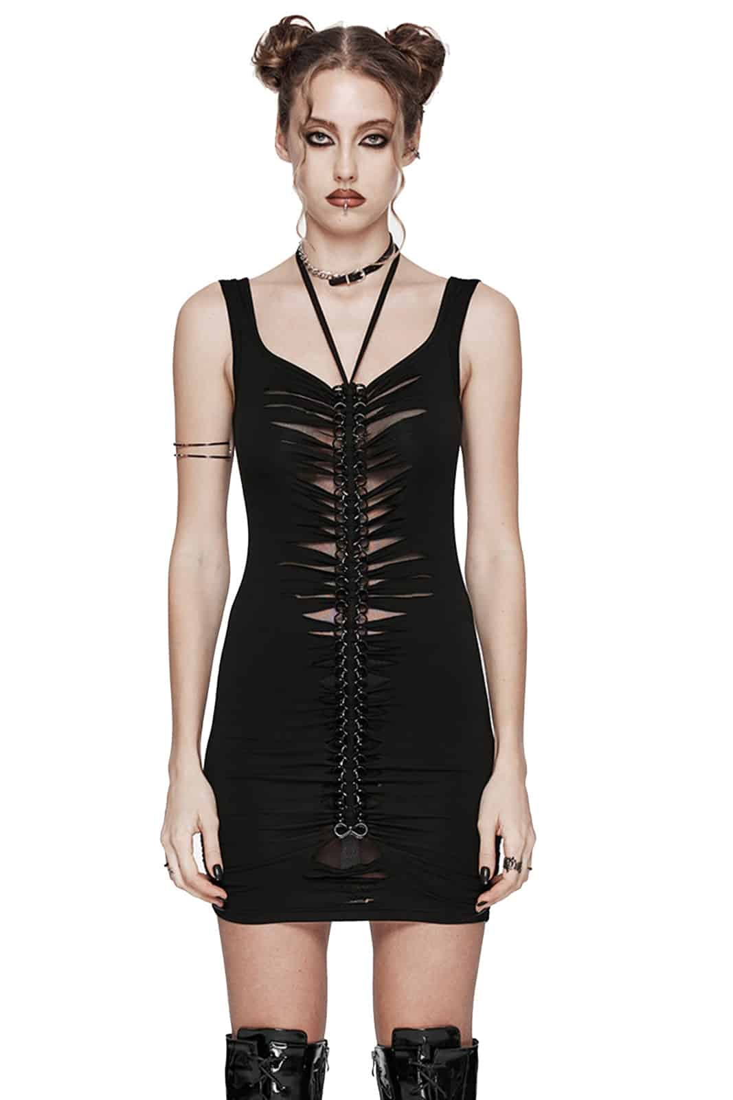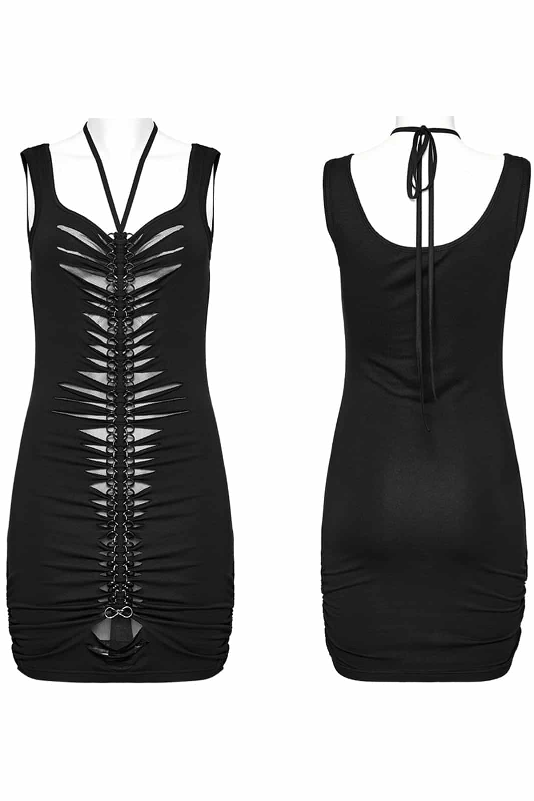 Ärmelloses, figurbetontes Gothic Minikleid mit Neckholder zum Binden und einem aufwändigen, mit Netz gefütterten Schlitzdekor, das als ausgeschnittenes und verdrehtes Bahnenteil mit eingewebtem Kettenhemd über die Vorderseite verläuft. Das Kleid passt sich dem Körper an und sorgt für eine schlanke Silhouette.