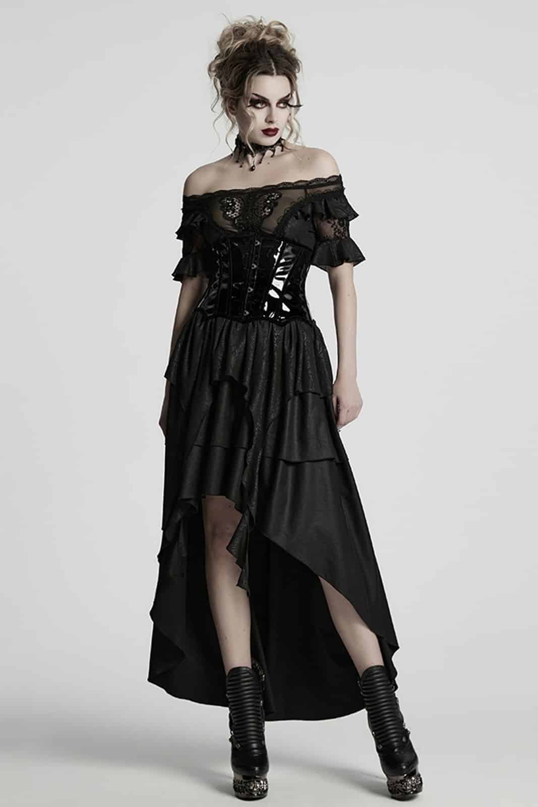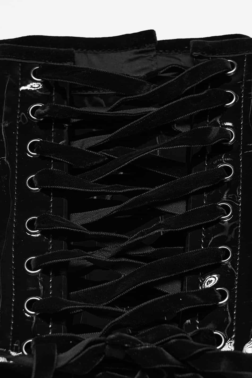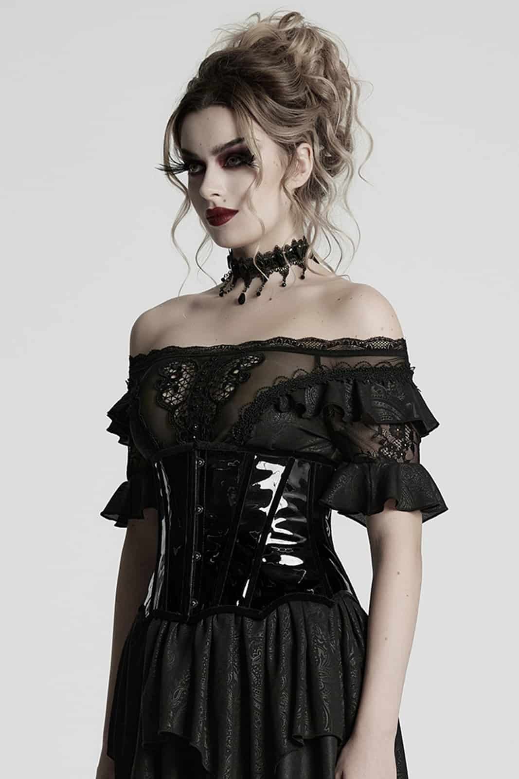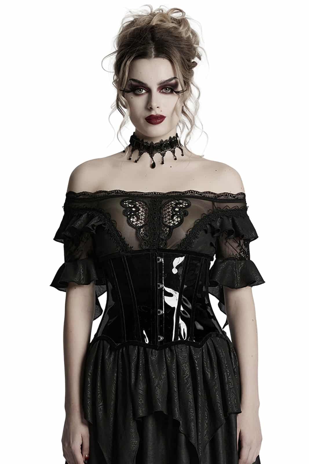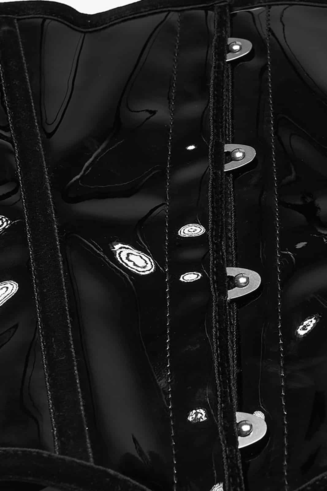Dieses tiefschwarze Unterbrustkorsett aus glänzendem PVC besticht durch seine klare Linienführung und eine kompromisslos elegante Ausstrahlung. Die Vorderseite ist mit einem robusten Hakenverschluss ausgestattet, der das An- und Ausziehen erleichtert, während die rückseitige Schnürung eine präzise Anpassung an die Körperform ermöglicht. Ideal für Liebhaber der Gothic-Mode, die ein vielseitiges Korsett suchen, das sowohl solo als auch in Kombination mit anderen Kleidungsstücken getragen werden kann.