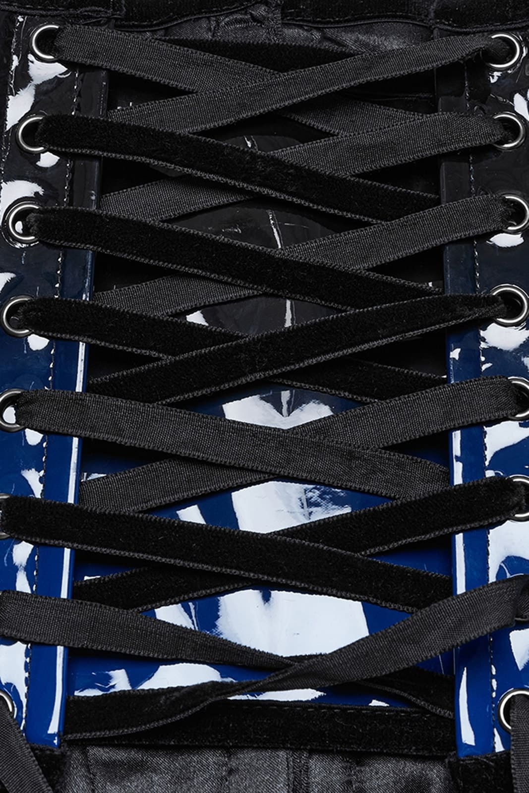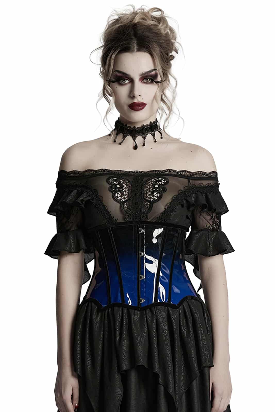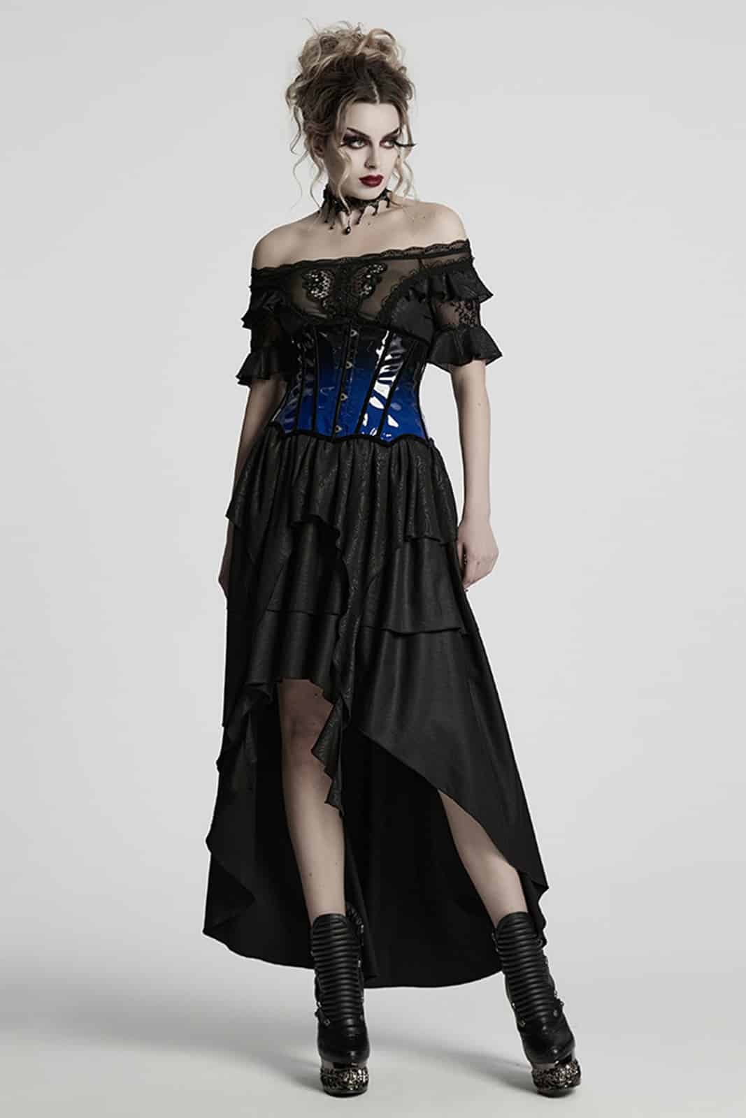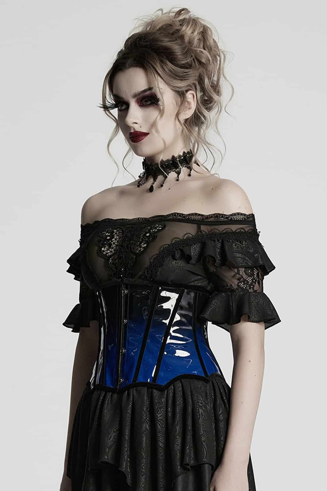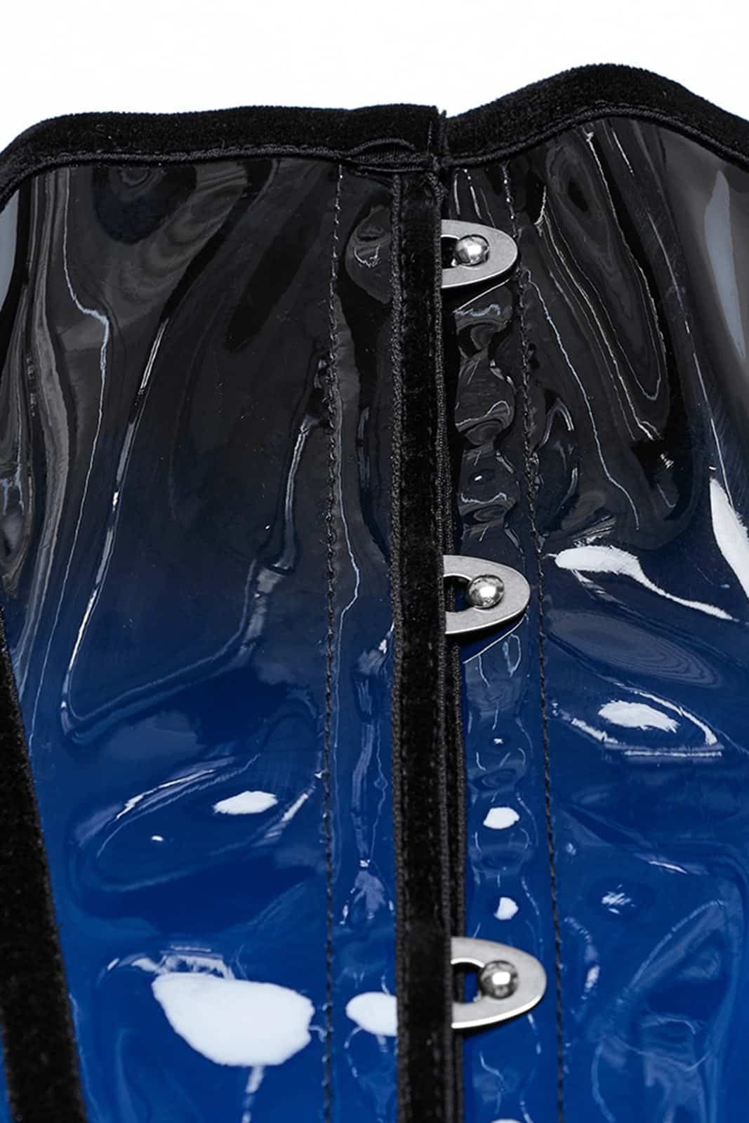 Ein glänzendes PVC-Unterbrust-Korsett in tiefem Schwarz mit auffälligen blauen Kontrasten, das klassische Silhouettenführung mit einer provokanten, modernen Attitüde verbindet. Vorn sorgt ein stabiler Hakenverschluss für einfaches An- und Ausziehen, während die rückseitige Schnürung eine individuelle Passform ermöglicht und die Taille perfekt in Szene setzt. Das auffällige Design verleiht jedem Outfit einen dramatischen Akzent – ideal für einen selbstbewussten Auftritt in der Welt der Gothic-Mode.
