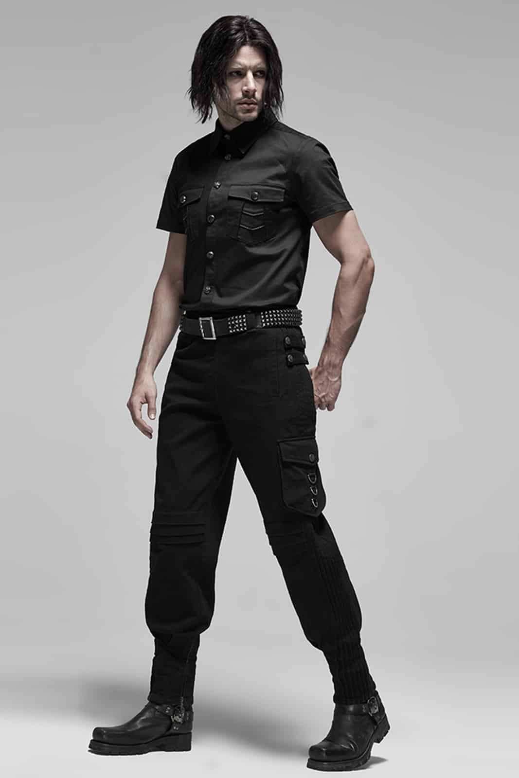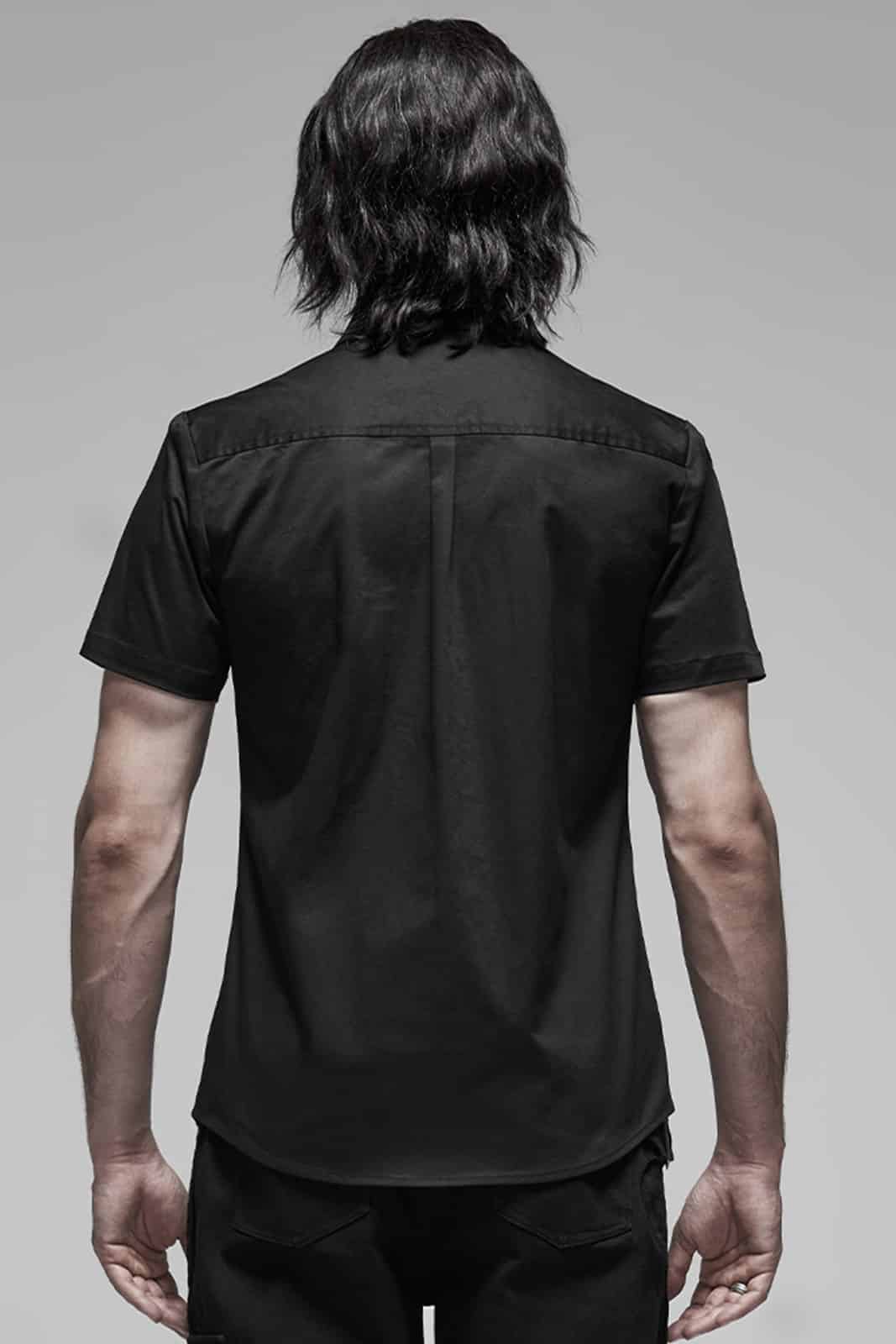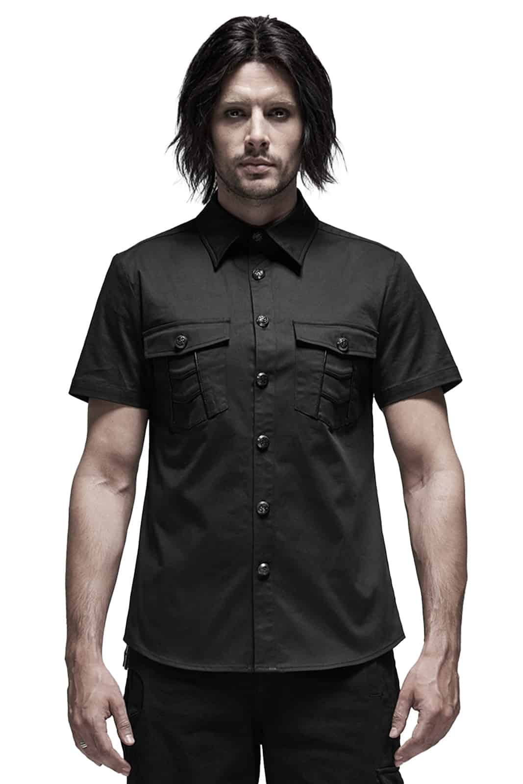 Aus hochwertigem Baumwollstoff gefertigt kommt das Kurzarmhemd Detroit im Militär-Gothic-Stil. Besetzt mit zwei Brusttaschen mit Patte. Verziert mit Kunstlederpaspeln an den Taschen. Die Front wird mit schwarzen Emaille-Knöpfen verschlossen.