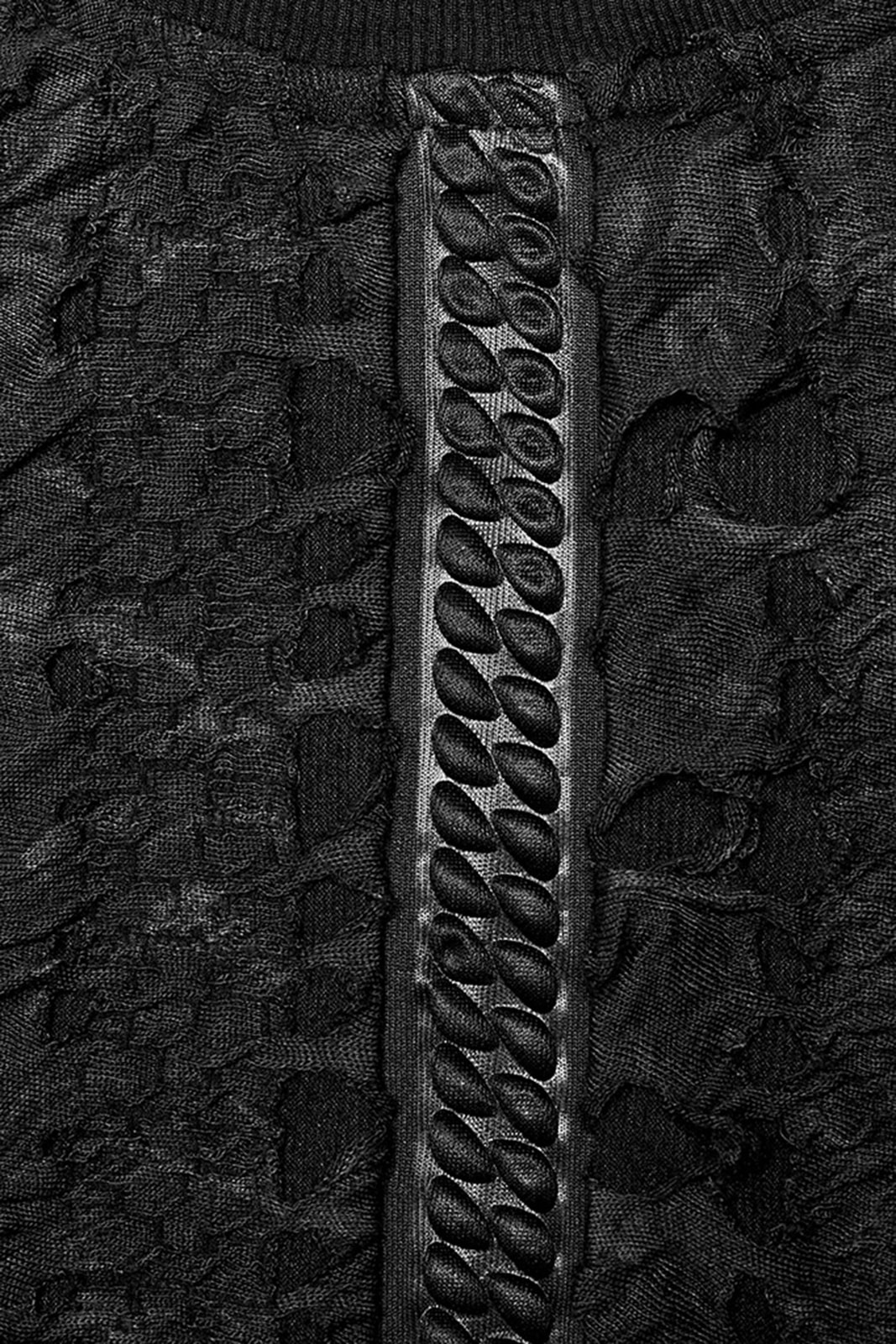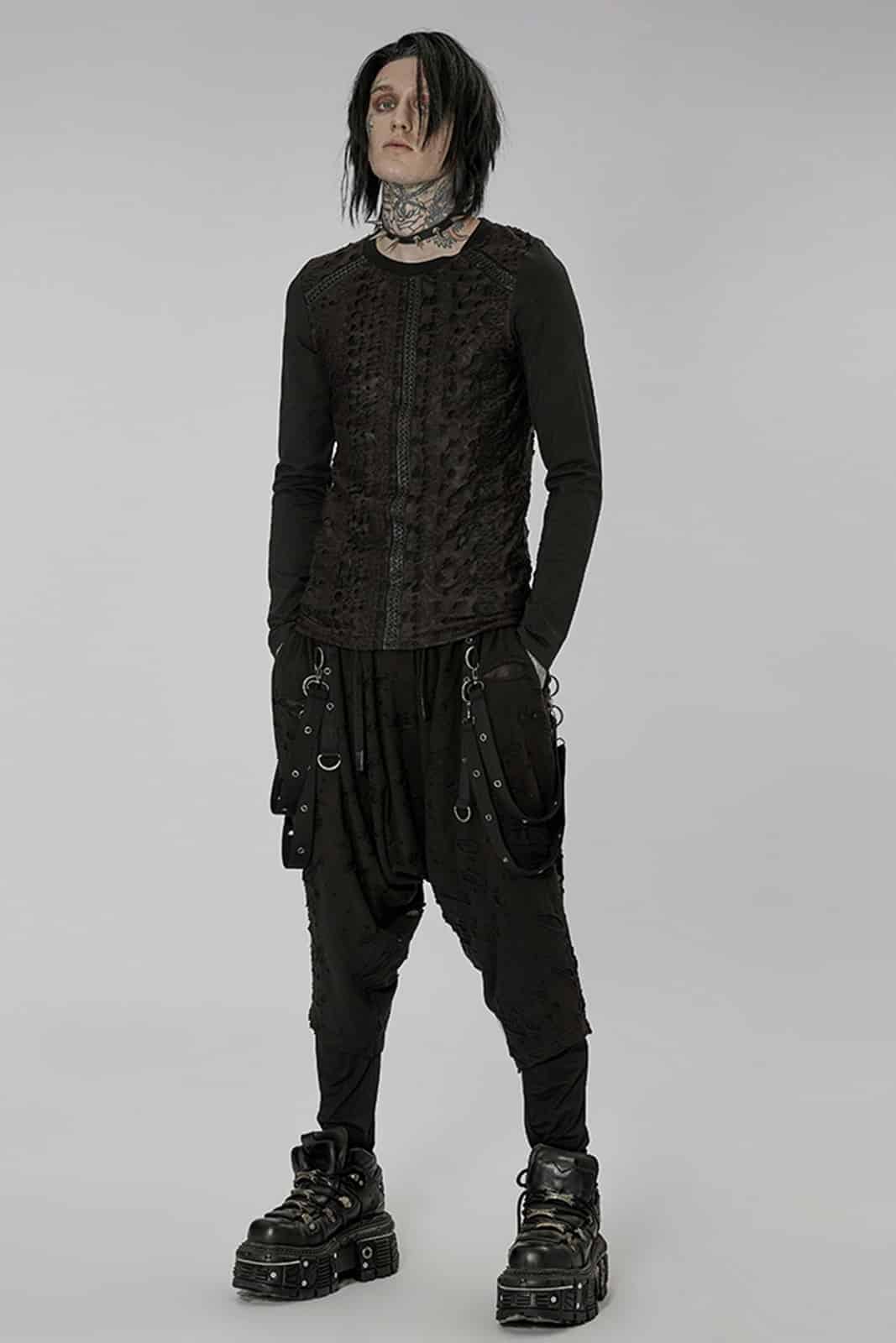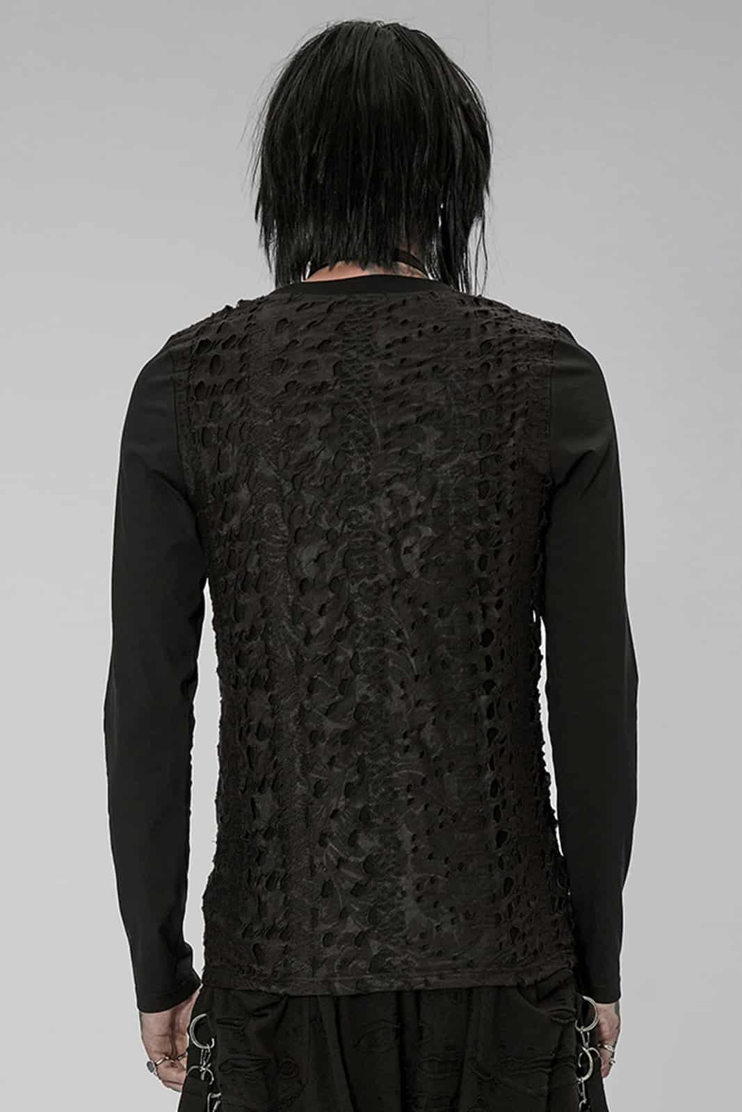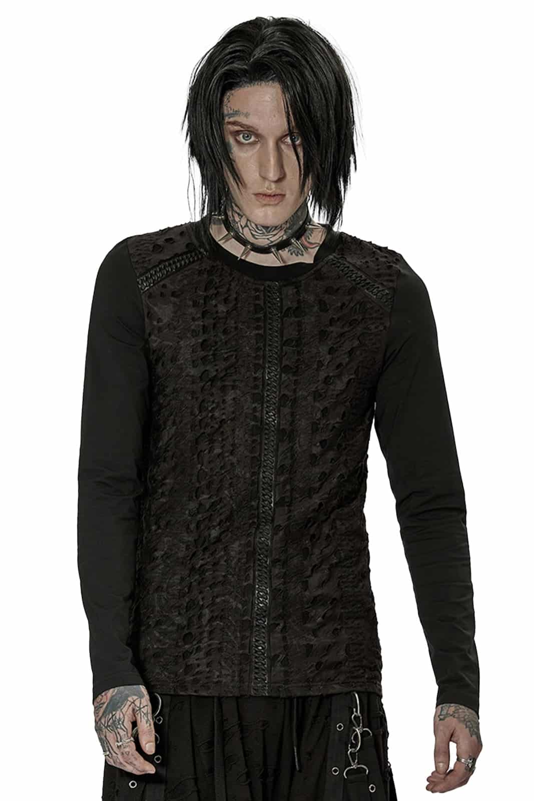Langarmshirt im Gothic Used-Look aus schwarzem strukturiertem Jersey-Stoff mit Rundhalsausschnitt. Der Schnitt ist figurbetont und enganliegend. Für einen loose fit gerne einen Nummer größer bestellen.