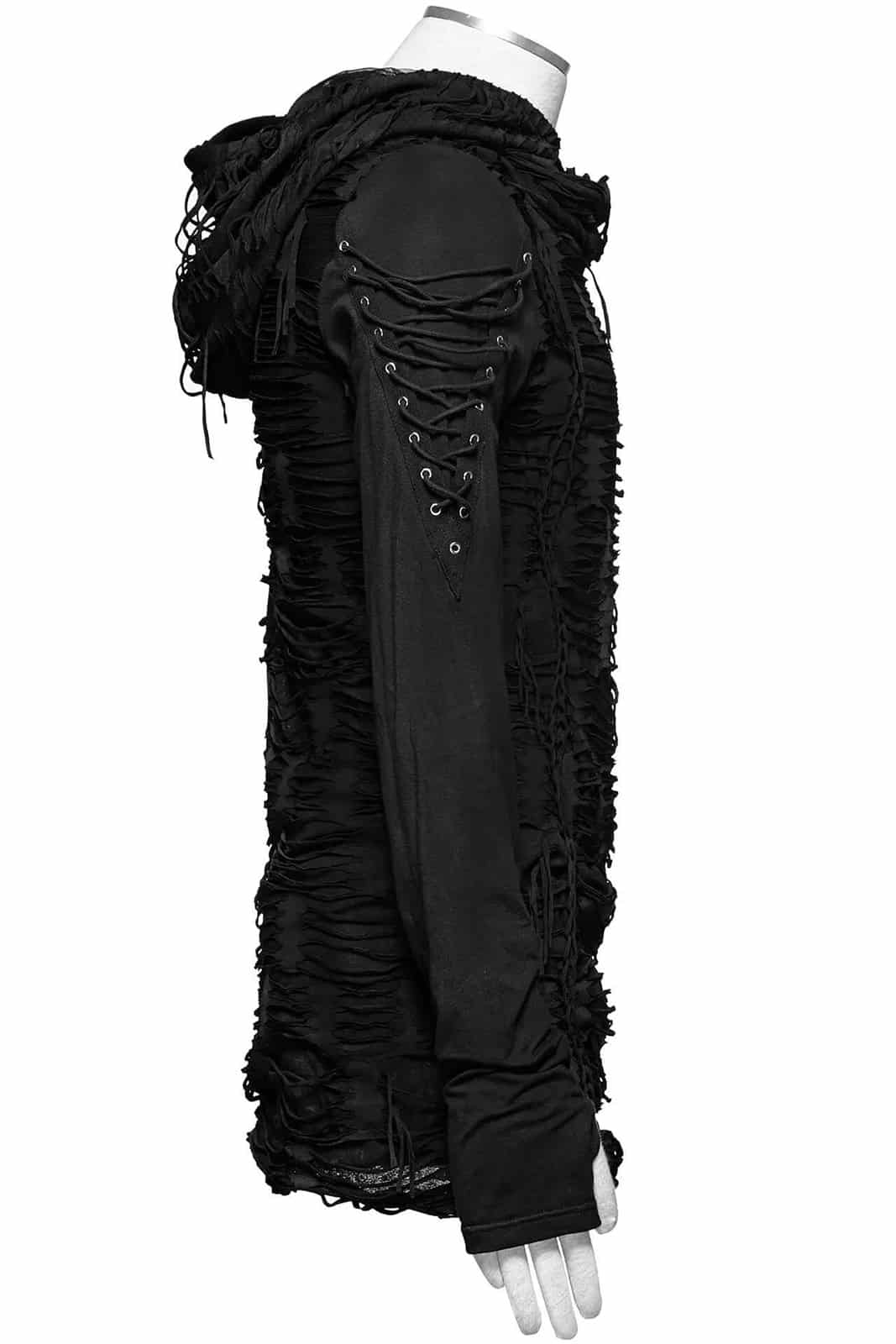 Schwarzes Langarmshirt im postapokalyptischen Distressed-Style mit übergroßer Kapuze unde Zierschnürungen an den Ärmeln. Die langen Ärmel sind mit Daumenlöchern versehen.