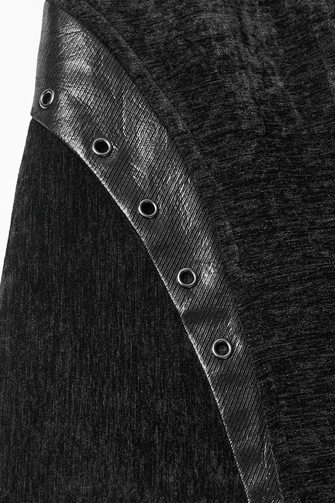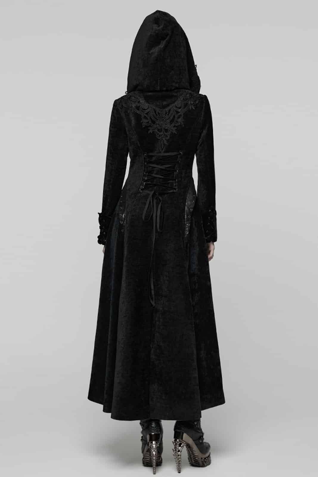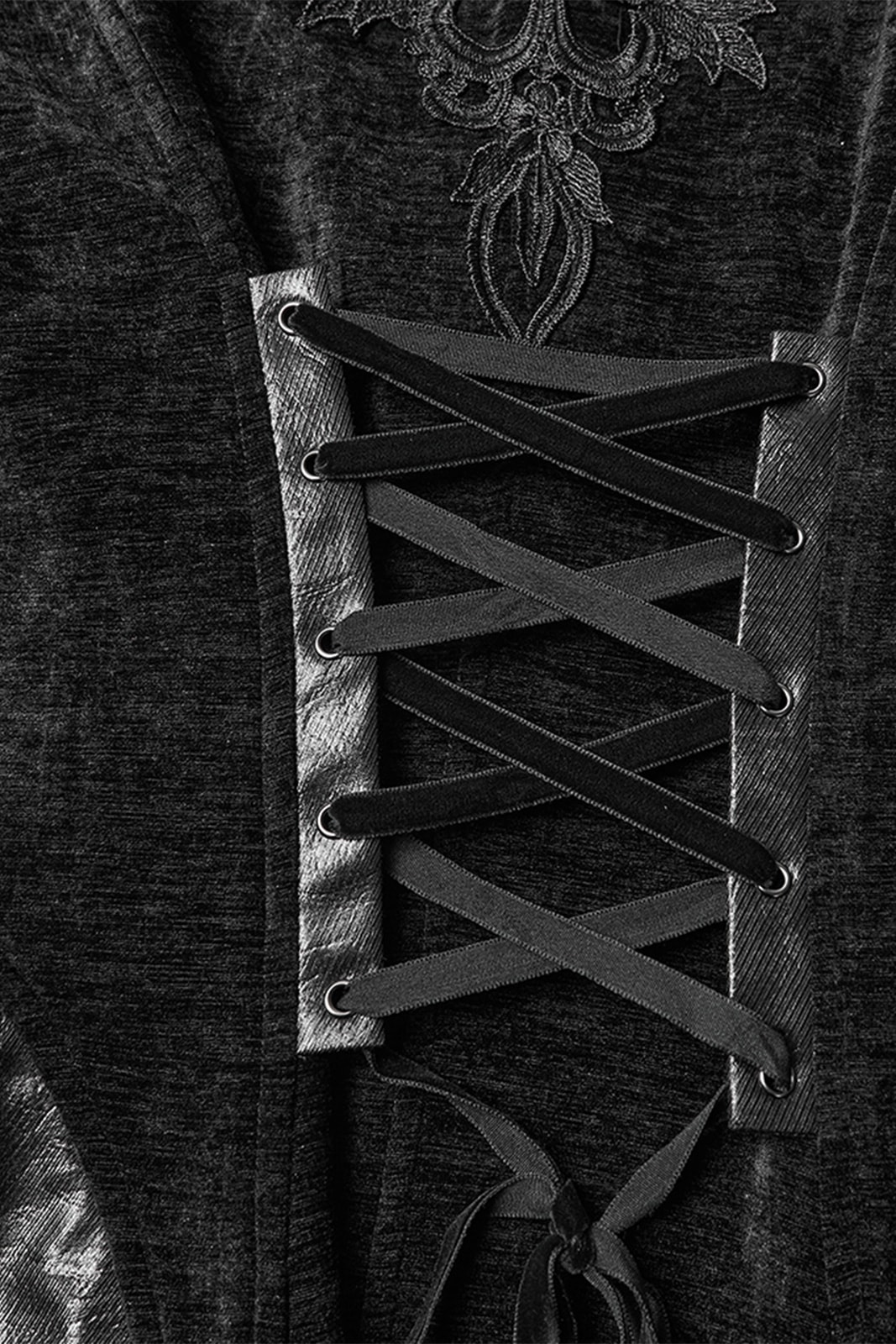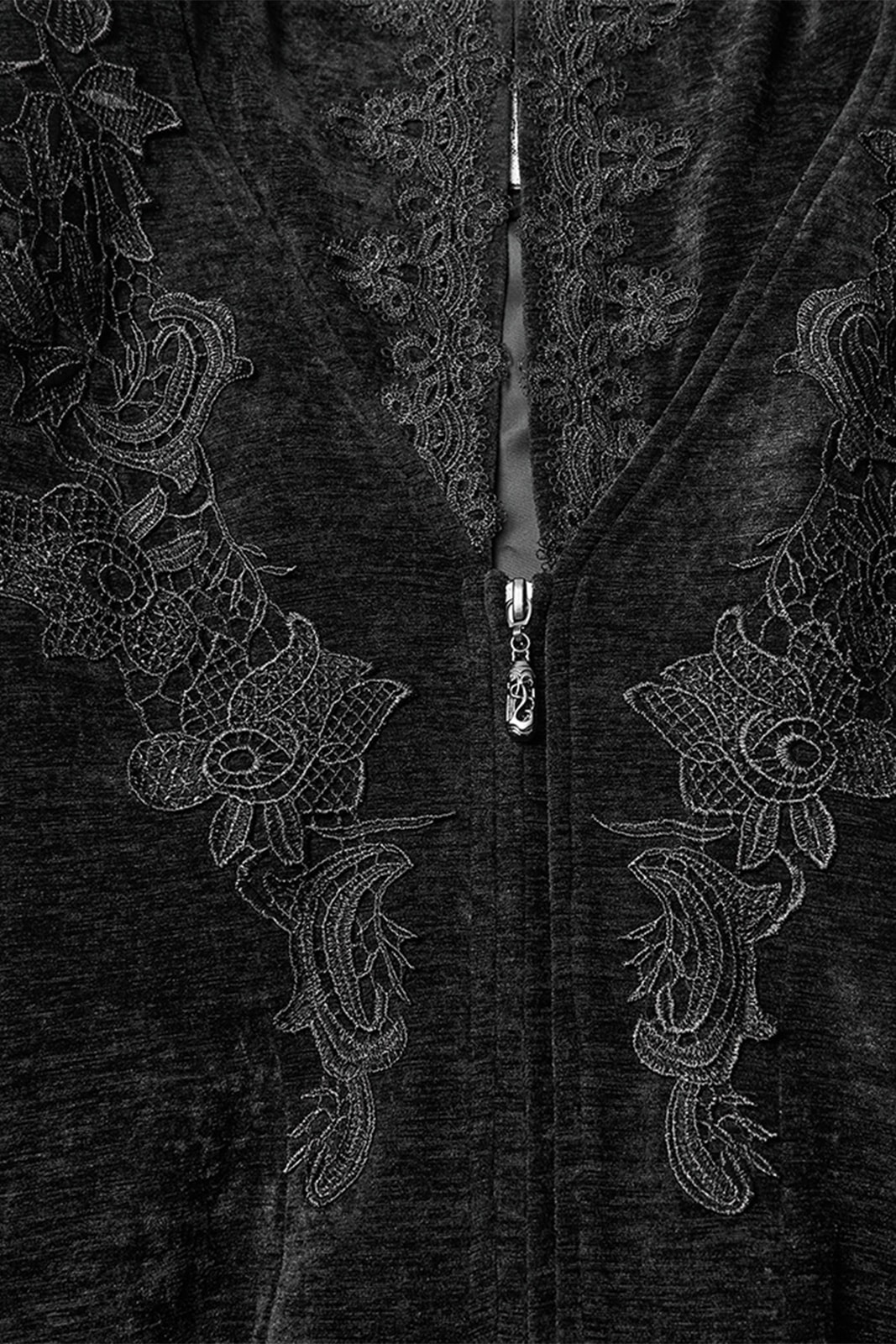 Der Dark Ophelia Mantel verkörpert düstere Eleganz und dramatische Romantik. Der lange, fließende Schnitt aus weichem Chenille-Stoff sorgt für eine edle Silhouette, während aufwendig platzierte Spitzenapplikationen an Brust, Rücken, Taschen und Kapuze einen luxuriösen Gothic-Charakter verleihen. Die Kapuze verstärkt die mystische Ausstrahlung, ergänzt durch eine Schnürung am Rücken für eine figurbetonte Anpassung. Dezente Kunstlederdetails mit Ösen auf Hüfthöhe setzen einen modernen Kontrast und runden das Design stilvoll ab.