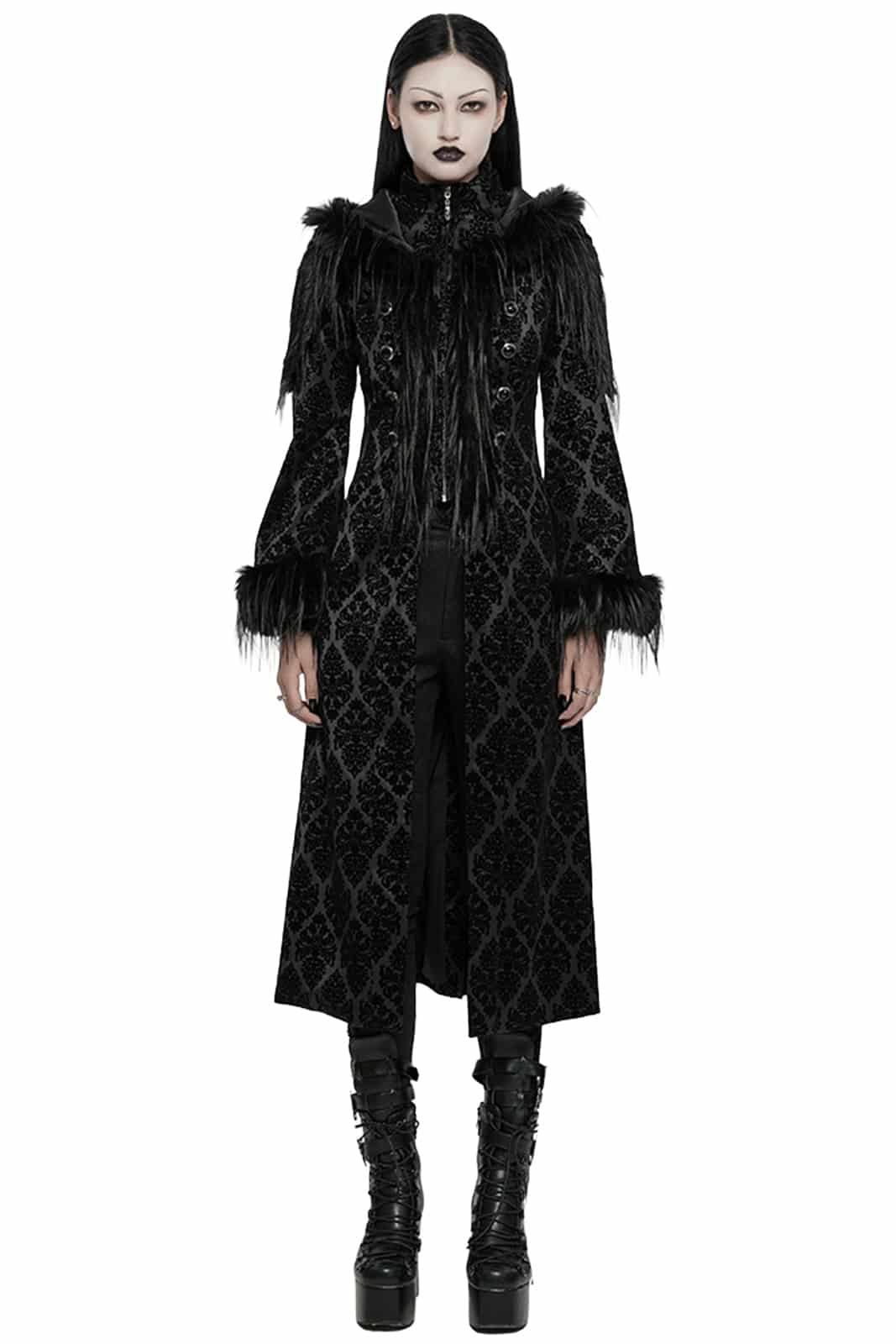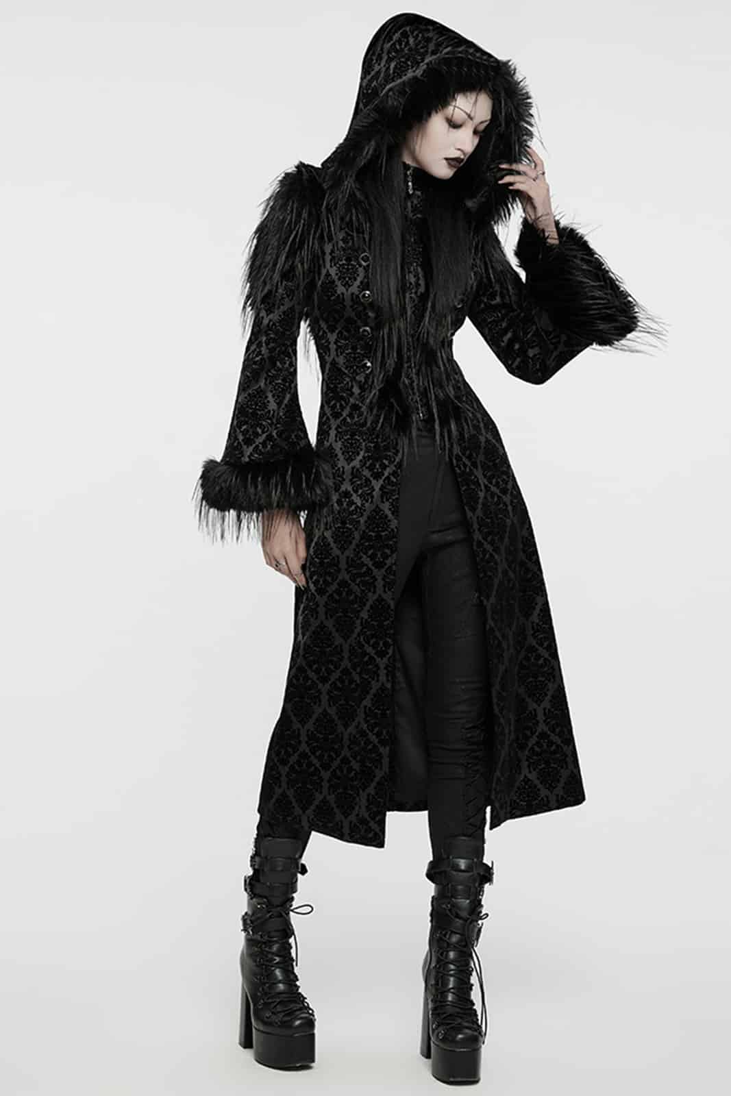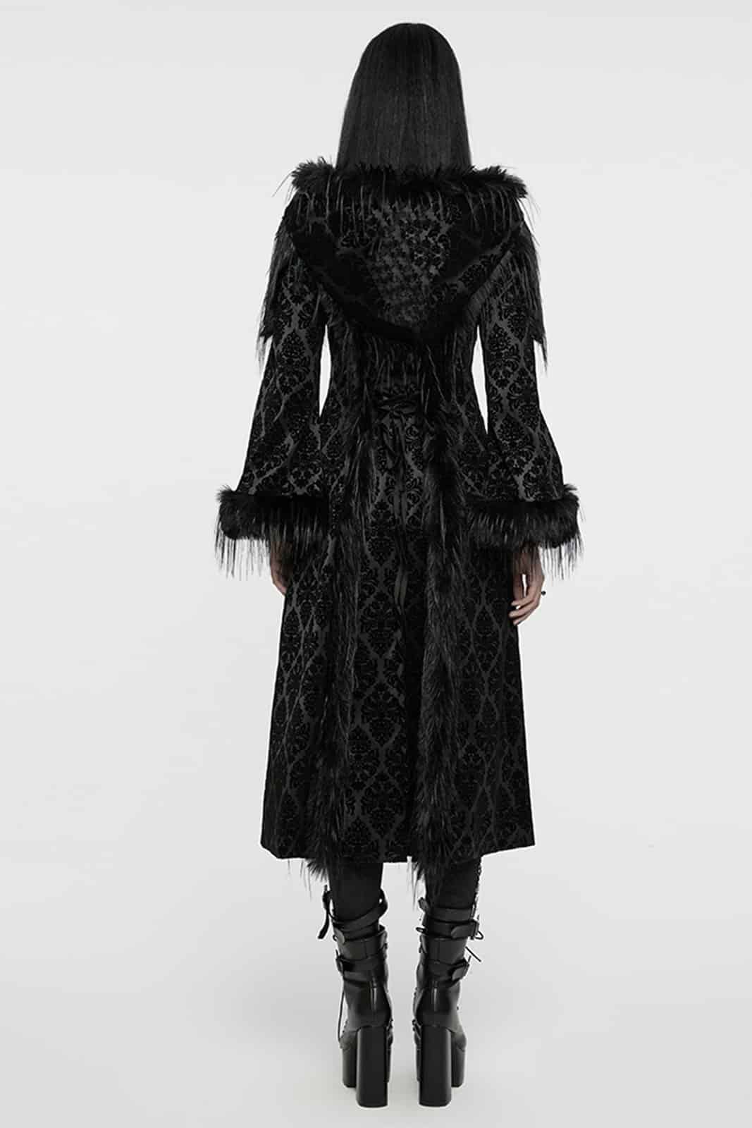 Ein Mantel für Nächte voller Drama und Eleganz: Der Gothic Diva Damenmantel verbindet romantische Gothic-Ästhetik mit luxuriösen Details. Der tiefschwarze Stoff trägt ein edles, samtiges Flockmuster, das im Licht geheimnisvoll schimmert. Die große Kapuze und die ausgestellten Ärmel sind mit weichem Kunstfell eingefasst und verleihen dem Look eine opulente, fast majestätische Ausstrahlung. Der frontale Reißverschluss wird von dekorativen Knöpfen begleitet, während die Rückenschnürung für eine figurbetonte Silhouette sorgt. Ein Mantel, der Wärme, Stil und eine Portion dunkle Magie vereint und jedes Outfit zu einem eindrucksvollen Auftritt macht.