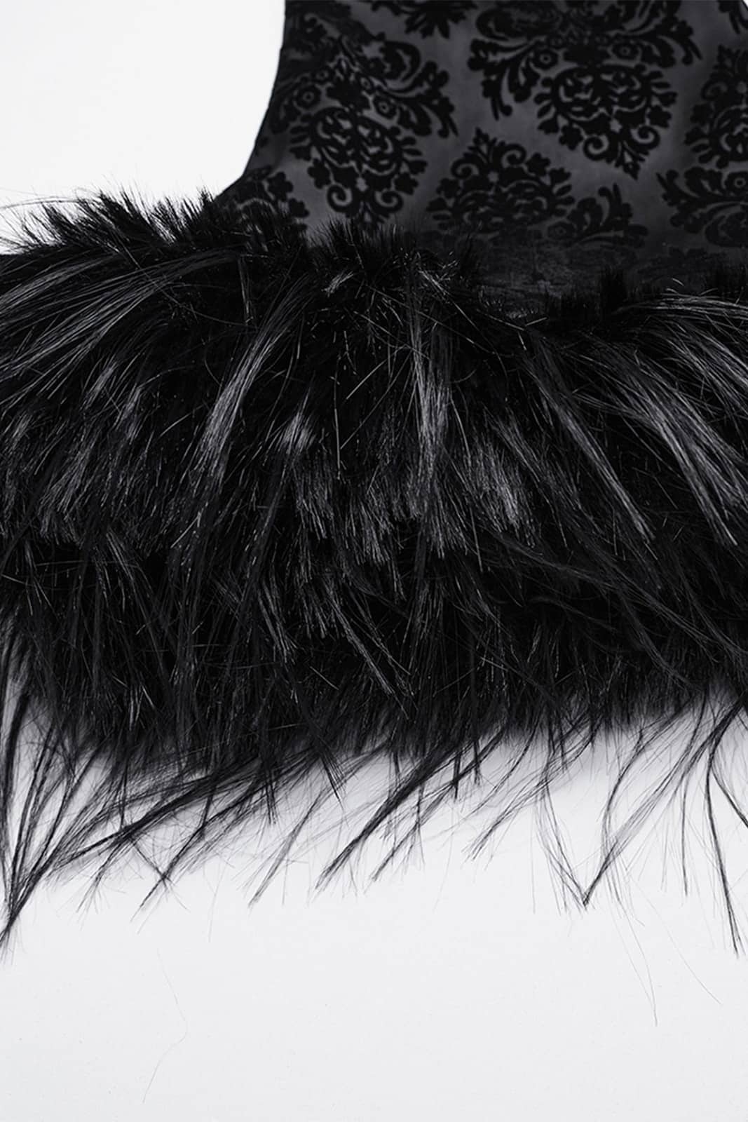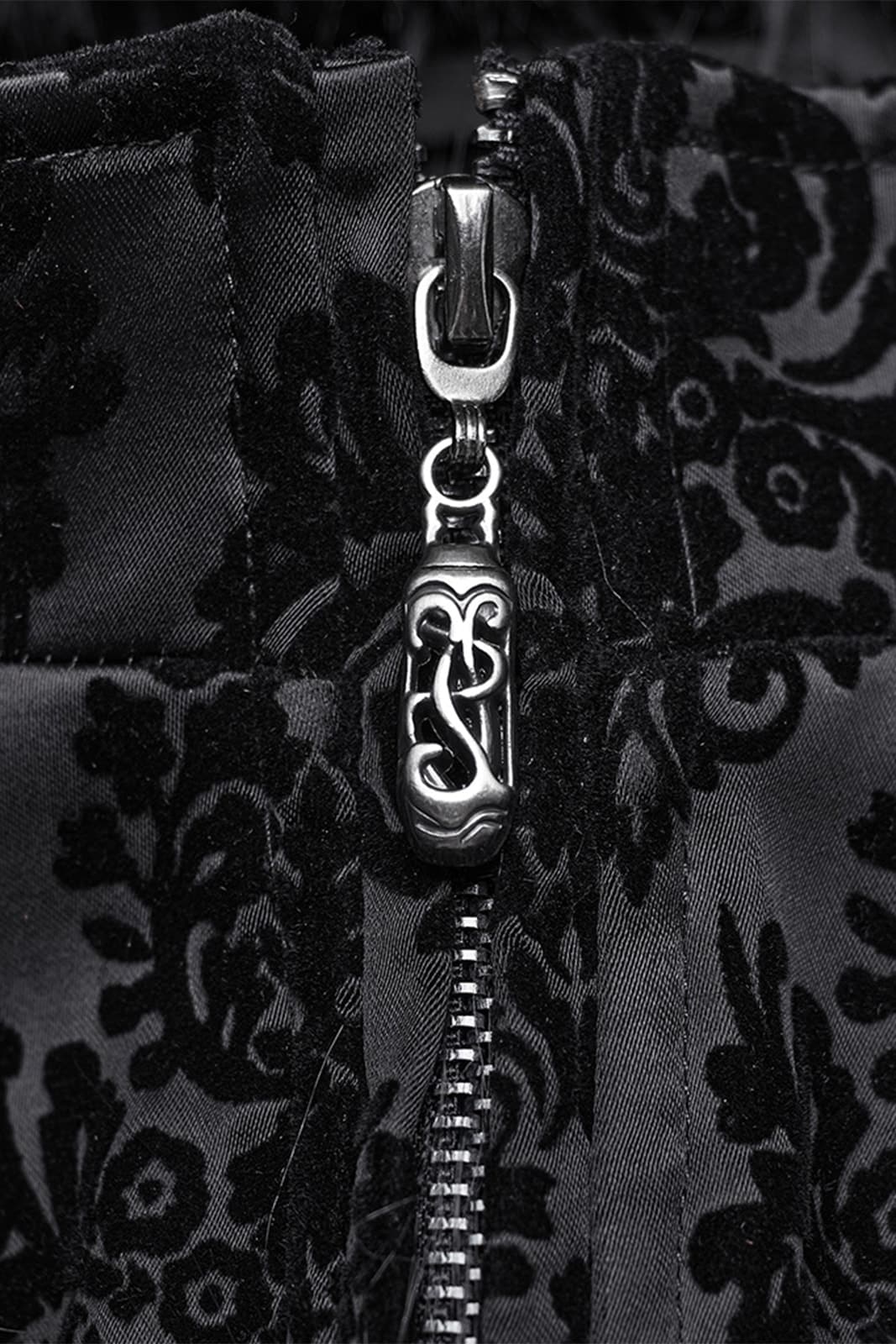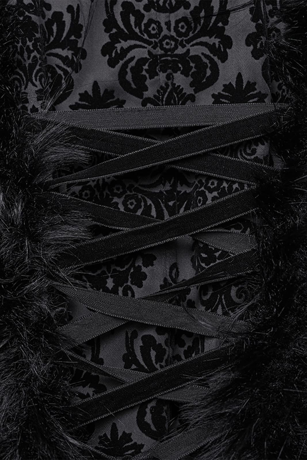 Ein Mantel für Nächte voller Drama und Eleganz: Der Gothic Diva Damenmantel verbindet romantische Gothic-Ästhetik mit luxuriösen Details. Der tiefschwarze Stoff trägt ein edles, samtiges Flockmuster, das im Licht geheimnisvoll schimmert. Die große Kapuze und die ausgestellten Ärmel sind mit weichem Kunstfell eingefasst und verleihen dem Look eine opulente, fast majestätische Ausstrahlung. Der frontale Reißverschluss wird von dekorativen Knöpfen begleitet, während die Rückenschnürung für eine figurbetonte Silhouette sorgt. Ein Mantel, der Wärme, Stil und eine Portion dunkle Magie vereint und jedes Outfit zu einem eindrucksvollen Auftritt macht.