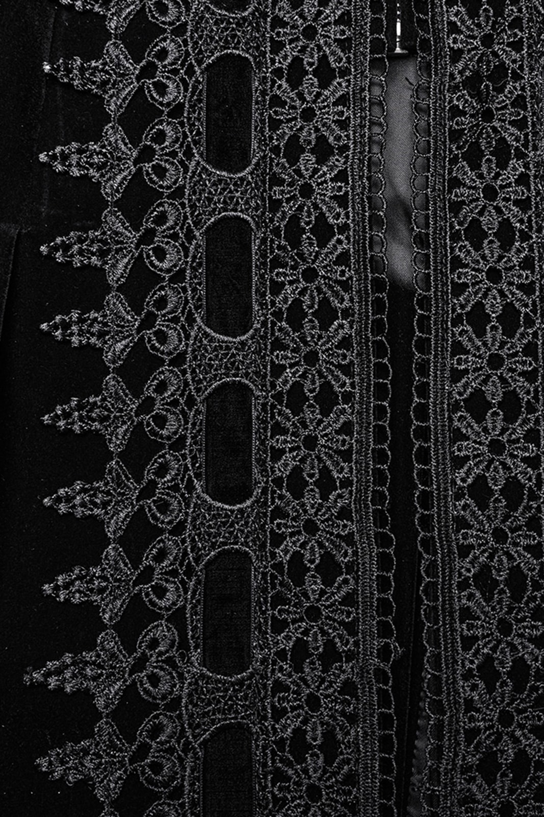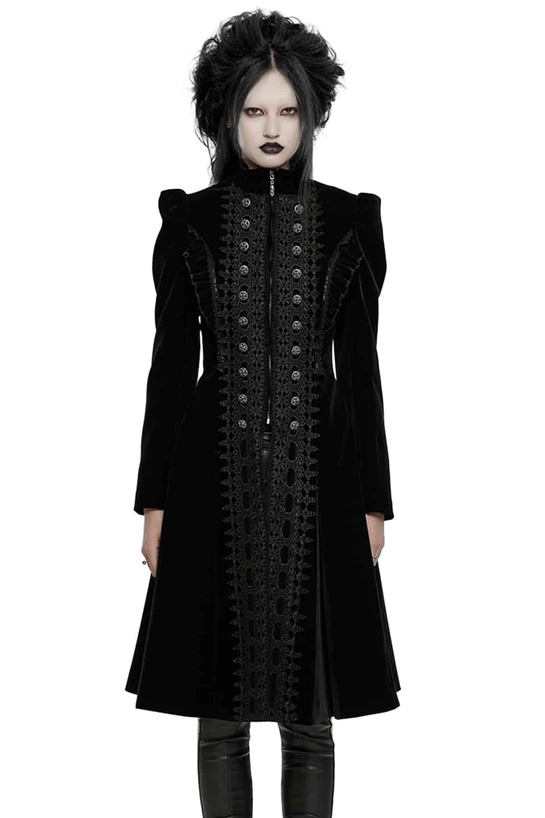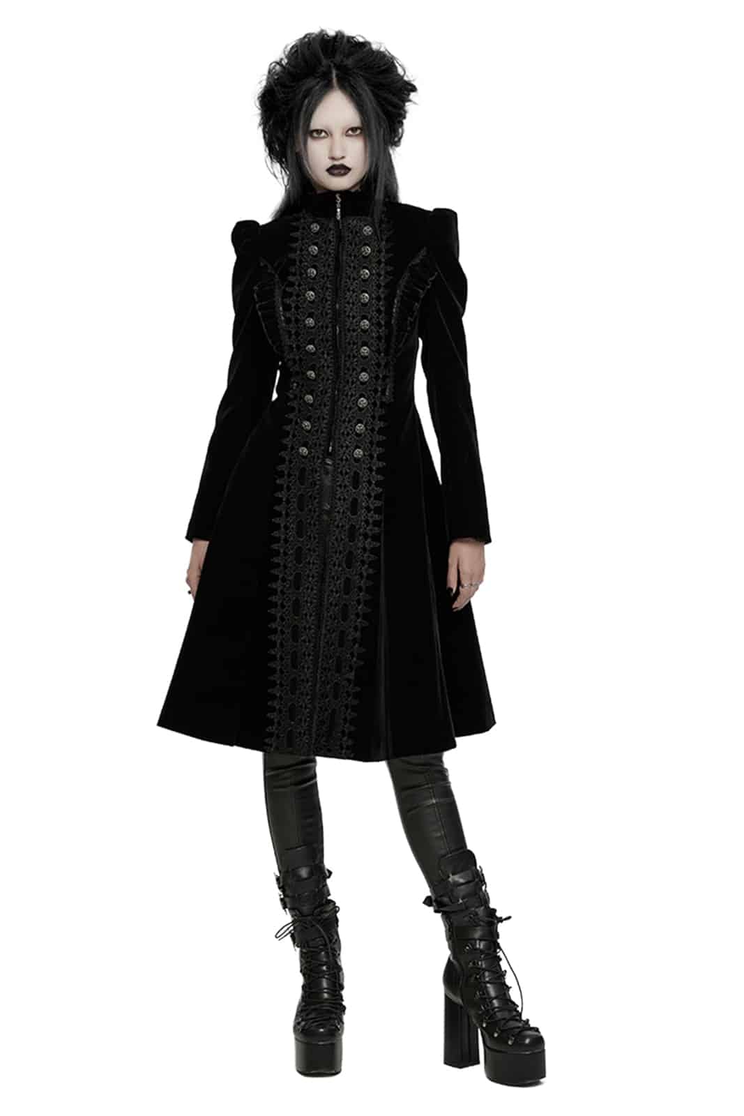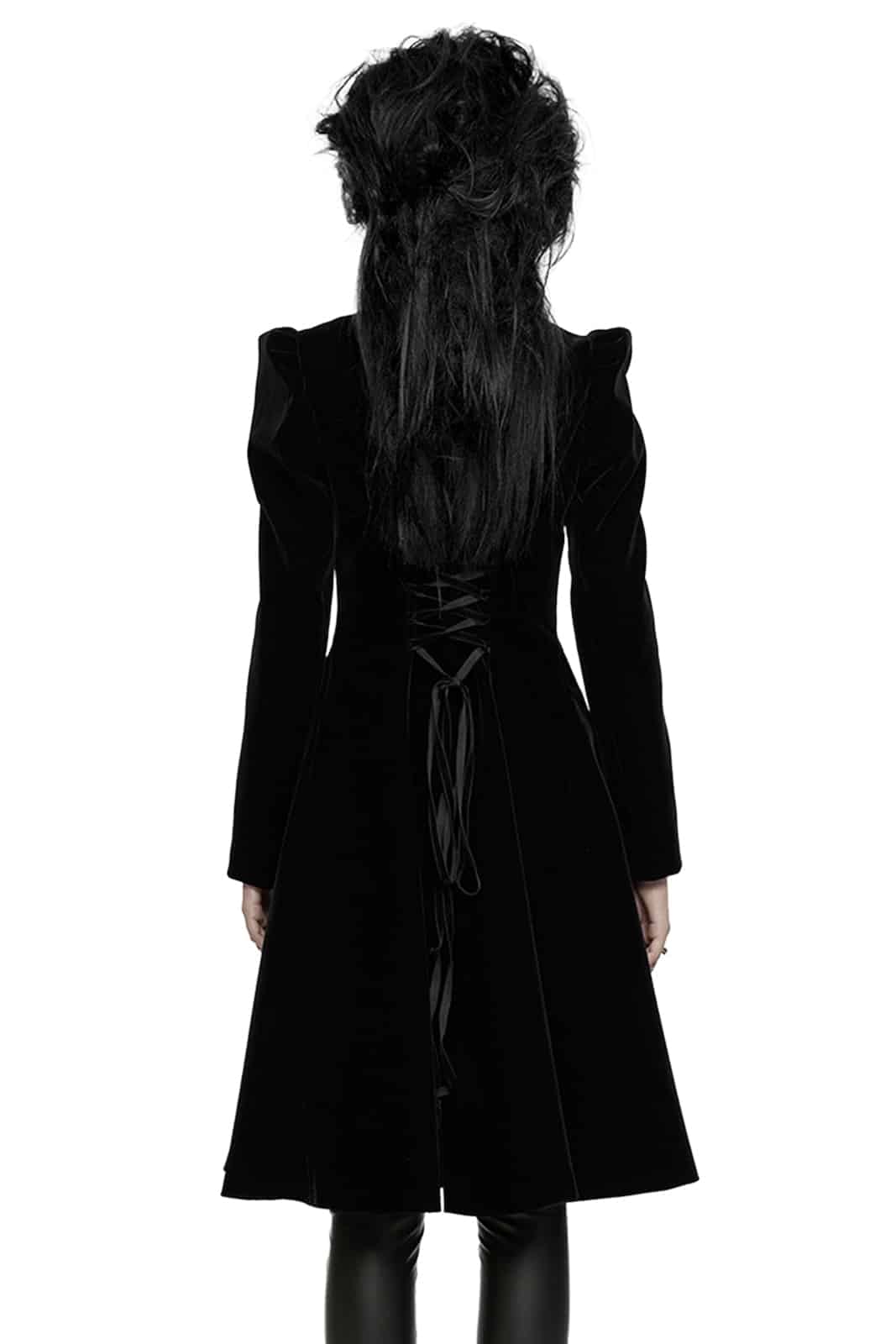 Der Lady Macbeth Samtmantel versprüht dunkle Romantik und zeitlosen Gothic-Charme. Gefertigt aus luxuriösem schwarzem Samt, besticht dieses taillierte Modell mit dramatischen Falten an den Schultern und Rüschen an den Brustnähten, die einen theatralischen Charme ausstrahlen. Der Reißverschluss vorne, verziert mit Spitze und verzierten Zierknöpfen, verleiht dem Ganzen einen Hauch von Raffinesse. Die Schnürung am Rücken betont die Taille und kreiert eine schmeichelhafte Silhouette, die einer Gothic-Heldin würdig ist.