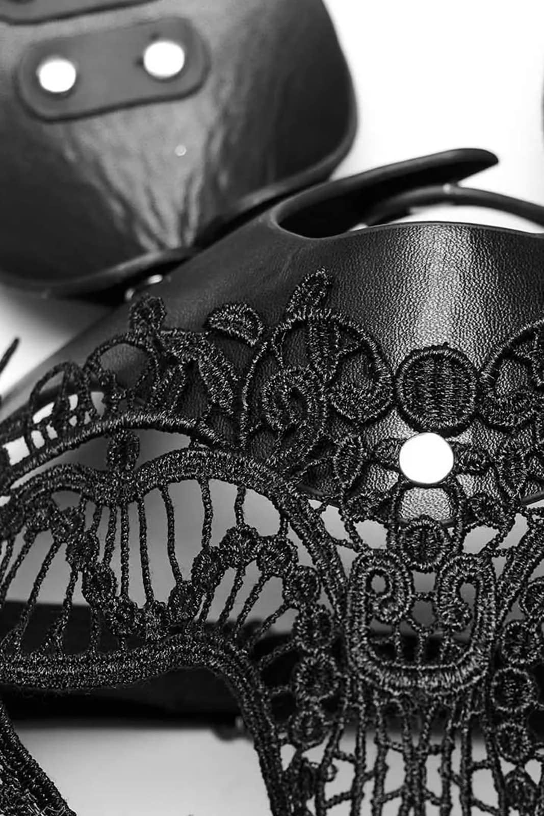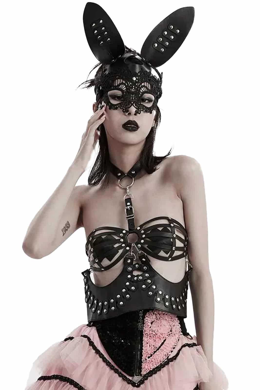 Hasen-Maske aus Kunstleder mit schwarzer Spitze und geformten Ohren. Am Hinterkopf mit verstellbarem gummiband.