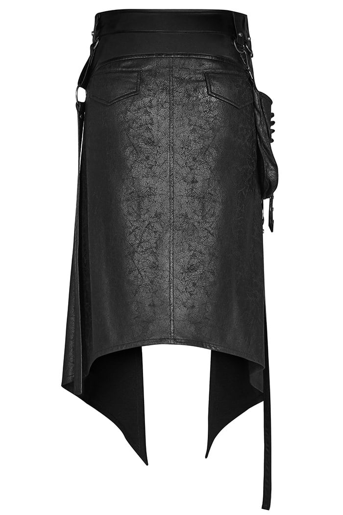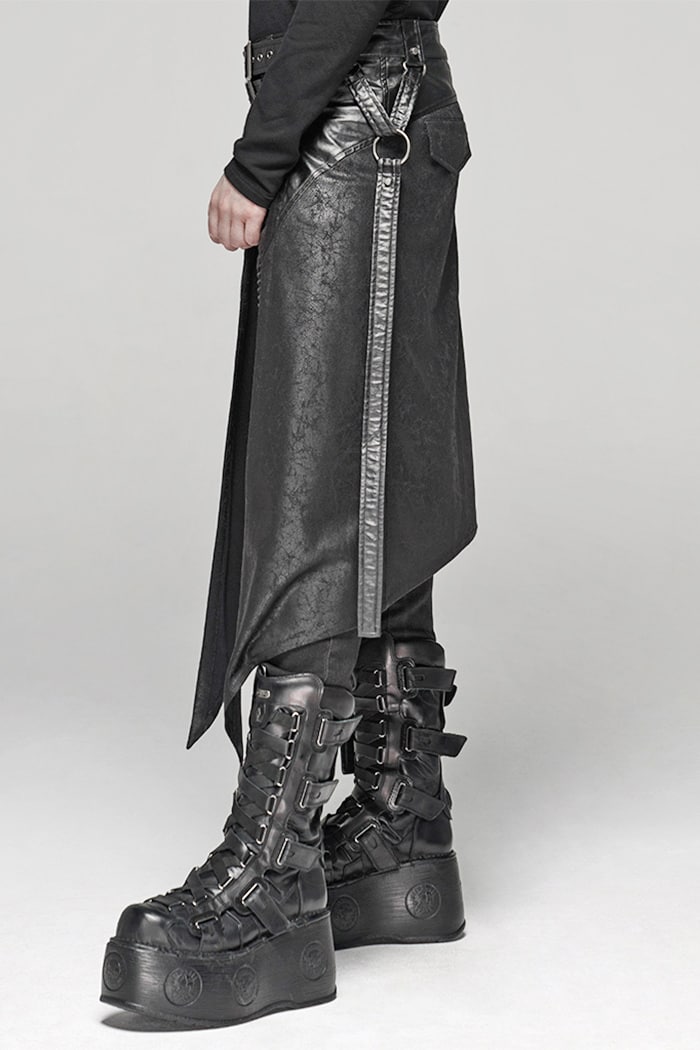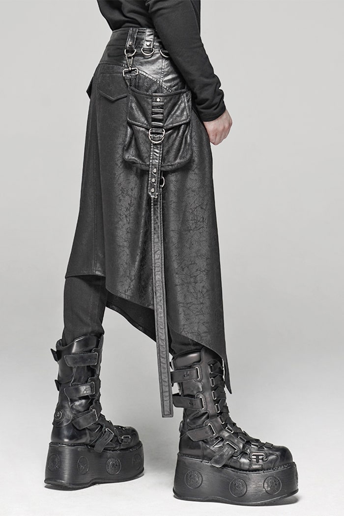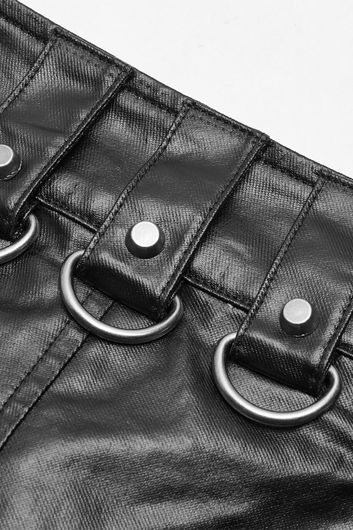 Gothic Herrenrock in Kunstleder-Optik aus leichtem Material . Am Bund mit zwei Schnallen, ausgestattet mit zwei Gesäßtaschen und einer abnehmbaren Seitentasche. Verziert mit Riemen, grauen D-Ringen und Nieten.