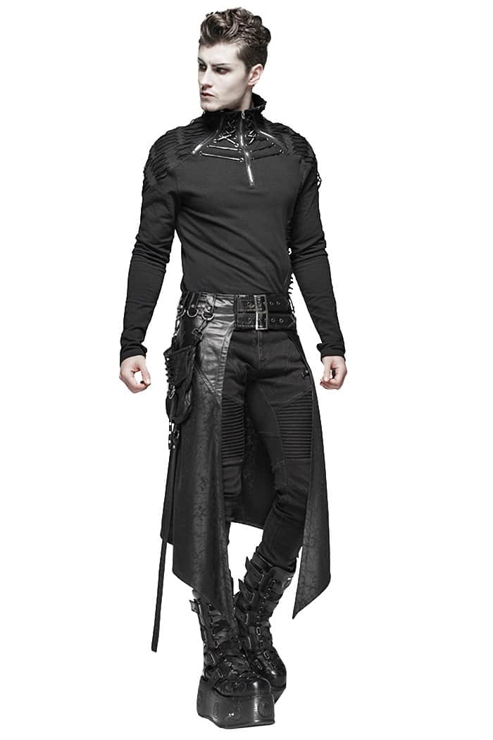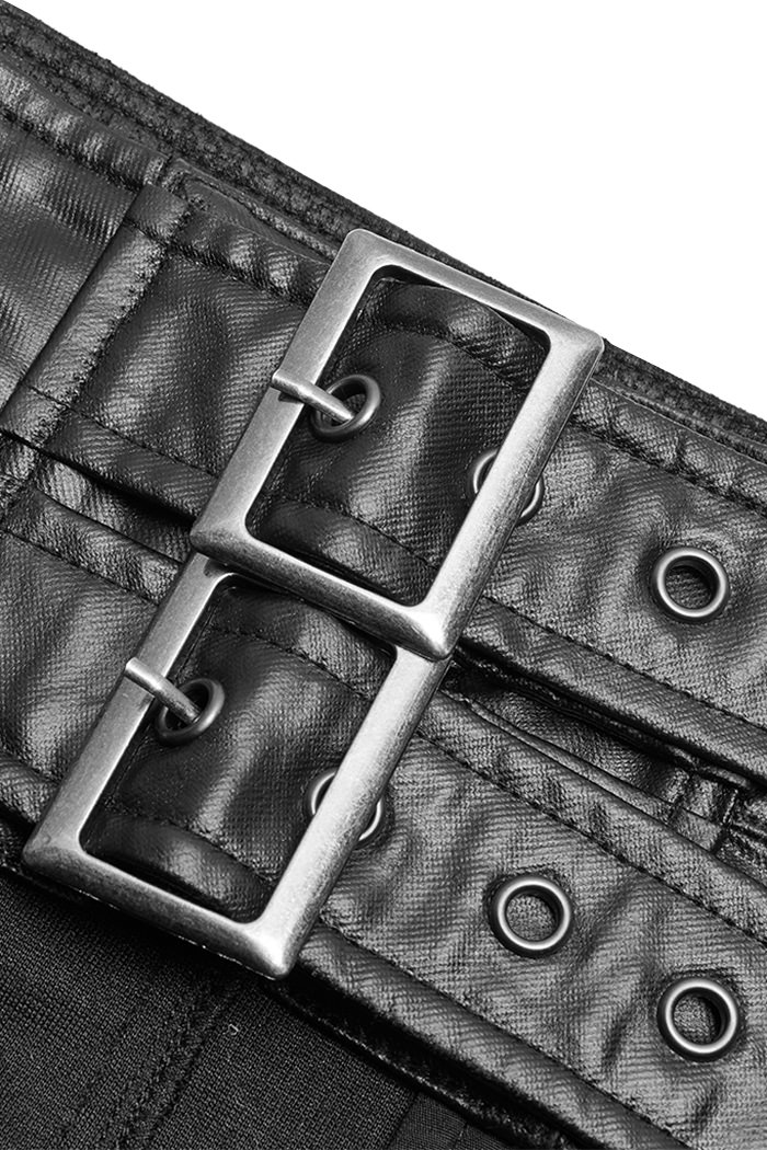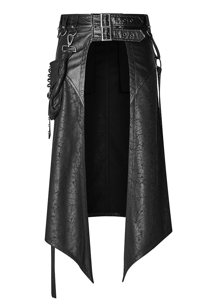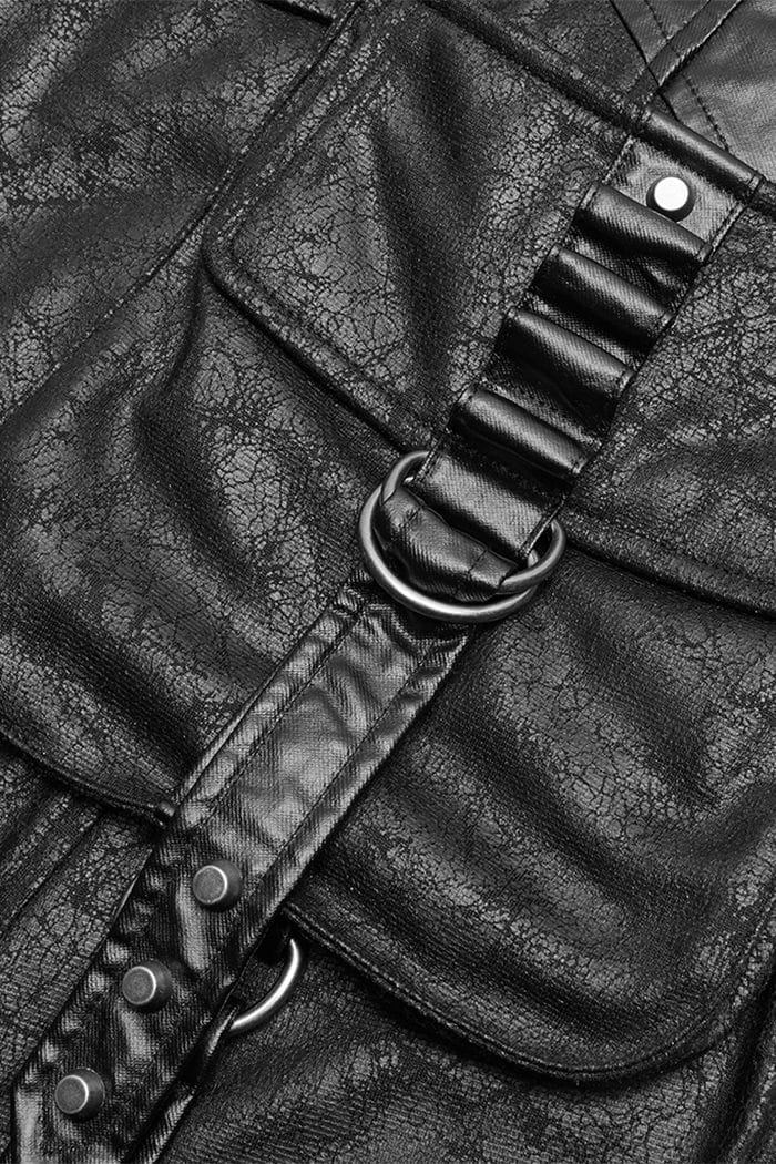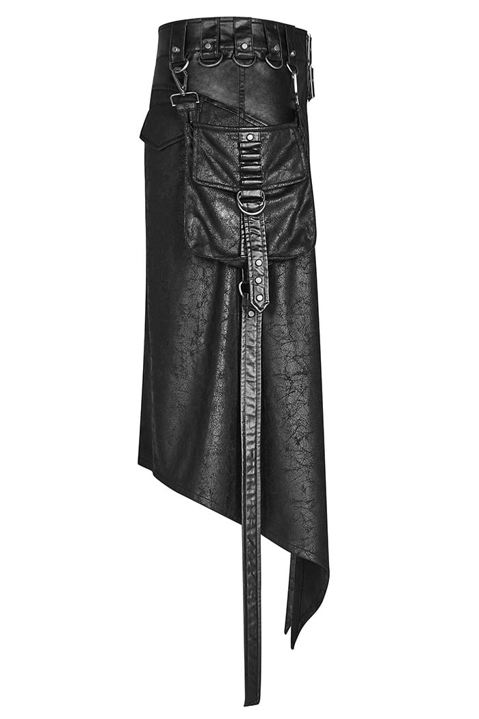 Gothic Herrenrock in Kunstleder-Optik aus leichtem Material . Am Bund mit zwei Schnallen, ausgestattet mit zwei Gesäßtaschen und einer abnehmbaren Seitentasche. Verziert mit Riemen, grauen D-Ringen und Nieten.
