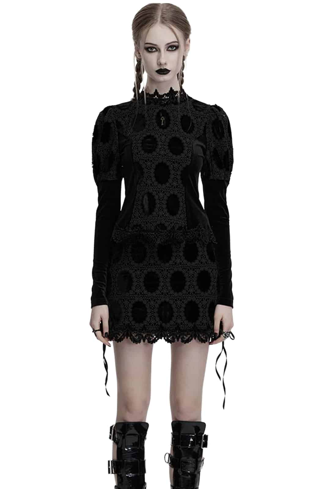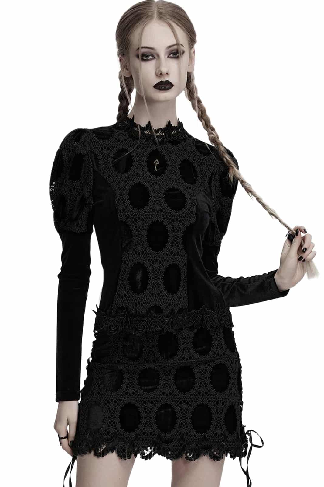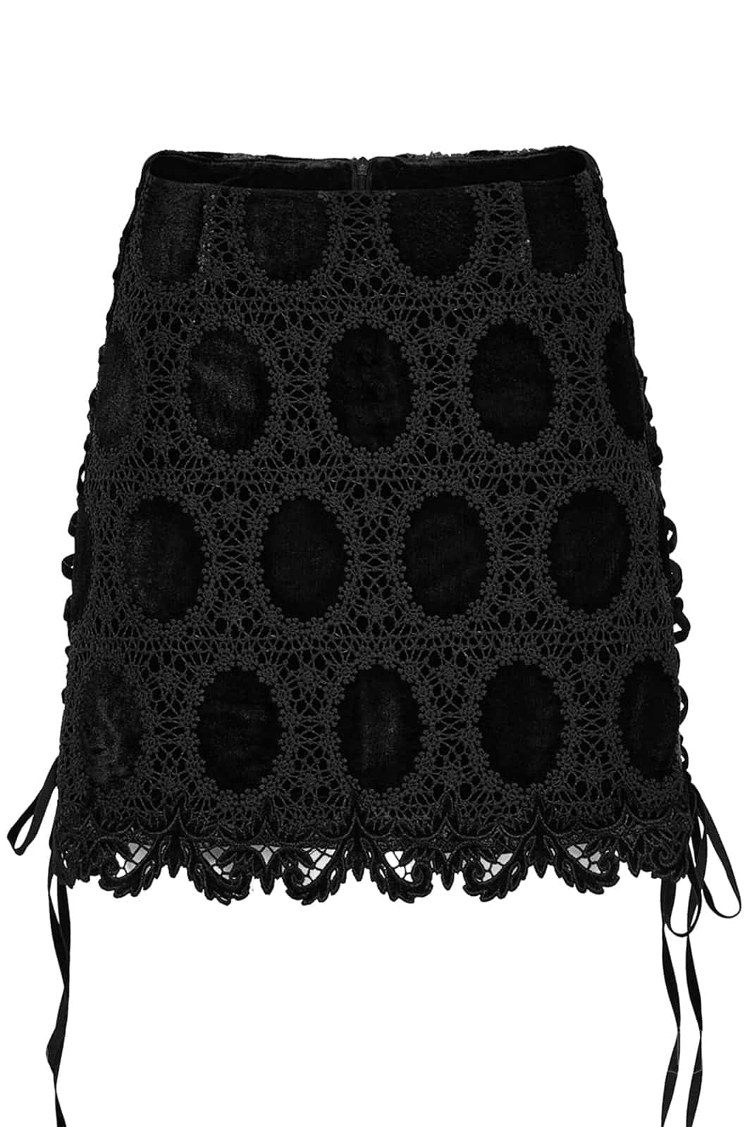 Dieser Gothic Minirock vereint samtige Eleganz mit romantischen Barock-Details. Das weiche schwarze Velvet bildet die Basis, während die Häkelspitze in ornamentaler Optik einen raffinierten Kontrast schafft. Seitliche Schnürungen und ein bestickter Spitzenabschluss geben dem Rock seinen unverwechselbaren Dark-Romantic-Charakter. Perfekt für besondere Anlässe oder als stilvolles Statement im Alltag.