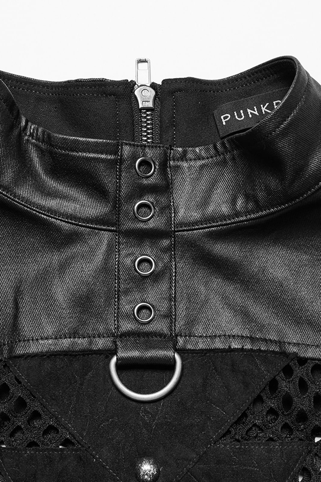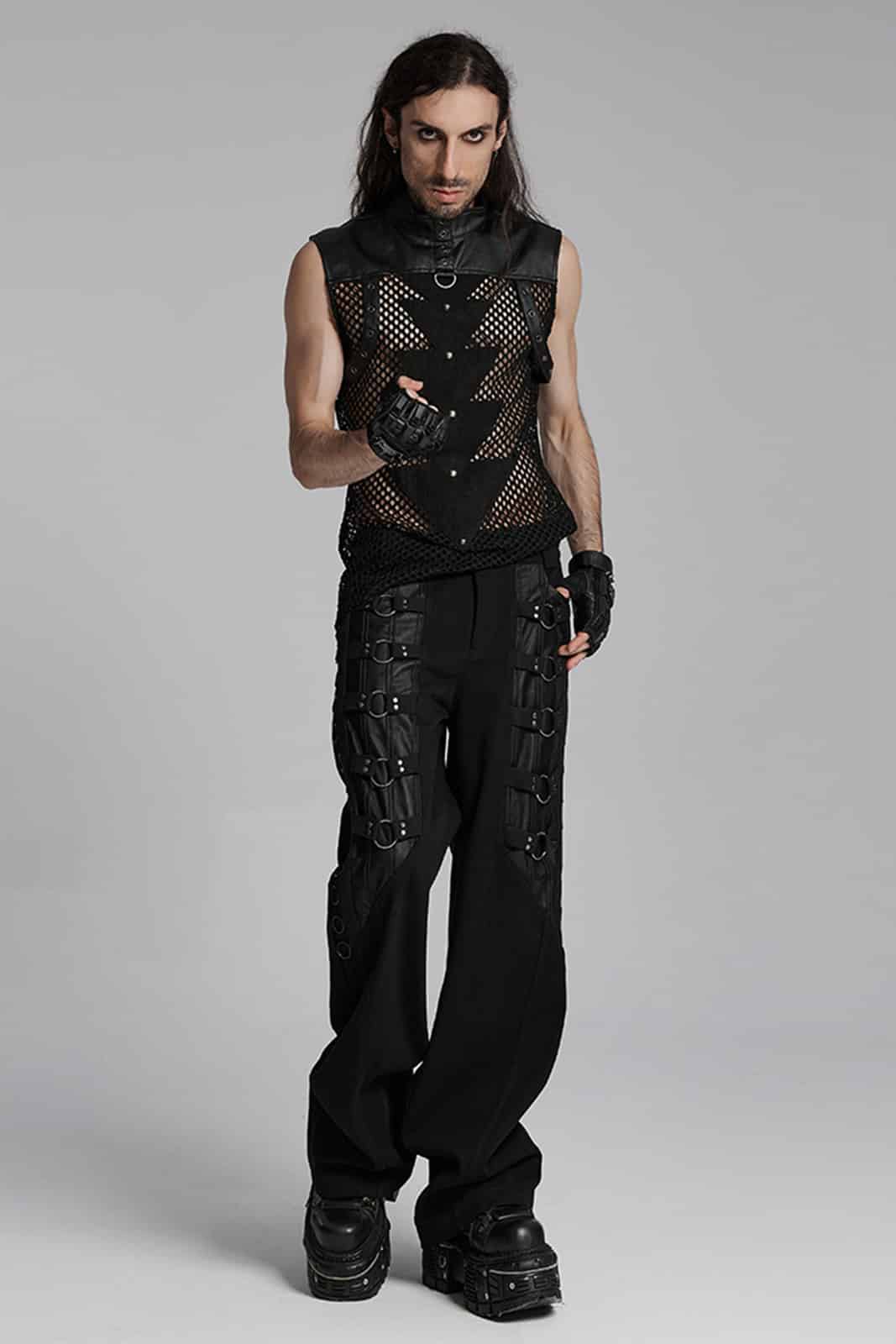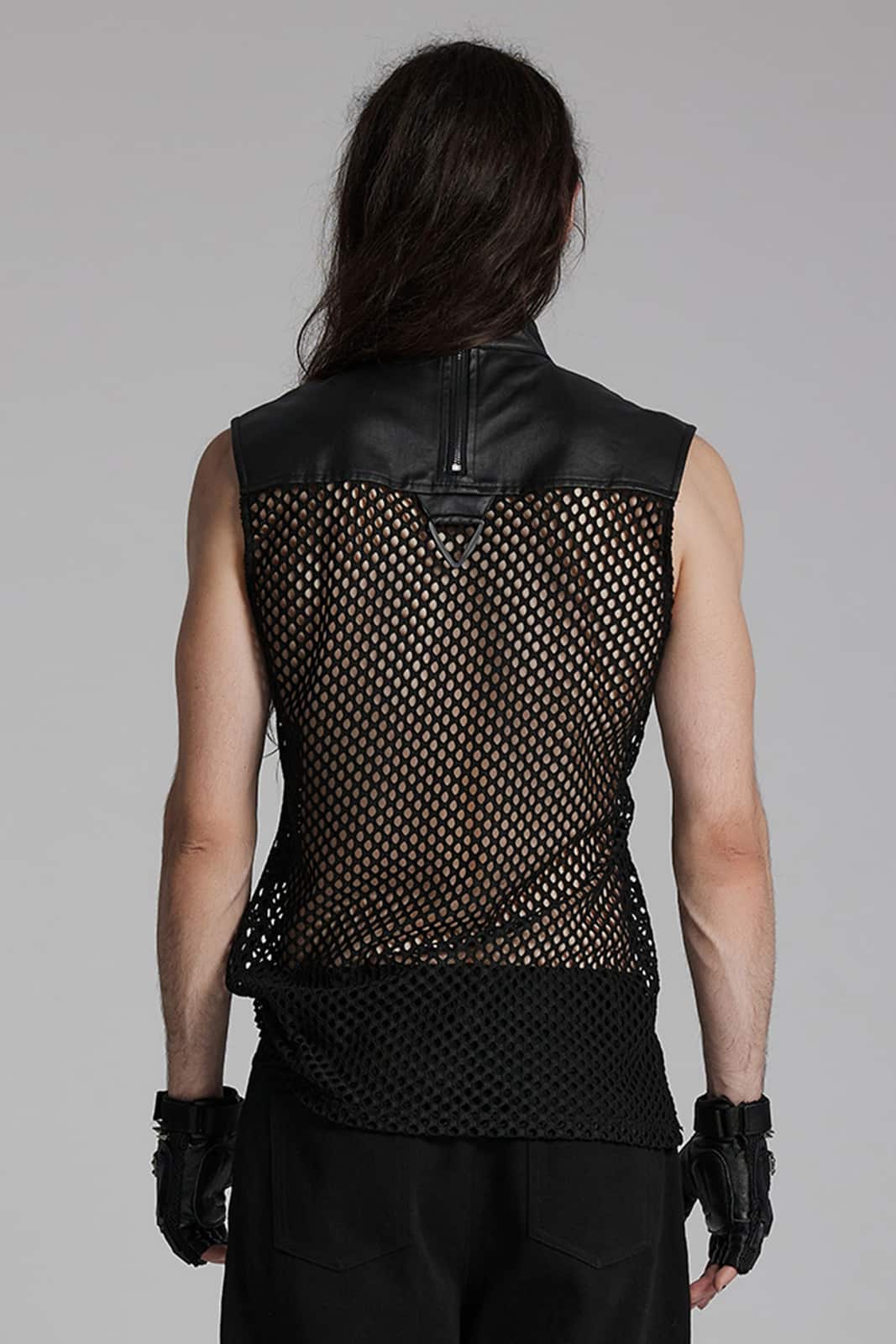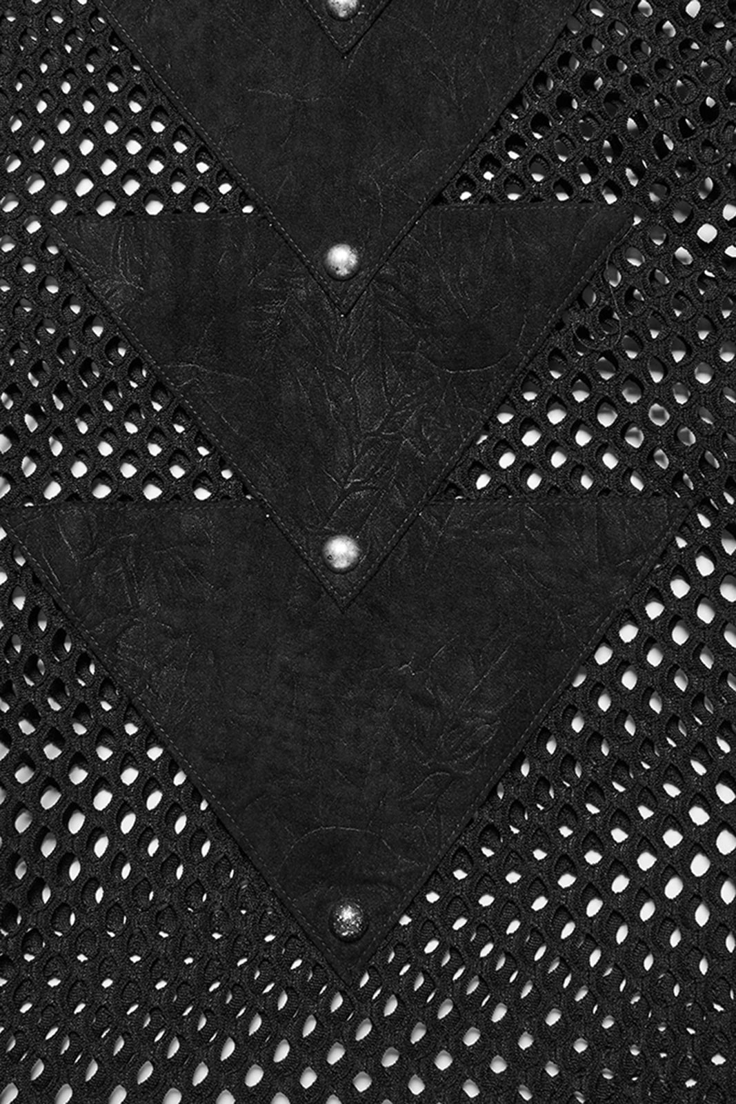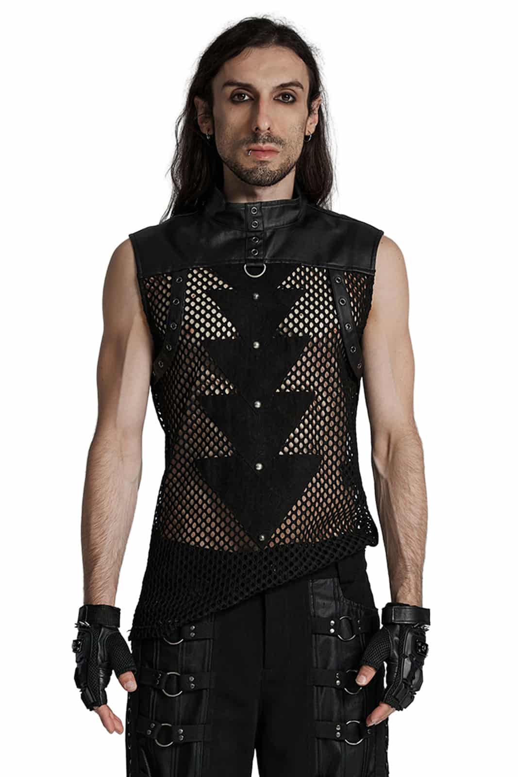 Dieses ärmellose Herren-Oberteil vereint Mesh-Struktur mit markanten Gothic-Elementen zu einem kompromisslosen Statement-Piece. Das grobmaschige Netzgewebe gibt dem Look eine aggressive, luftige Note und lässt die Haut durchscheinen, während ein auffällig geformter Einsatz in Zackenoptik aus Wildlederimitat die Front strukturiert und durch silberne Nieten akzentuiert wird. Der hohe Kragen aus Kunstleder mit vorderem Druckknopfverschluss und D-Ring bringt eine martialische, fast militärische Ästhetik ein. Die Schulterpartie ist mit vernieteten Kunstleder-Riemen besetzt, die die Silhouette zusätzlich betonen. Ein Reißverschluss am Nacken erleichtert das Anziehen. Dieses Oberteil eignet sich ideal für Festivals, Clubnächte oder jede Gelegenheit, bei der ein kompromissloser Industrial- oder Cyberpunk-Look gefragt ist.