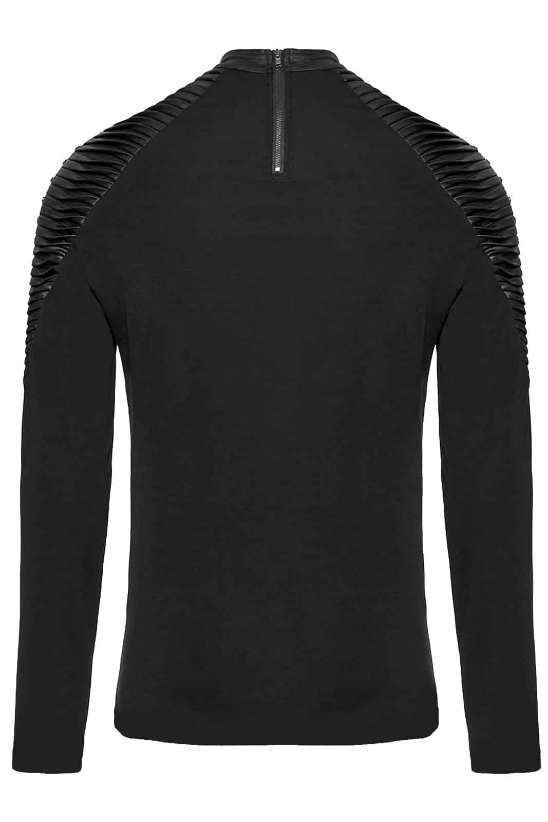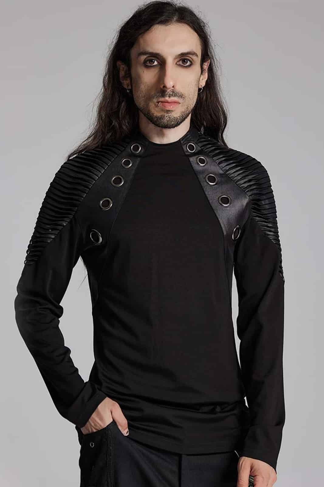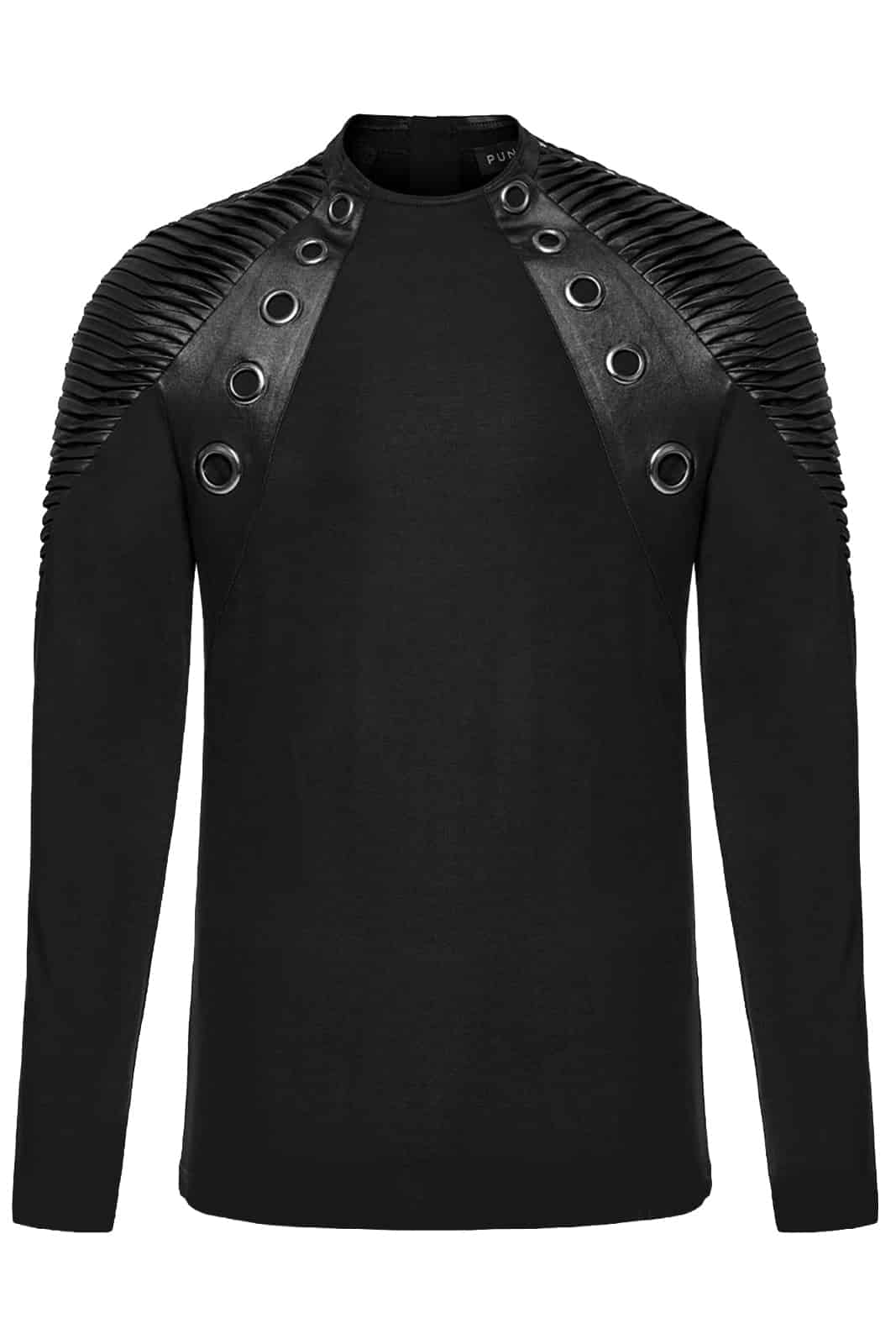 Dieses schwarze Langarmshirt von Punk Rave vereint moderne Gothic-Ästhetik mit markanten Details. Die körpernahe Passform und das elastische Material sorgen für hohen Tragekomfort, während strukturierte Schulterpartien und Lederimitat-Elemente dem Design eine kraftvolle, industrielle Note verleihen. Ideal für moderne Gothic-, Industrial- und Dark-Alternative-Looks – solo oder im Layering getragen.