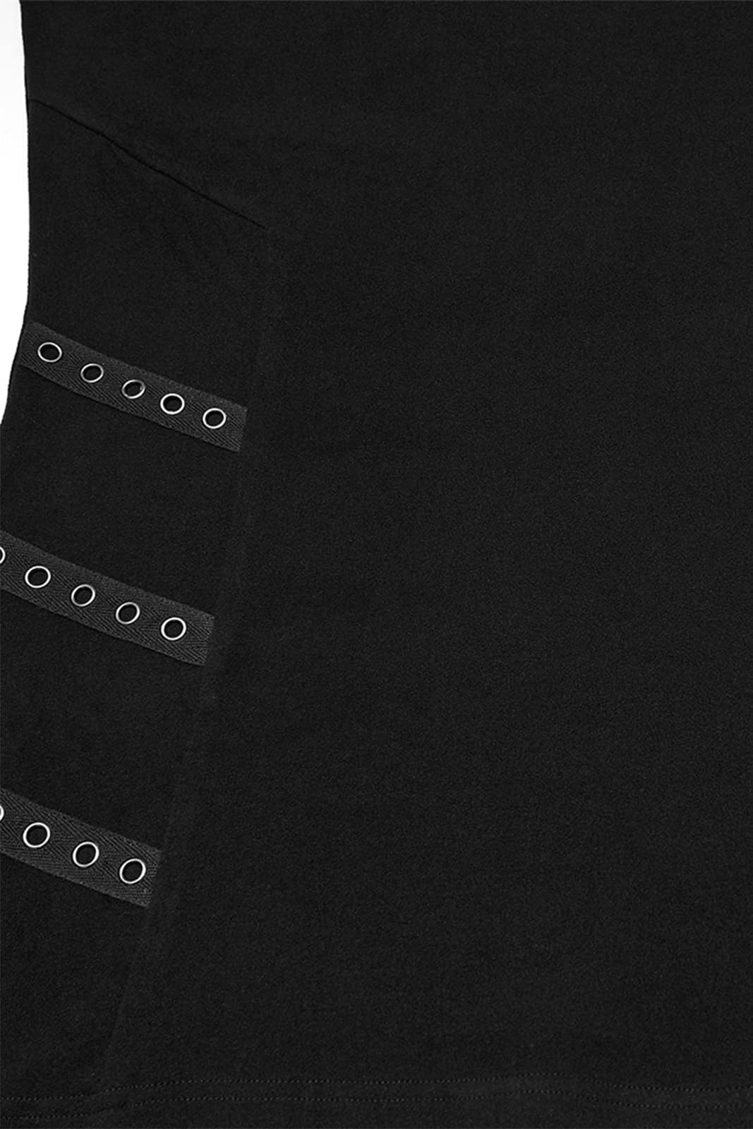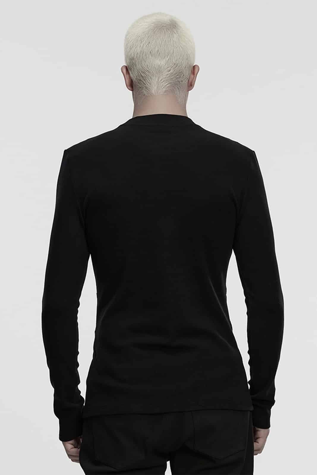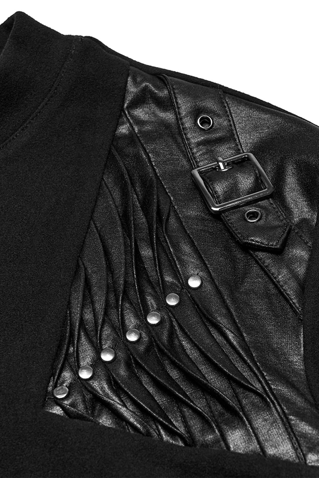 Dieses figurbetonte Gothic-Langarmtop für Herren verbindet klare Linien mit subtiler Raffinesse. Die strukturierenden Pintuck-Falten im oberen Brustbereich und die beschichteten Einsätze in Lederoptik setzen gezielte Akzente, während dezente Nieten und Riemendetails dem Design eine elegante Industrial-Note verleihen. Ein vielseitiges Essential für moderne Gothic- und Darkwear-Looks.