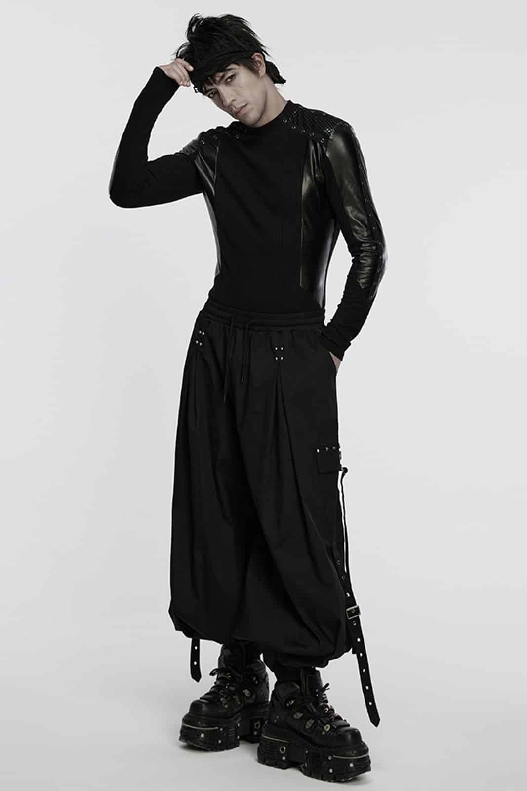 Dieses langärmlige Gothic-Top für Herren kombiniert eine klare, körpernahe Silhouette mit markanten Materialkontrasten. Der gerippte Jersey sorgt für eine strukturierte Basis, während Einsätze in Lederoptik und Mesh an Schultern und Ärmeln eine düstere, moderne Industrial-Note setzen. Ein starkes Essential für Gothic-, Industrial- oder Darkwear-Looks mit Charakter.