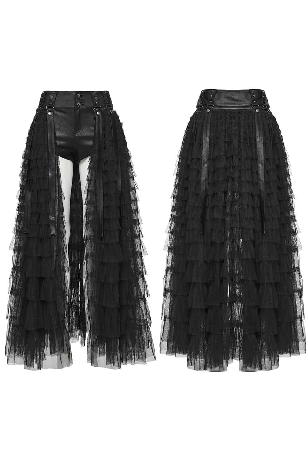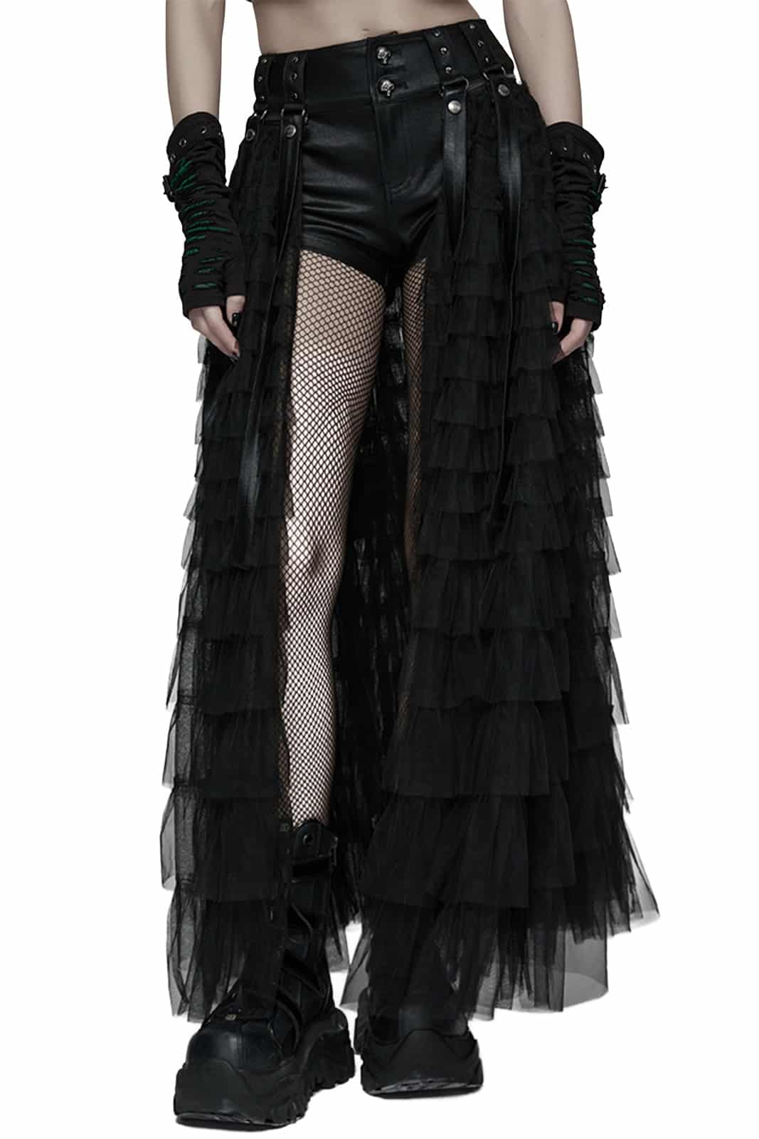 Dunkle Verführung trifft auf rebellische Attitude. Die Evernight Shadowveil Shorts kombinieren figurbetontes Faux Leather mit einem dramatischen, abnehmbaren Tüll-Überrock – perfekt für wandelbare Gothic- und Festival-Looks zwischen Industrial, Dark Romance und Post-Apocalypse.