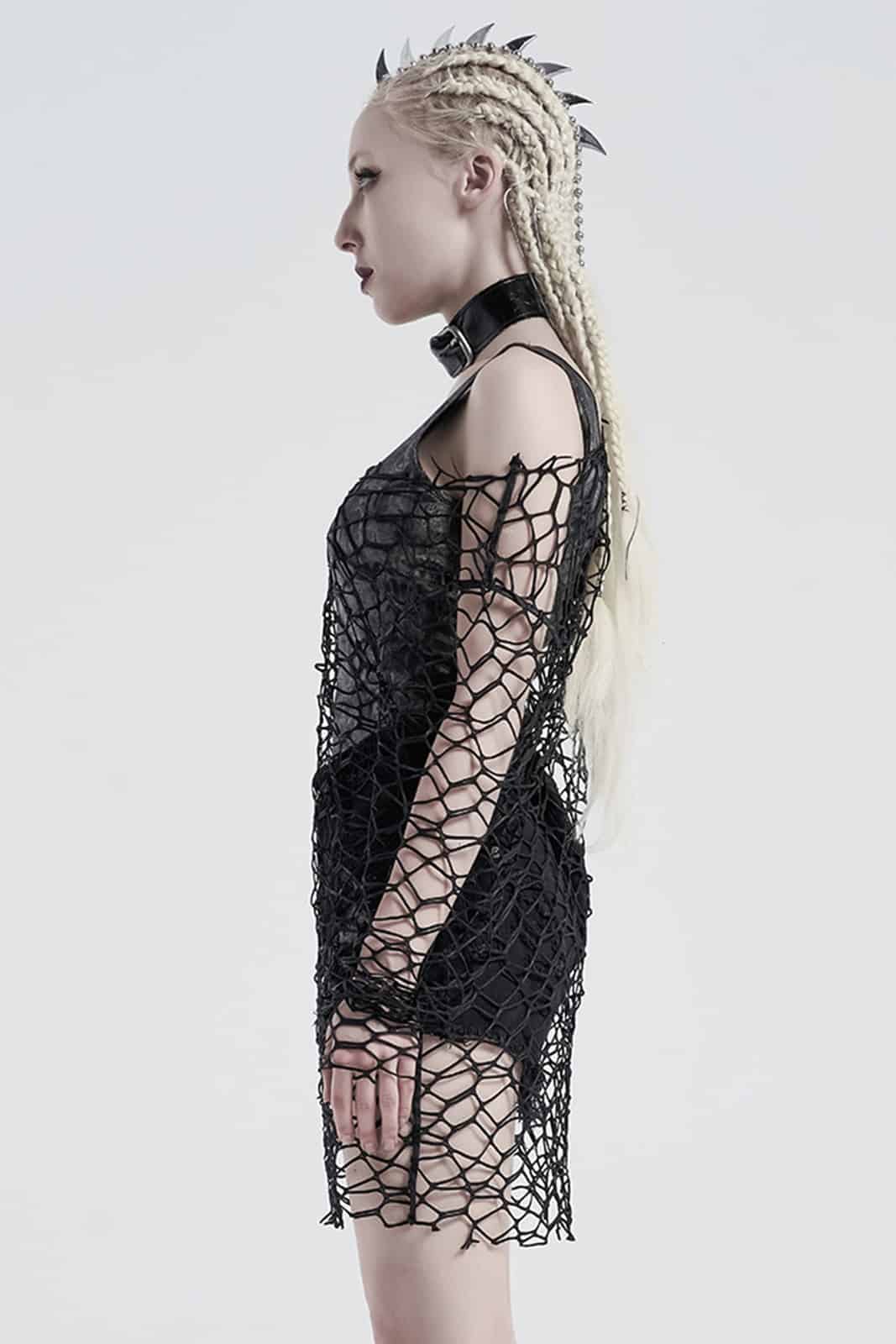 Vom Punk-Stil inspiriertes schwarzes Mesh-Oberteil aus breitem Stricknetz mit unebenen Kanten in Tunikalänge.