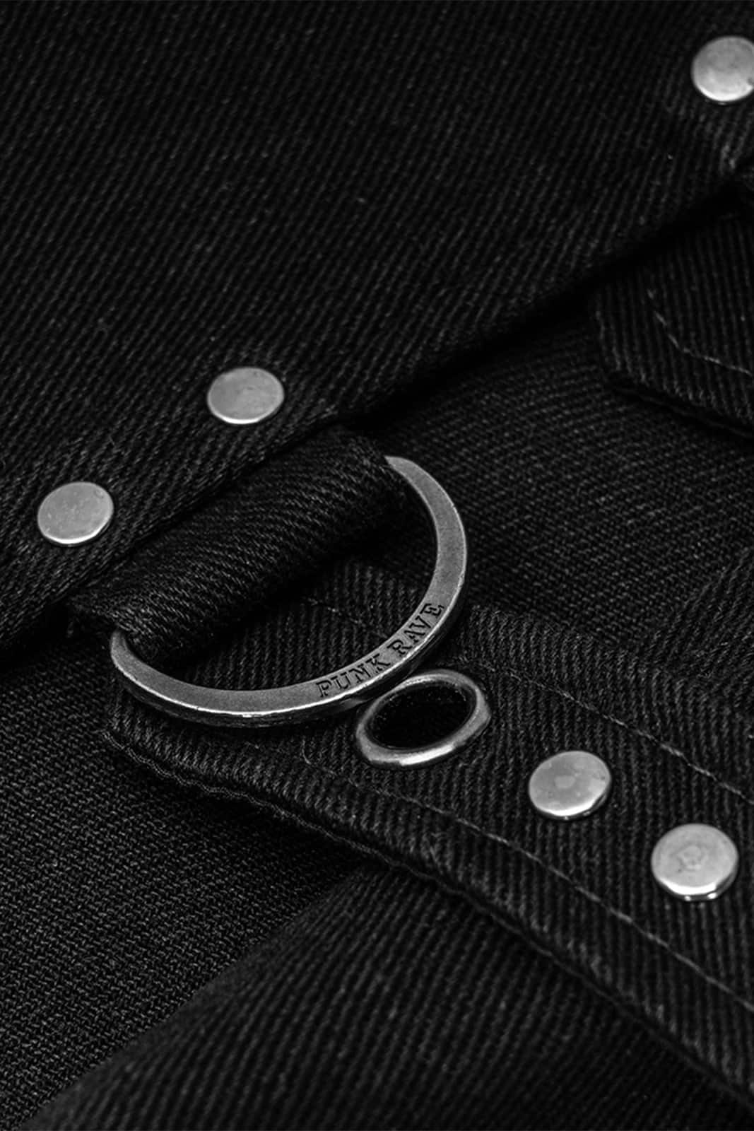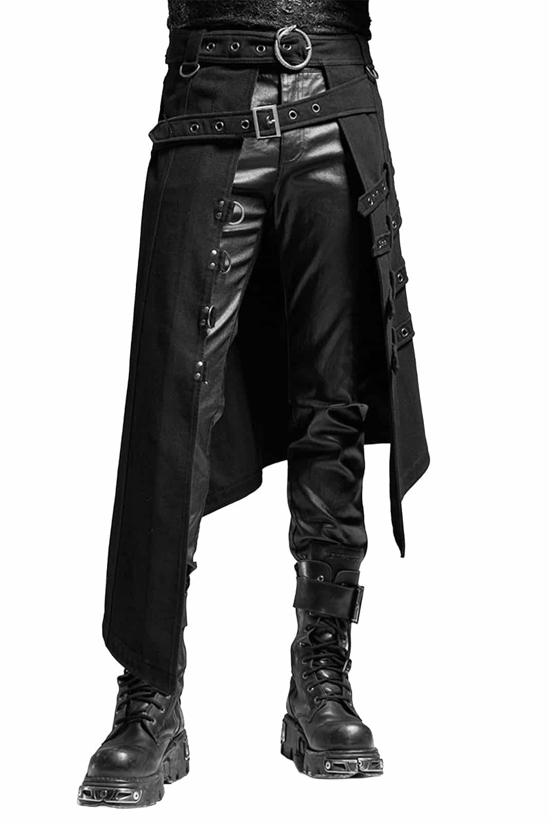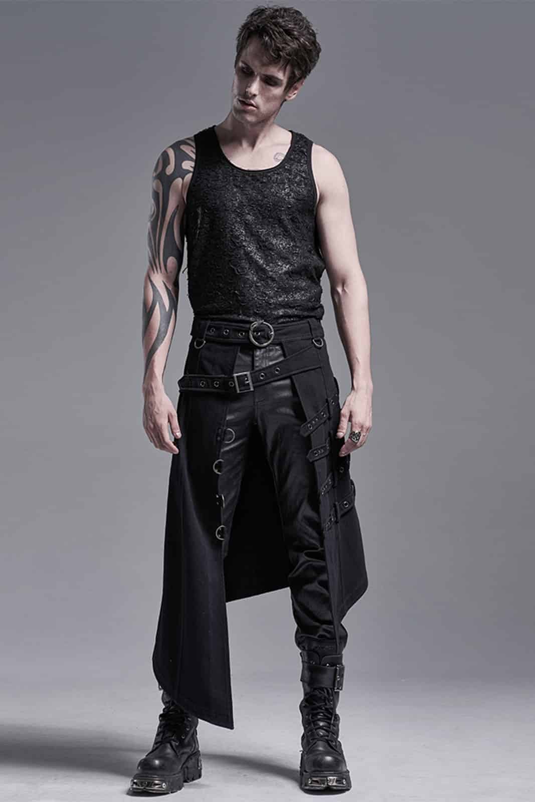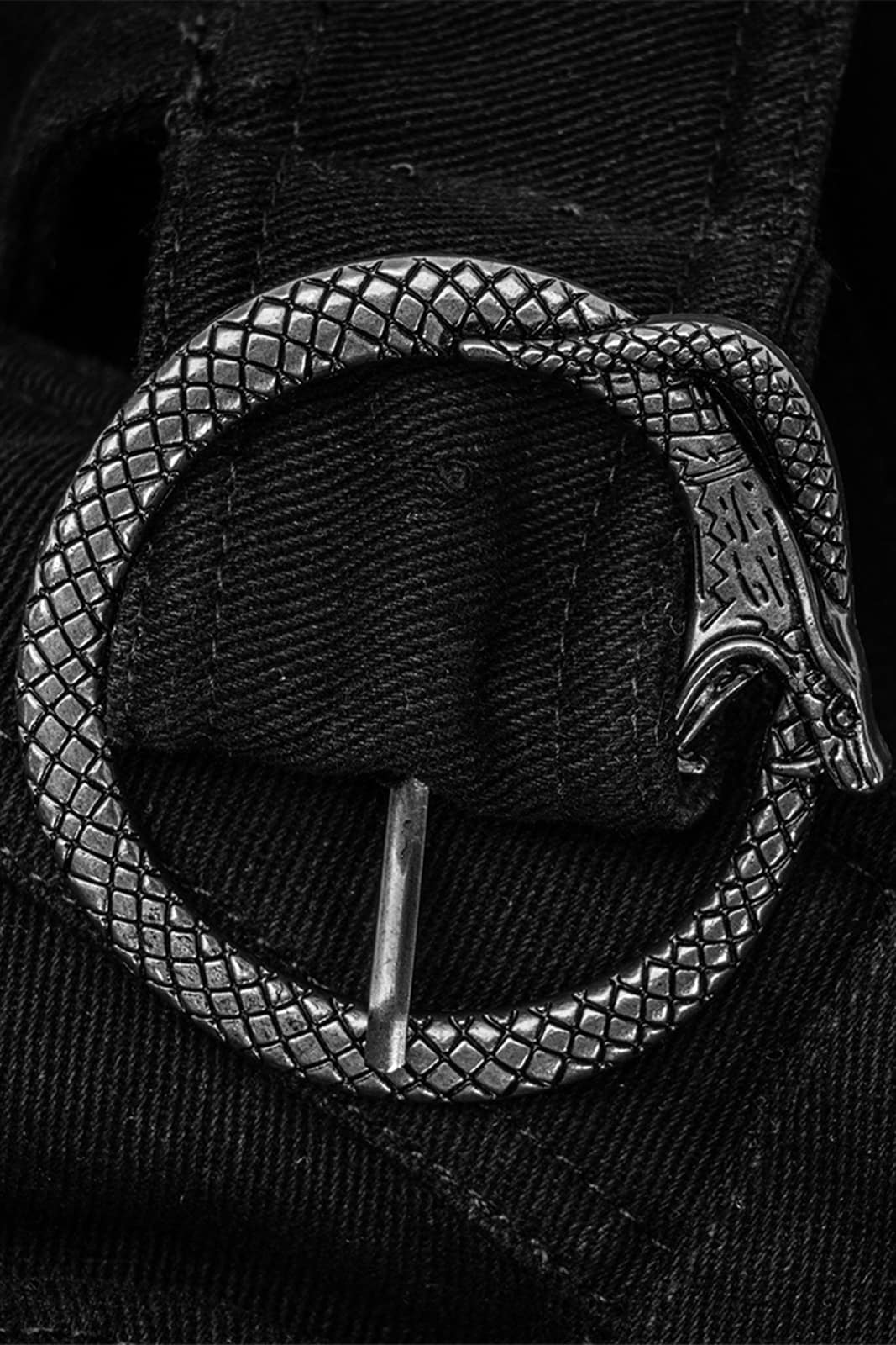 Diese markante Overskirt im Dark-Punk- und Post-Apocalyptic-Stil wirkt wie ein Relikt aus einer gefallenen Ordnung. Die asymmetrische Silhouette, schwere Stoffqualität und industrielle Hardware verleihen dem Design eine rituelle, fast priesterliche Ausstrahlung. Zwei dominante Taillengürtel – einer diagonal mit rechteckiger Schnalle, der andere horizontal mit markanter Ouroboros-Schlangenschnalle – strukturieren den Look und setzen harte Akzente. Dekorative Riemen mit Metallösen, D-Ringe entlang des Saums sowie zusätzliche Ringdetails an den Gürtelschlaufen unterstreichen den funktionalen, modularen Charakter. Praktische Gesäßtaschen runden das Design ab.