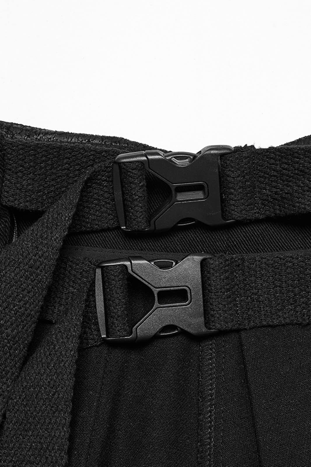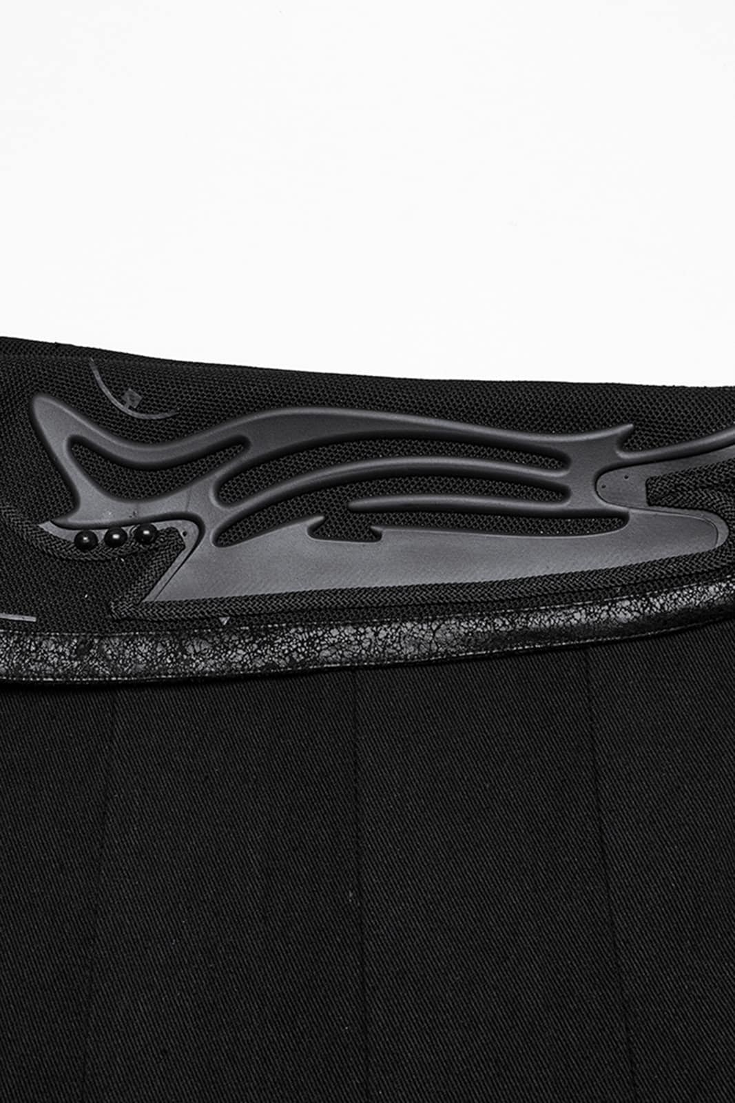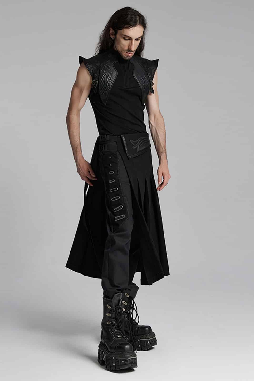 Postapokalyptischer Überrockaus festem Stoff mit offener Seite. Mittels zwei verstellbaren Klick-Schnallen wird der Rock schnell An- und Ausgezogen. Ein besonderes Merkmal ist die mit Kunstleder bestückte Lasche an der Vorder- und Rückseite im Cyberpunk-Stil.