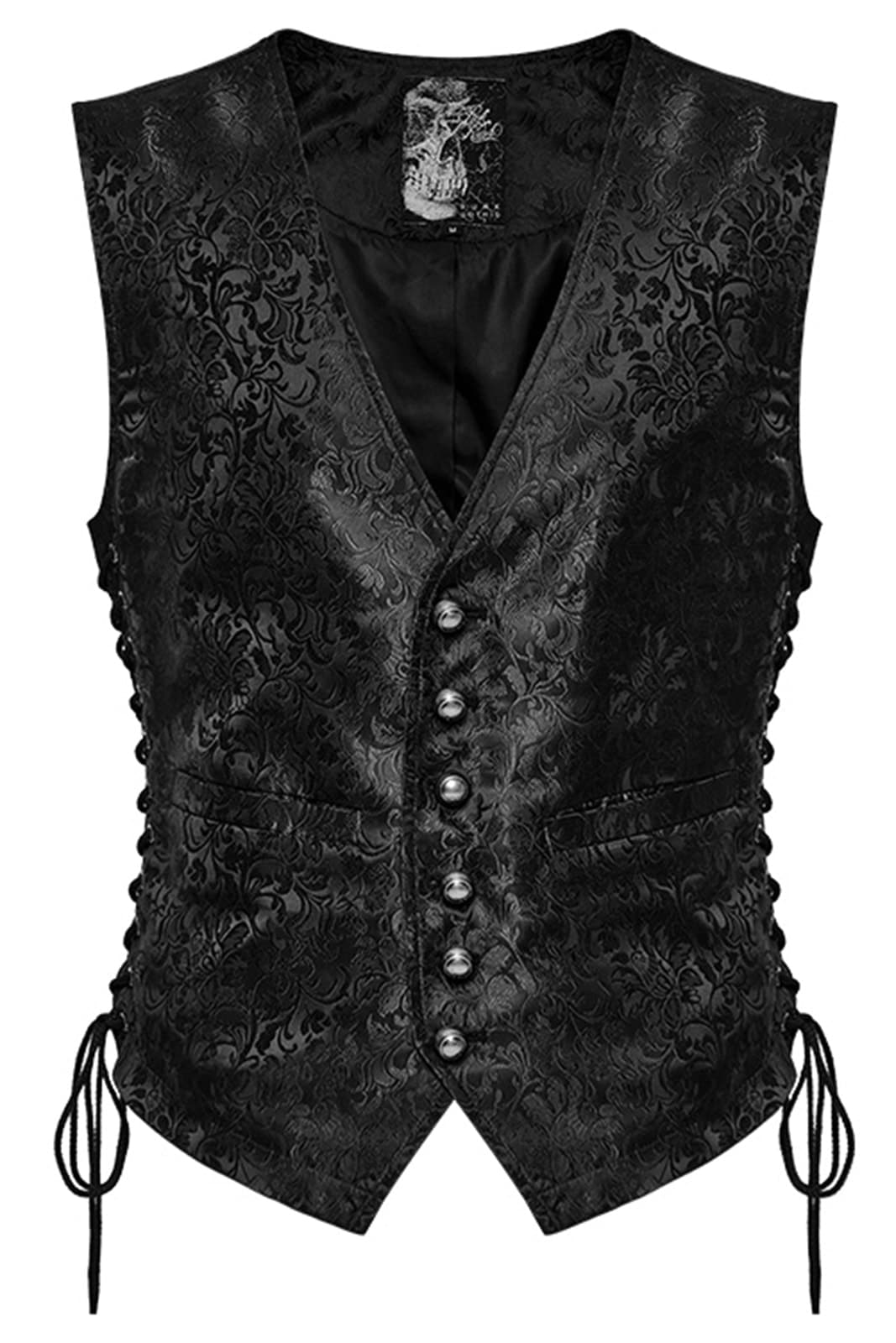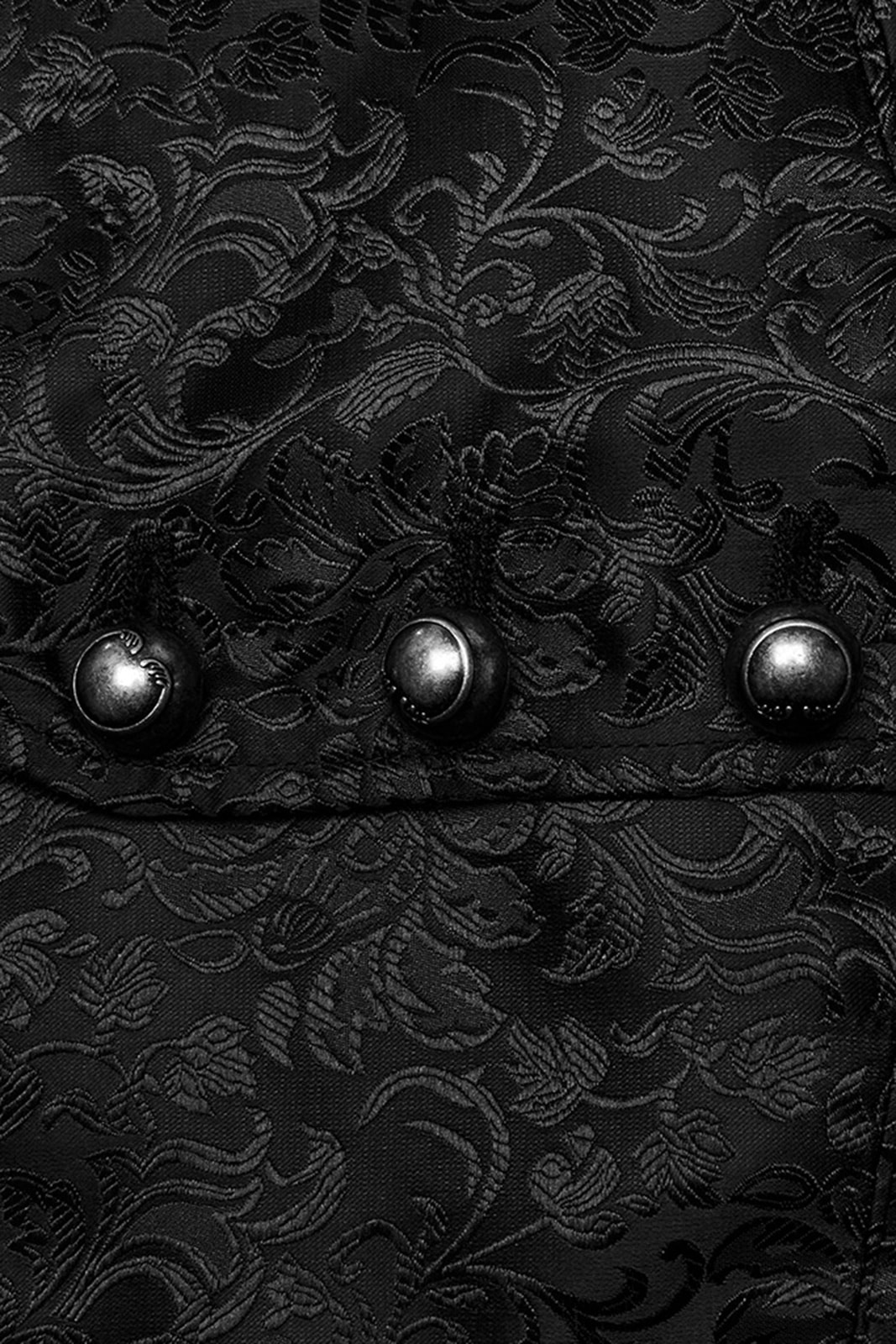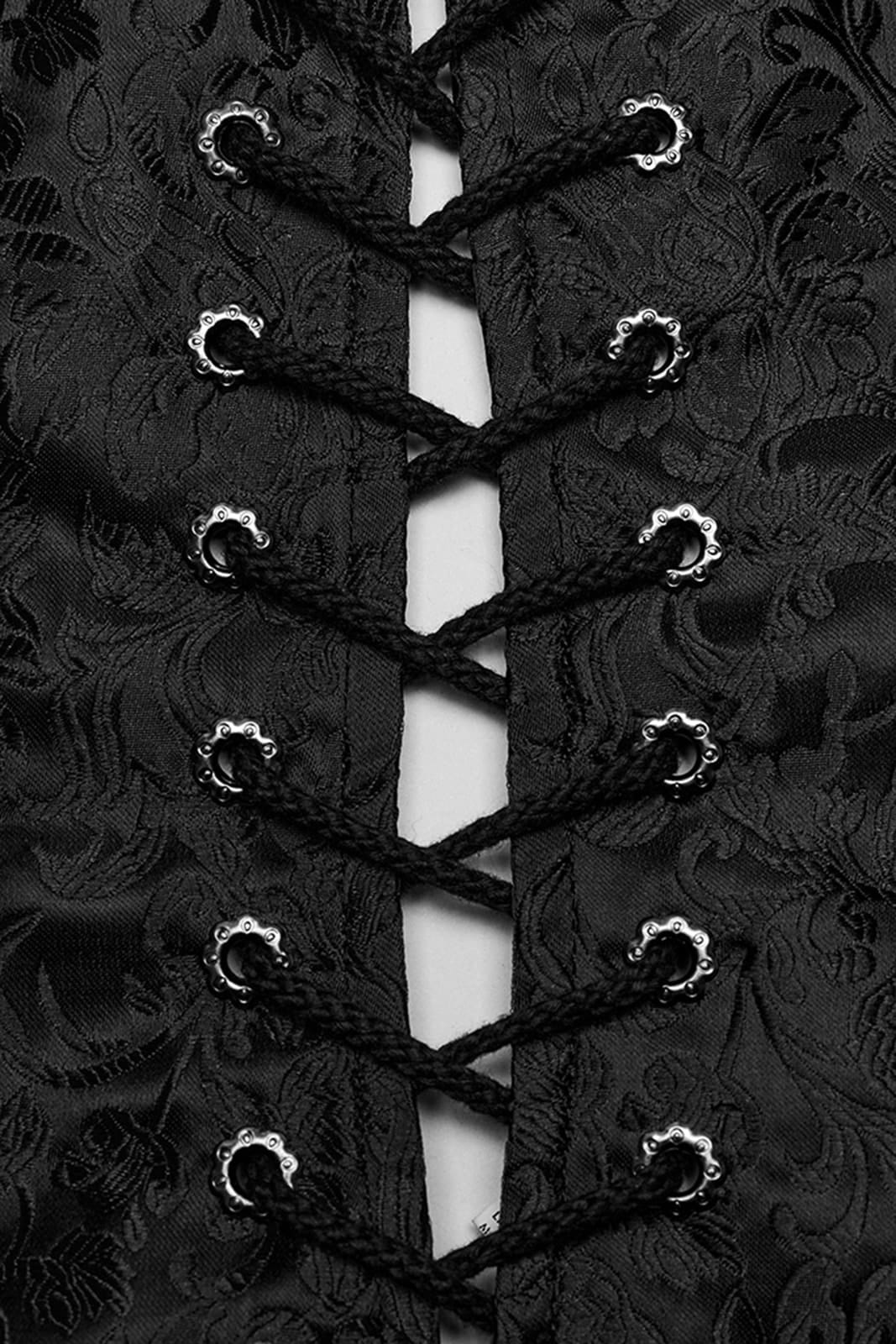 Gothicweste im viktorianischen Stil in klassischem, tailliertem Schnitt, gefertigt aus schwarzem, verziertem Satin-Jacquard-Stoff und mit V-Ausschnitt ohne Revers. Mit Schnürung an den Seiten für eine verstellbare Passform. Die antikisierten Metallknöpfe verliehen einen Vintage- und eleganten Touch.